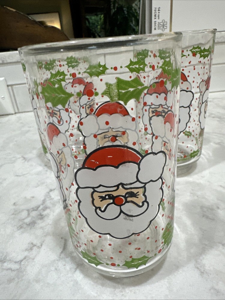 Libbey 70s Christmas Santa With Holly Glassware Set Of Three Vintage