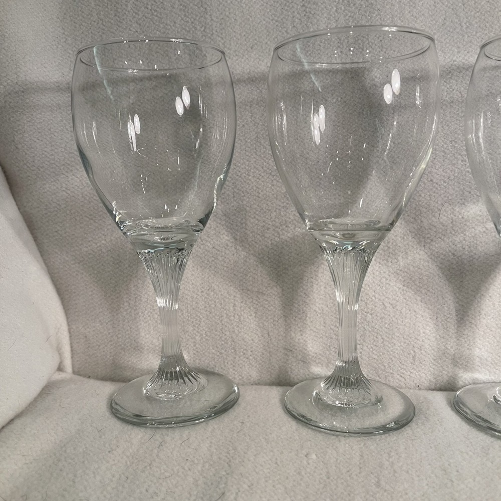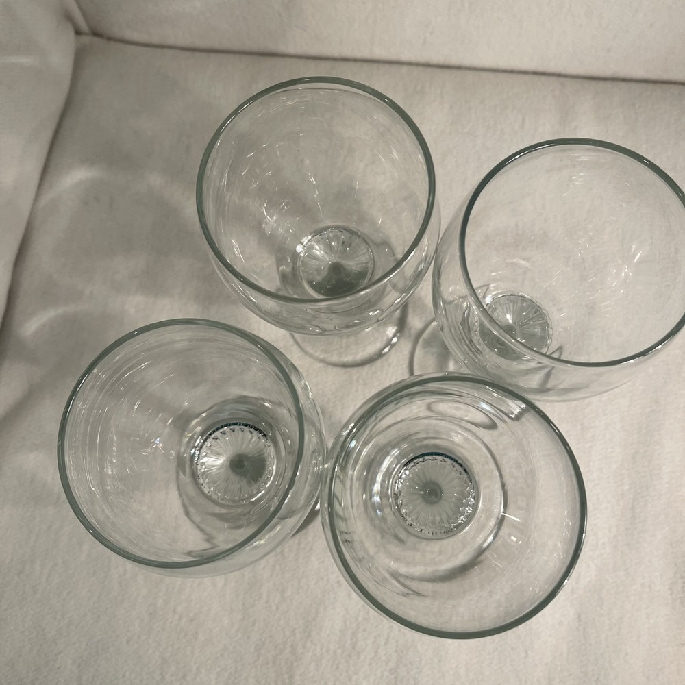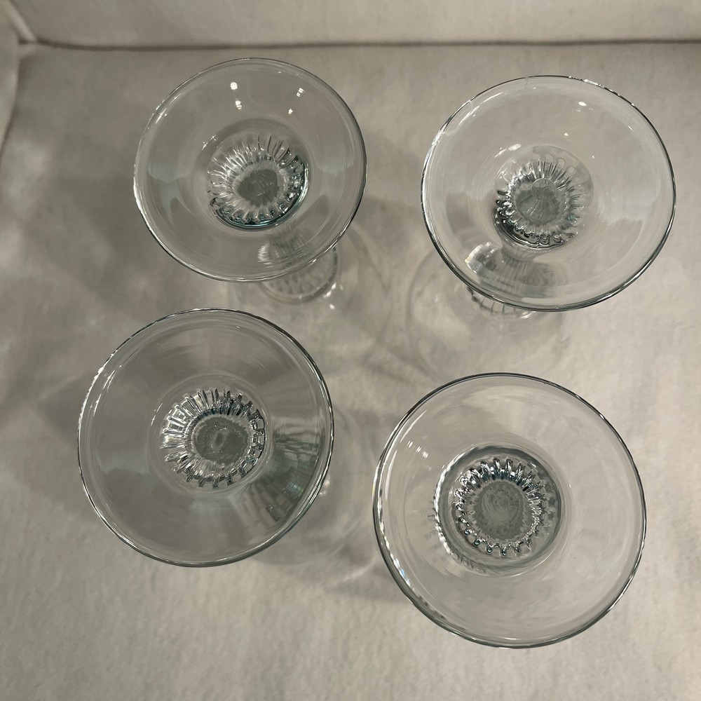 This set includes four-piece Libbey Audrey water goblets made of clear glass with a ribbed stem design. These round goblets have a capacity of 12 oz and measure 3" in diameter and 7.25" in height. They are vintage pieces from the 1970s, featuring a mid-century modern style and elegant hand-blown glass production. Each goblet weighs 3.2 lbs and bears the Libbey brand. Perfect for all occasions, these decorative goblets add a touch of sophistication to any table setting. Excellent condition. No chips or cracks.