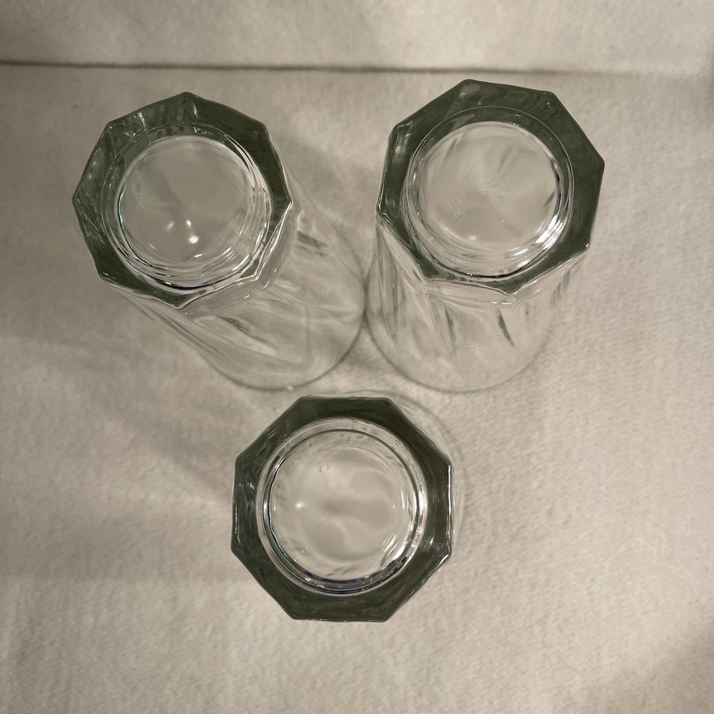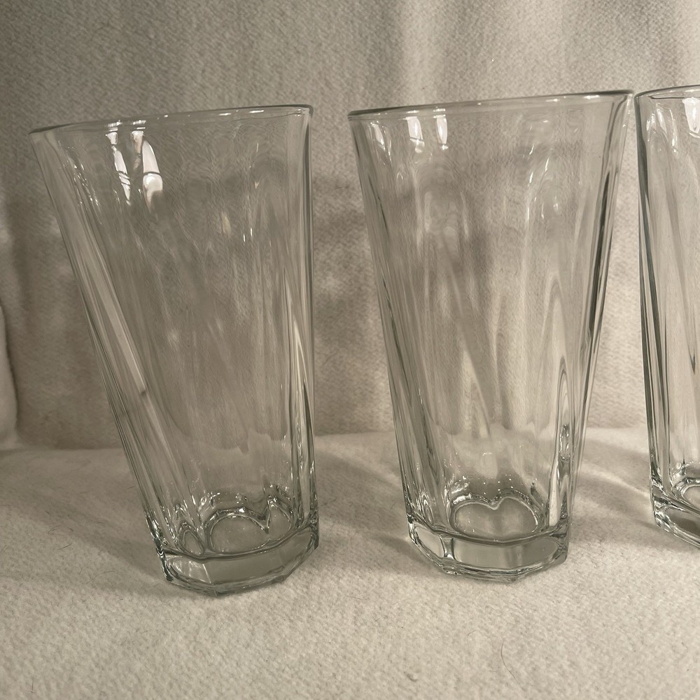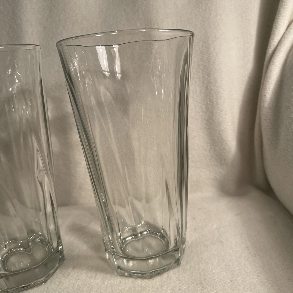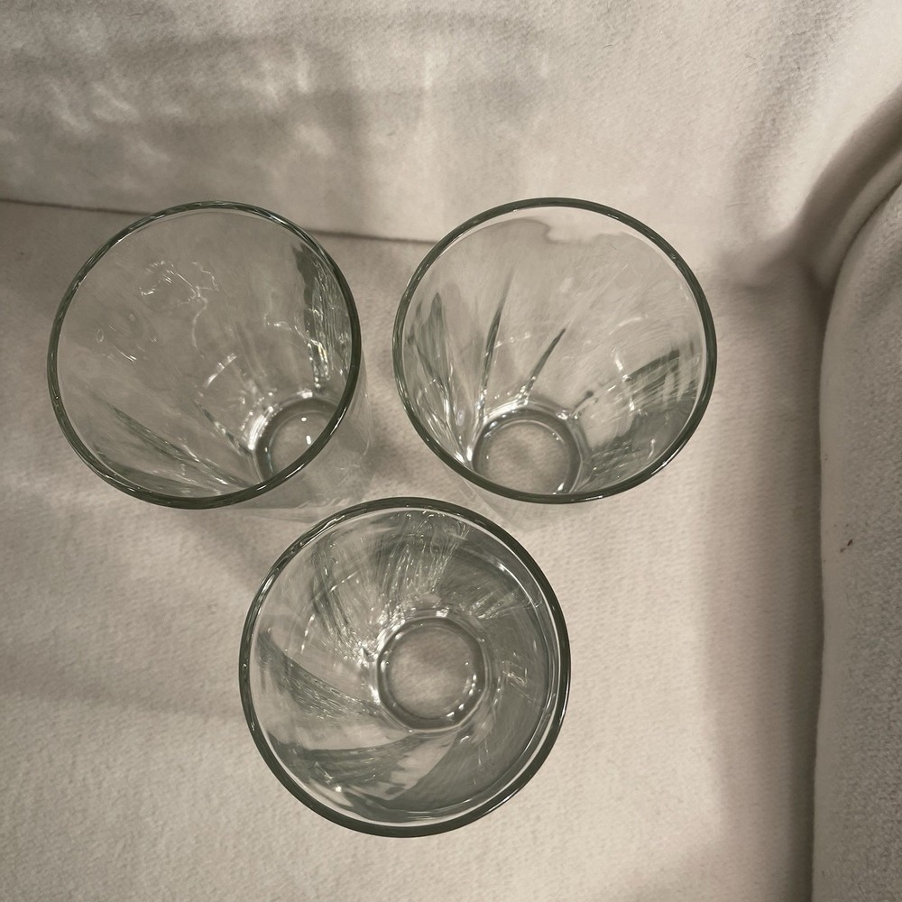 Add a touch of elegance to your drinkware collection with this set of three Libbey Duratuff clear tumbler glasses. The glasses have a beautiful swirl pattern that makes them stand out from the rest. With a capacity of 10 oz, these round glasses are perfect for all occasions. Crafted from pressed glass using fused glass production techniques, these glasses are break and chip resistant and dishwasher safe. The glasses are vintage and were produced in the United States in the 1990s. The set is ideal for contemporary styling and is an original production style. Get your hands on this exquisite set of Libbey Duratuff clear tumbler glasses today! Excellent condition. No chips or cracks.