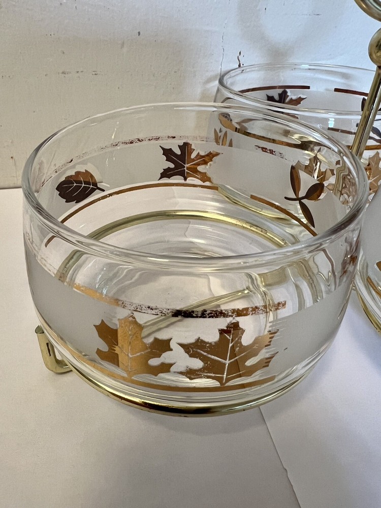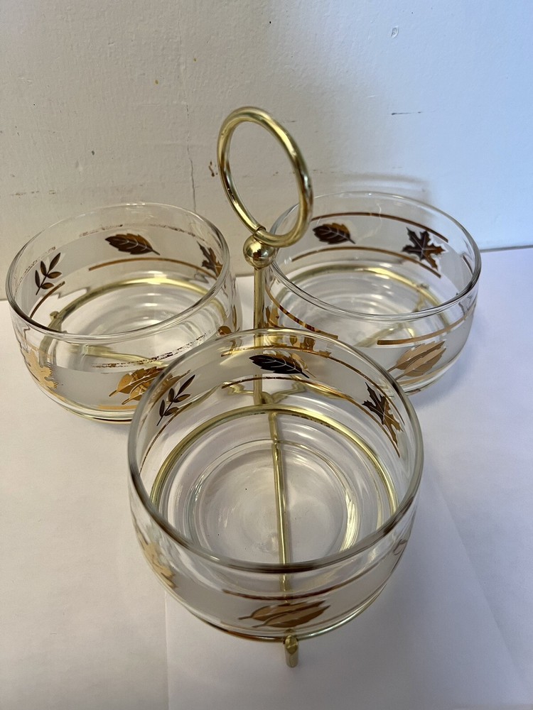Libbey Golden Foliage Leaf Appetizer Condiment Serving Caddy Set 3 Bowls. Good condition set from my 92 year old aunts estate!