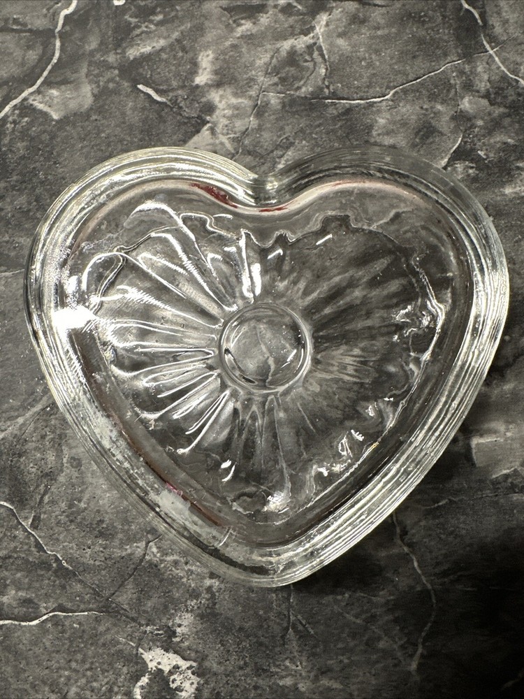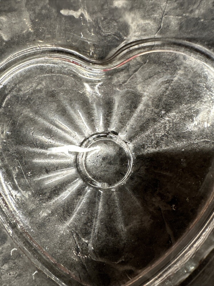This is a vintage heart-shaped bowl/dish from Libbey, made of clear pressed glass. It is a small multi-use dish perfect for candy, trinkets, or nuts. The design features smooth sides, making it a decorative piece suitable for all occasions. This 6" bowl adds a charming touch to any setting with its classic American vintage style from the 1940s-1960s.