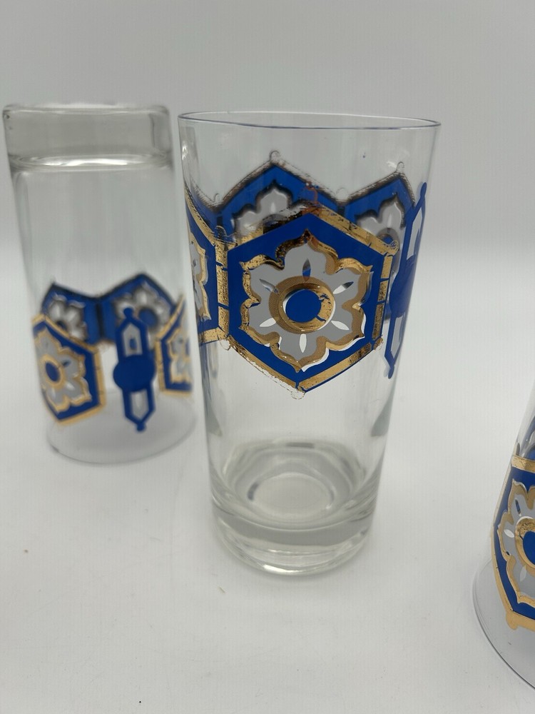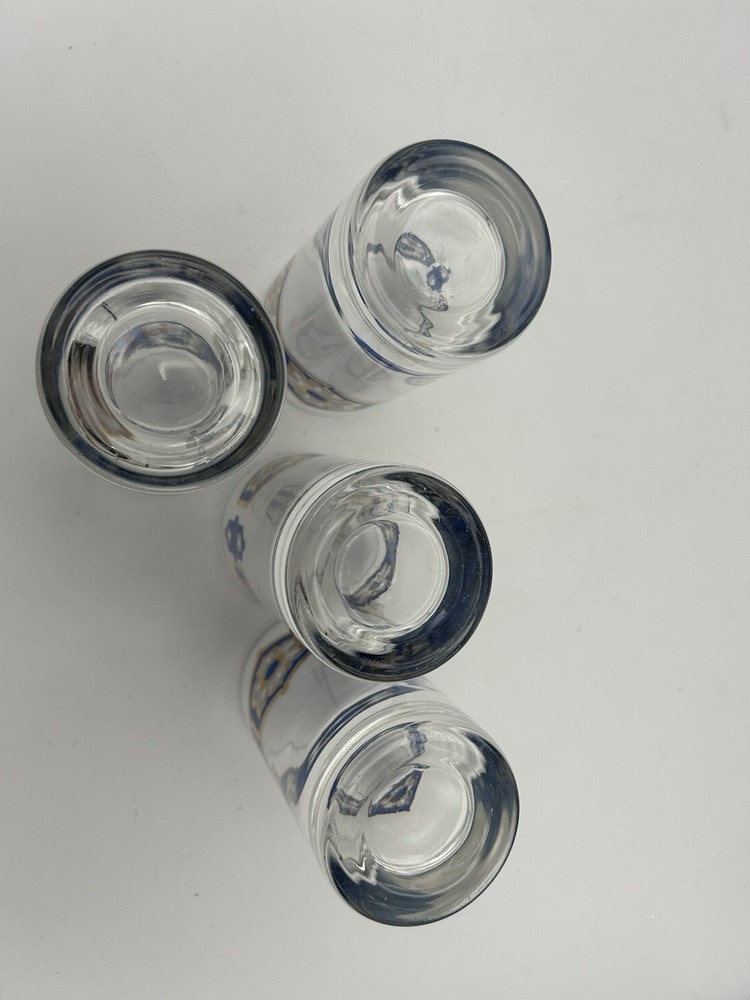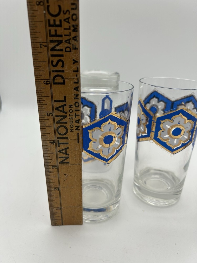 Beautiful Mid-Century set of 4 Stars/Flowers surrounded by a bright blue border then encrusted with a 22-karat border Glasses and patterns are in Glasses are clear, no chips or cracks excellent condition Each glass is 5 1/2" height, 23/4" diameter Set of 4 SKU 513
