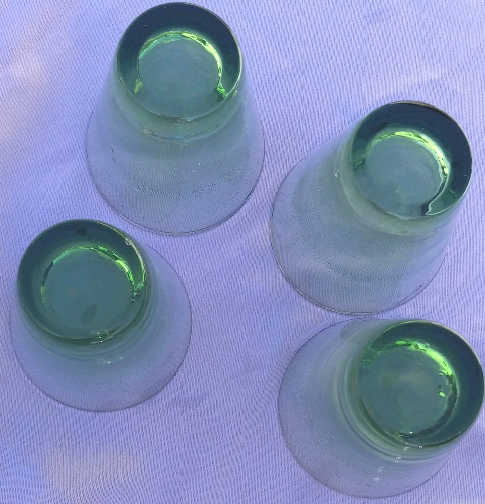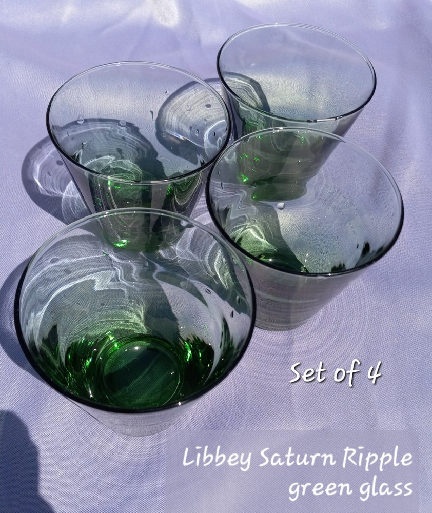 Note you are seeing water droplets on the glasses in some photos. no flaws. Elevate your home bar with the Libbey Saturn Ripple Green Glasses, a set of 4 cocktail glasses that merge vintage charm with modern functionality. Each glass boasts a stunning green hue complemented by the distinctive Saturn Optic pattern, making them a unique addition to any glassware collection. With a 6 oz capacity, these glasses are perfect for serving a variety of cocktails or cordials or your favorite. Made in the United States, these glasses are a true representation of Mid-Century Modern style, adding a touch of elegance and sophistication.