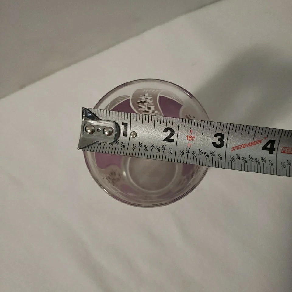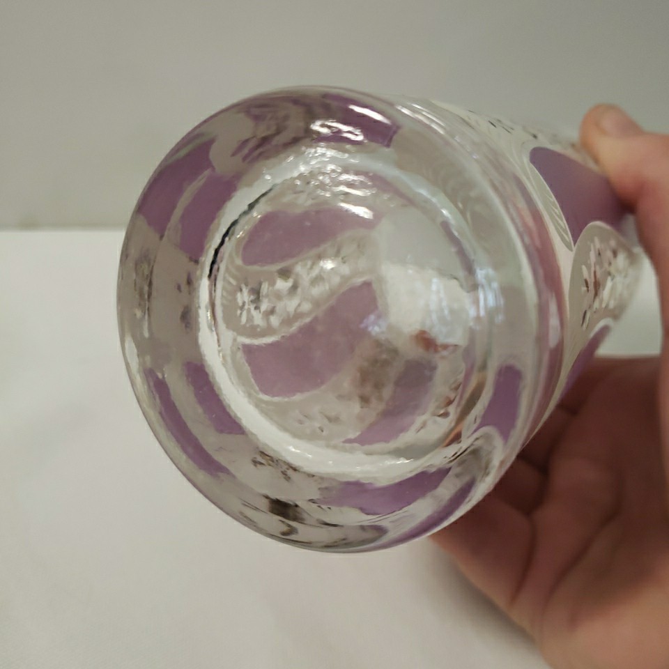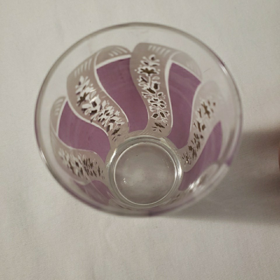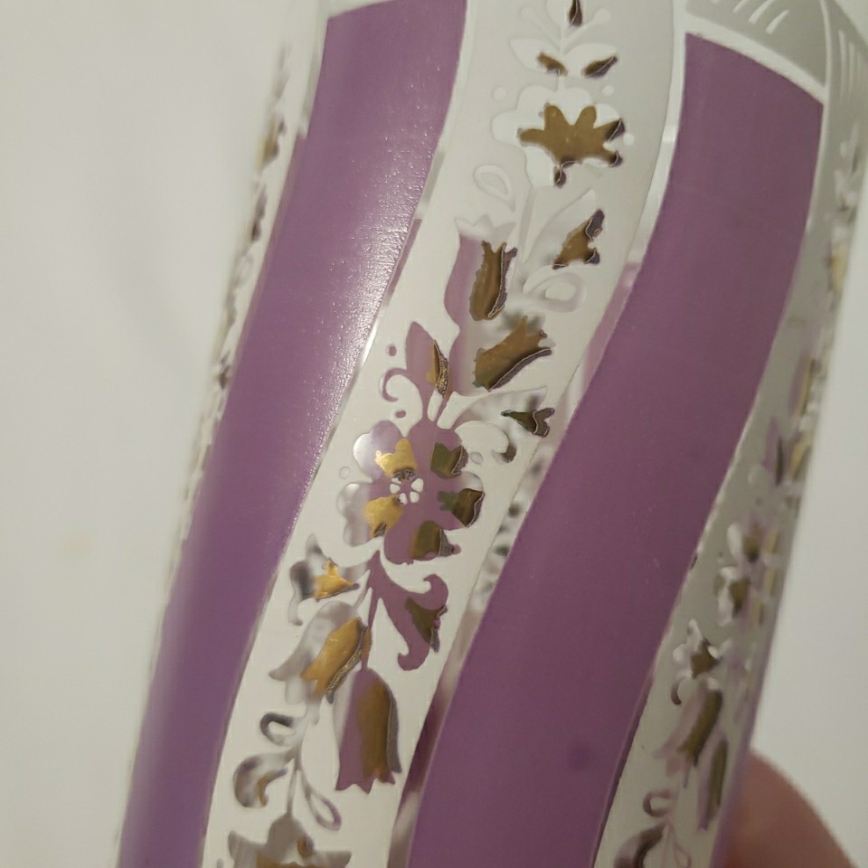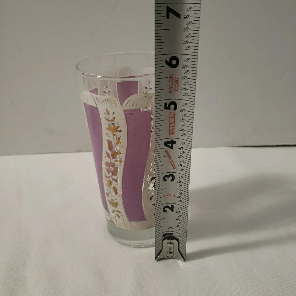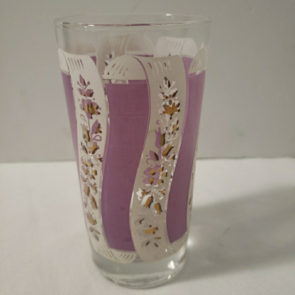 The product is a set of three Lilac Frosted Gold Floral Vintage Highball Tumblers by Libbey. These 12 oz. glassware items feature a beautiful floral pattern in a purple color, with a frosted exterior and accents of gold. Perfect for serving cocktails or other beverages, these tumblers add a touch of elegance to any home bar or dining table. Made of quality glass, this set of vintage-inspired tumblers is sure to be a stylish and functional addition to your kitchen or dining space.