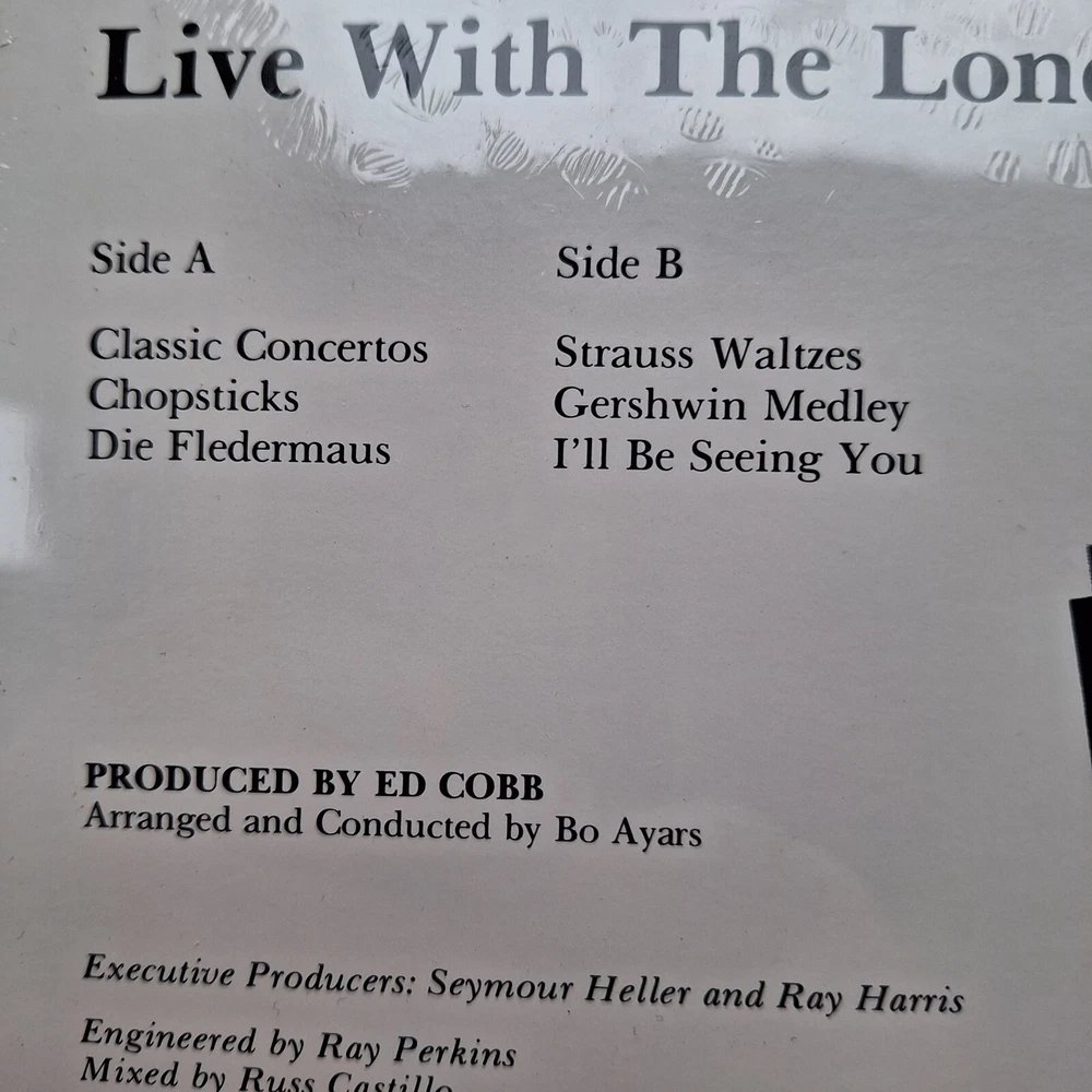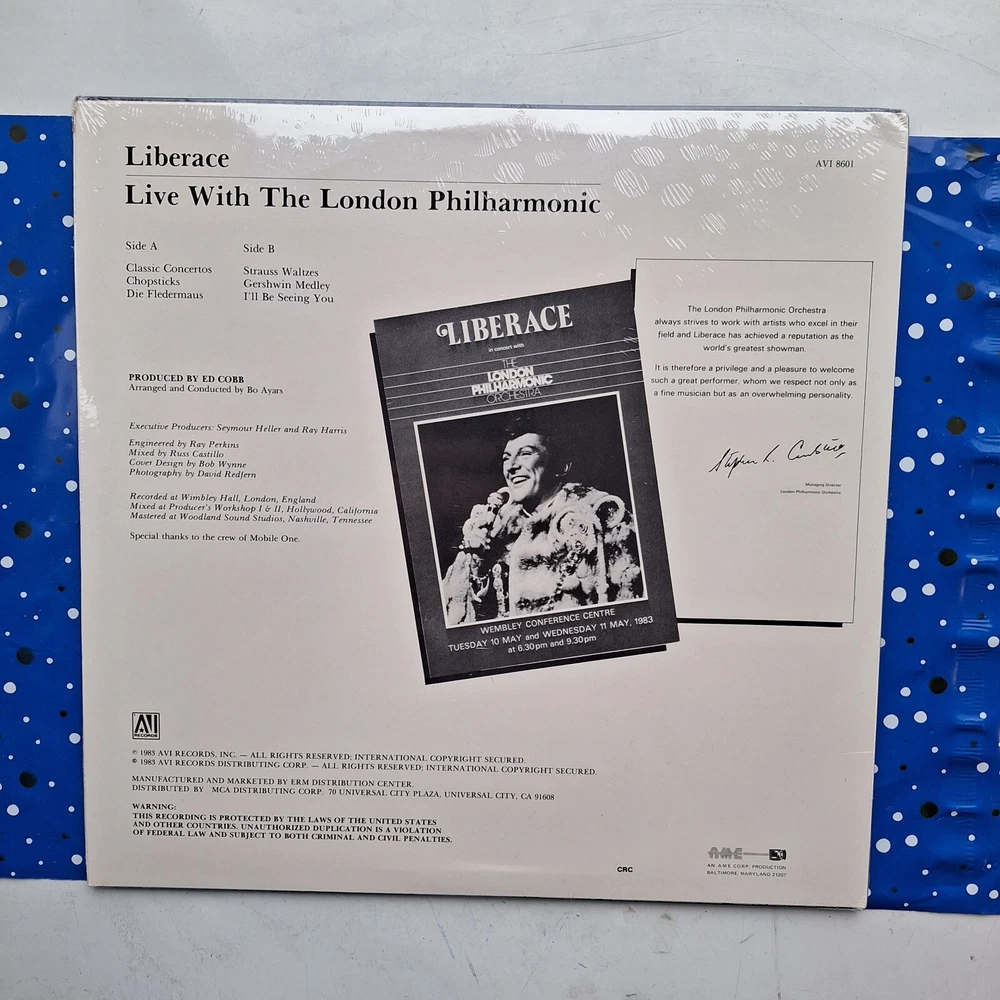 Be mesmerized as you listen to the legendary Liberace performing live with the London Philharmonic Orchestra in this rare LP vinyl record. This masterpiece features 33 RPM speed and is contained in a cardboard sleeve, making it easy to store and protect. The vinyl is in mint condition, with no scratches or damages, and the sleeve is graded as near mint. The record size is 12 inches, and the edition is a live performance. This timeless piece is perfect for collectors and music enthusiasts alike. Get your hands on this sealed copy of Liberace Live With The London Philharmonic Orchestra released in 1983 by AVI and experience the magic of music.