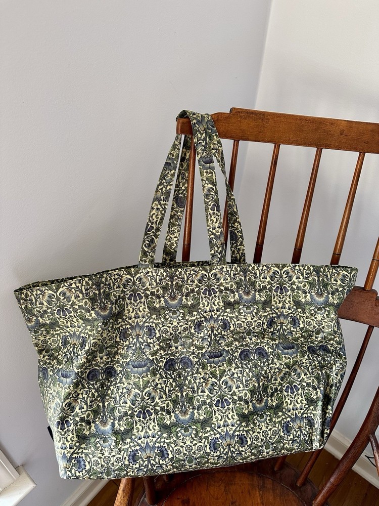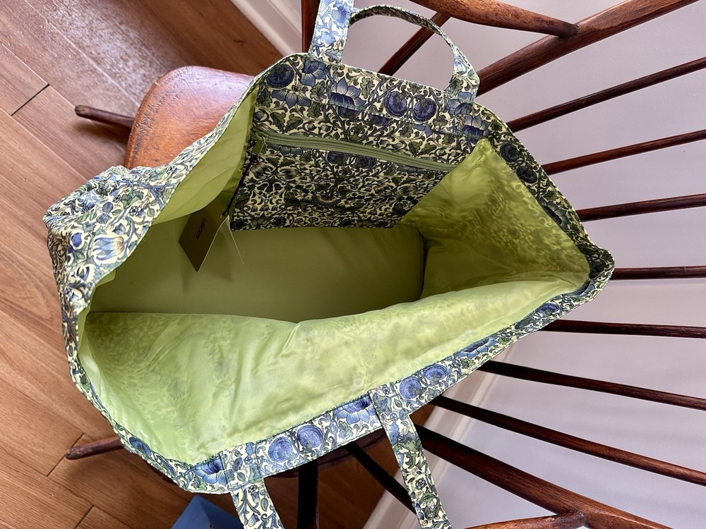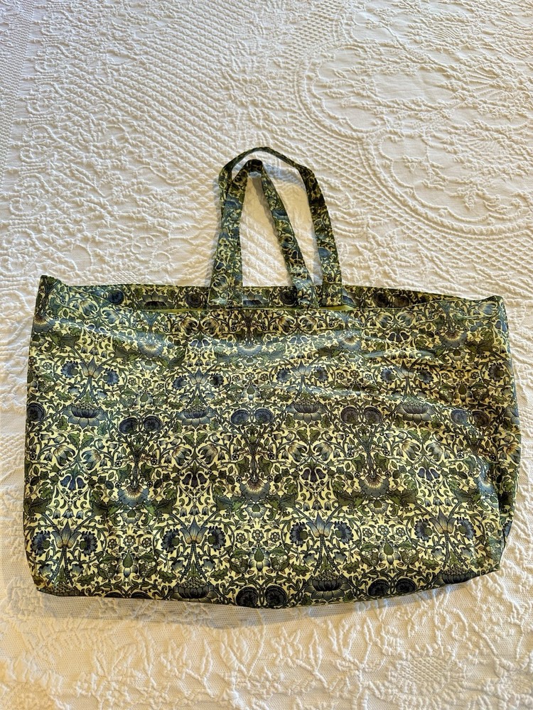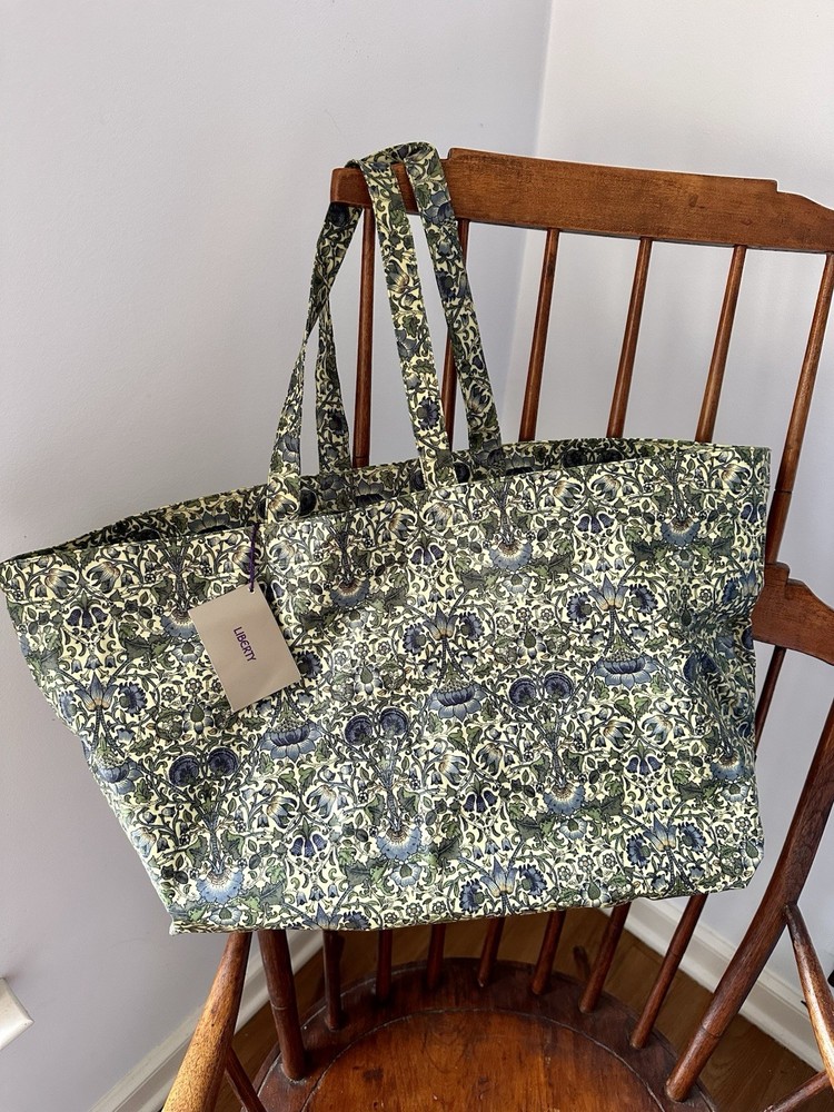 The Liberty of London Floral Tote Bag is a stylish and practical accessory. Made from durable cotton, this rectangular tote features a beautiful floral pattern in a dark green color. With double handles and a coated finish, this bag is perfect for everyday use. This bag is a charming choice for those who appreciate high-quality craftsmanship and timeless style. Bag has a couple very small marks on the inside.