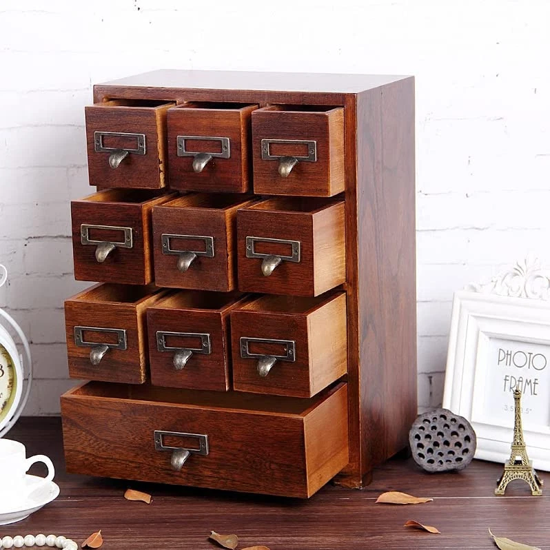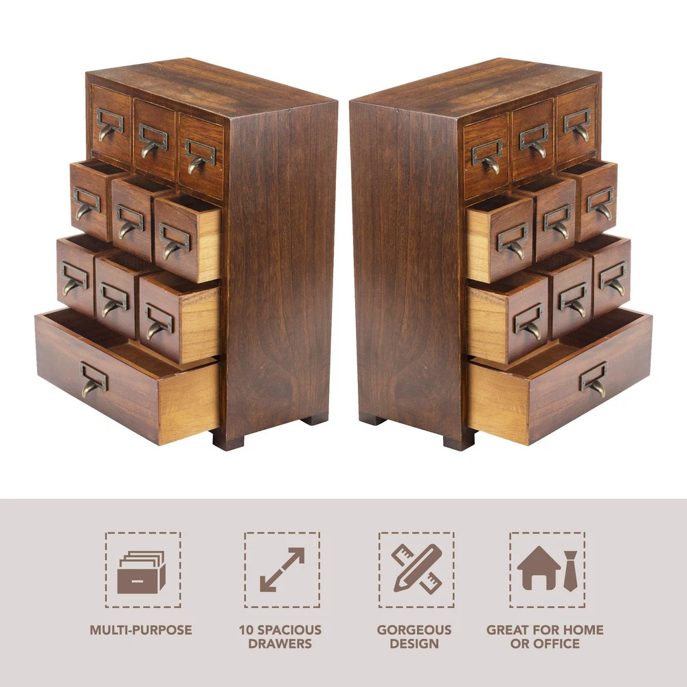 FULLY ASSEMBLED - DRAWER SIZE - 27.5 cm width x 38 cm height x 14.5 cm thick (10.8" x 15" x 5.7") SMALL CABINET SIZE - 13 cm x 7.5 cm x 7.5 cm LARGE CABINET SIZE - 13 cm x 25 cm x 7.5 cm INSTALLATION FREE - MULTI-PURPOSE – Great for organizing various items like medicine, jewelry, crafts, makeup, oils, office items, tea bags, tea, coffee gear 10 SPACIOUS DRAWERS – The top 9 drawers are small, but you can keep various items in it. The larger one at the bottom is bigger and is great for additional storage. GORGEOUS DESIGN – Multi-layered. Made of natural wood. Beautiful, elegant, and classy. Not heavy on desktop, counters or dressers GREAT FOR HOME OR OFFICE – When you need to keep things clean, organized, and tidy in your home or office, this drawer will do the trick.