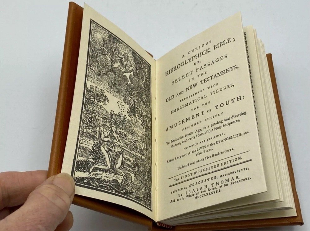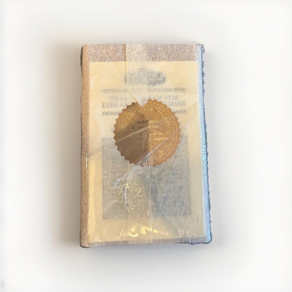 Never opened, still in original plastic sealing, and kept in storage since purchase! This book is in perfect condition. Please note that the wrapping paper, gold seal sticker and plastic are slightly torn as shown, but this has not affected the book. The book measures 5 1/2" H x 3.5" W. It includes a collector's informational booklet. Please note that this book has NEVER been removed from its original wrapping. It remains fully sealed in its original plastic as shown in the later photos. The first photos are professional pictures of an identical opened version that I only included to show what the book looks like. This rare, leatherbound, gilt-imprinted hardcover book is an authorized replica from the Treasures of the Library of Congress collection. It is a reproduction of the rare "A Curious Hieroglyphick Bible," printed in 1788 by Isaiah Thomas in nearby Worcester, Massachusetts. Only a few original copies of this book remain. This book was the first American version of a novelty Bible that replaced some words with pictures to pique children’s interest and support their reading comprehension. With nearly five hundred woodcuts by American artists, this Bible was also the most ambitious woodcut volume produced in America up to that time. A Curious Hieroglyphick Bible is one of more than a hundred children’s book titles published by Isaiah Thomas (1749-1831). A preeminent early American printer and pioneer publisher of children’s literature, Thomas began his apprenticeship as a young boy in Boston, working under Zechariah Fowle. Over the course of a long career, Thomas published more than four hundred titles in many editions, for adults as well as for children, including the first dictionary printed in America. Also a bookseller, he eventually owned more than twenty bookstores in several states. His most enduring legacy, however, is the American Antiquarian Society (AAS), which he established in Worcester in 1812, serving as its president until his death. Thomas willed his considerable library to the AAS. From his original 8,000-item collection, the Society’s library has grown to include copies of two-thirds of everything printed in the United States through 1821. It remains one of the most complete collections of early American printed works in existence. Check out my other listings for more signed, first edition, and other rare collector's books! I combine shipping on multiple purchases.