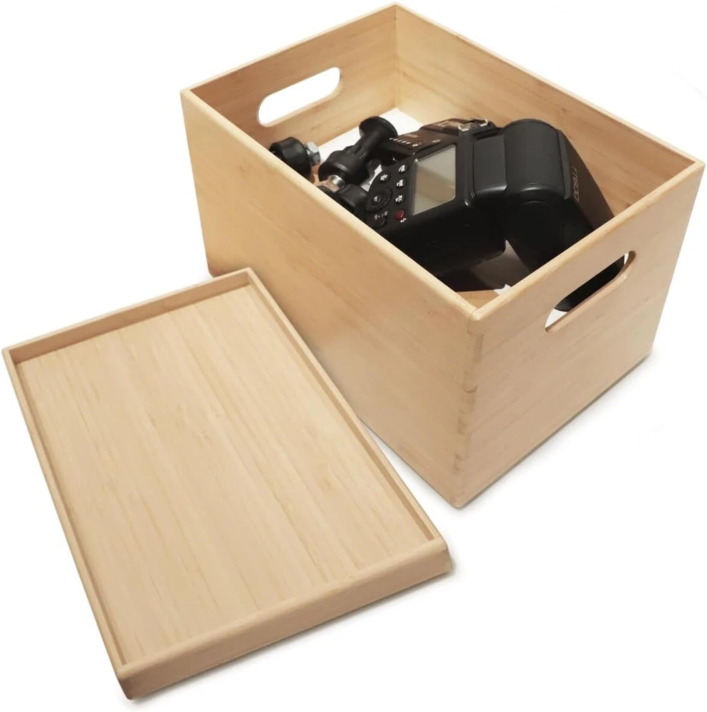 About this item BAMBOO STORAGE BIN WITH LID: Made of 100% natural bamboo and equipped with a lid, it makes storage neater. SIZE: 14.6” L x 10.2” W x 9.6” H + lid 0.79” H. STACKABLE STORAGE BOX: There is a raised edge at the bottom, which allows the two boxes to be securely fastened together when stacked. STURDY AND AESTHETICALLY PLEASING: Our sturdy and stylish bamboo storage bin is perfect for organizing and carrying all your items. Cube design with handle holes. STORAGE MADE SIMPLE: is a versatile organizer, it can keep your kitchen and bedroom in order, and is also suitable for your office shelves. It can store kitchen utensils, cutlery, toys, books, and more well. EASY CARE: Wash with mild soap and water, then wipe with a soft and clean damp cloth. To prevent natural bamboo from getting moldy, please keep it thoroughly dry.