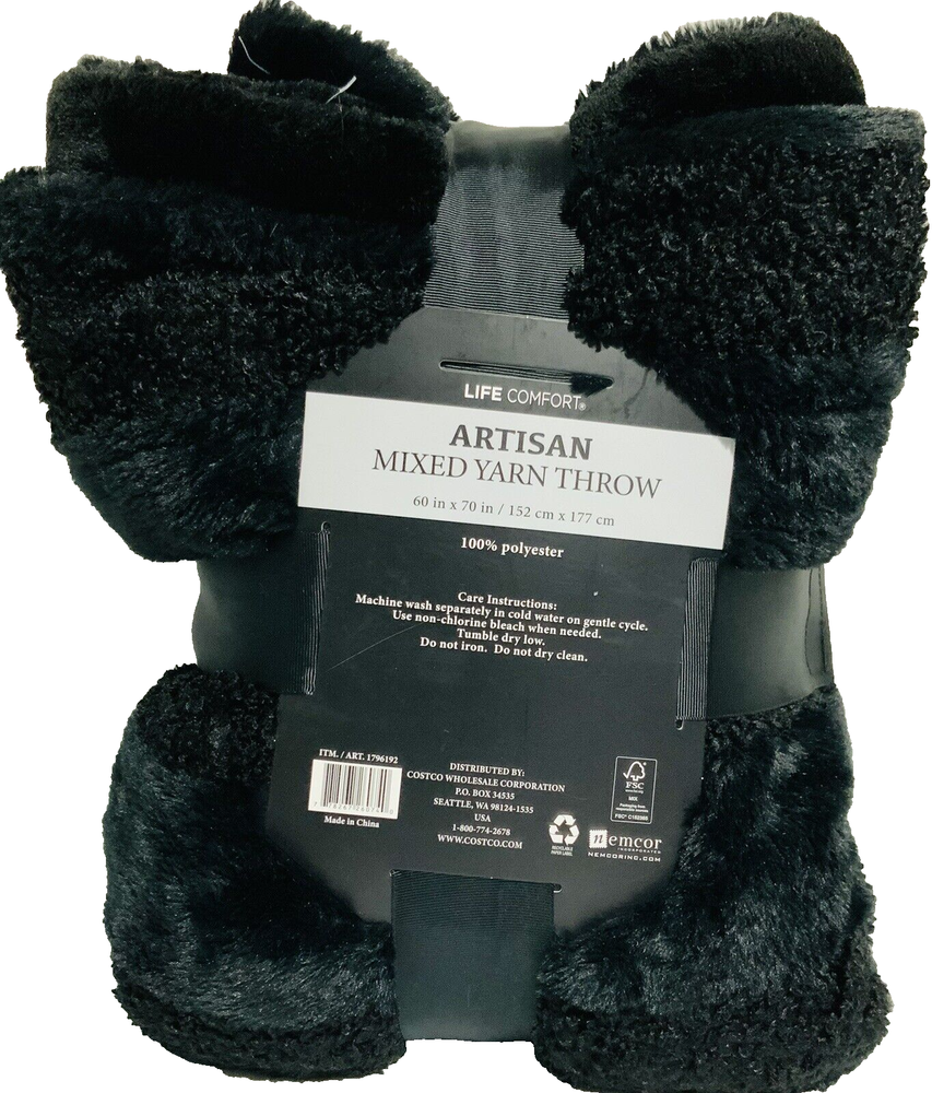 Life Comfort Artisan Mixed Yarn Throw 60" X 70" Luxury Black. Condition is New open box . free shipping Wrap yourself in the ultimate coziness with the Life Comfort Artisan Mixed Yarn Throw. This luxurious black blanket, featuring a rich faux fur texture, provides unparalleled warmth and comfort. Perfectly sized at 60 inches by 70 inches, it's an ideal companion for chilly evenings or a relaxing weekend morning. Crafted with an eye for modern style, this solid color throw fits seamlessly into any bedroom decor. It's not only machine washable for easy care but also designed for durability and longevity. Enjoy the simple elegance and plush feel of this elegant, rectangular blanket that promises to be a timeless addition to your home.