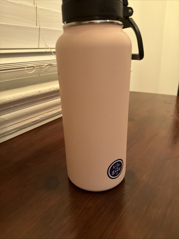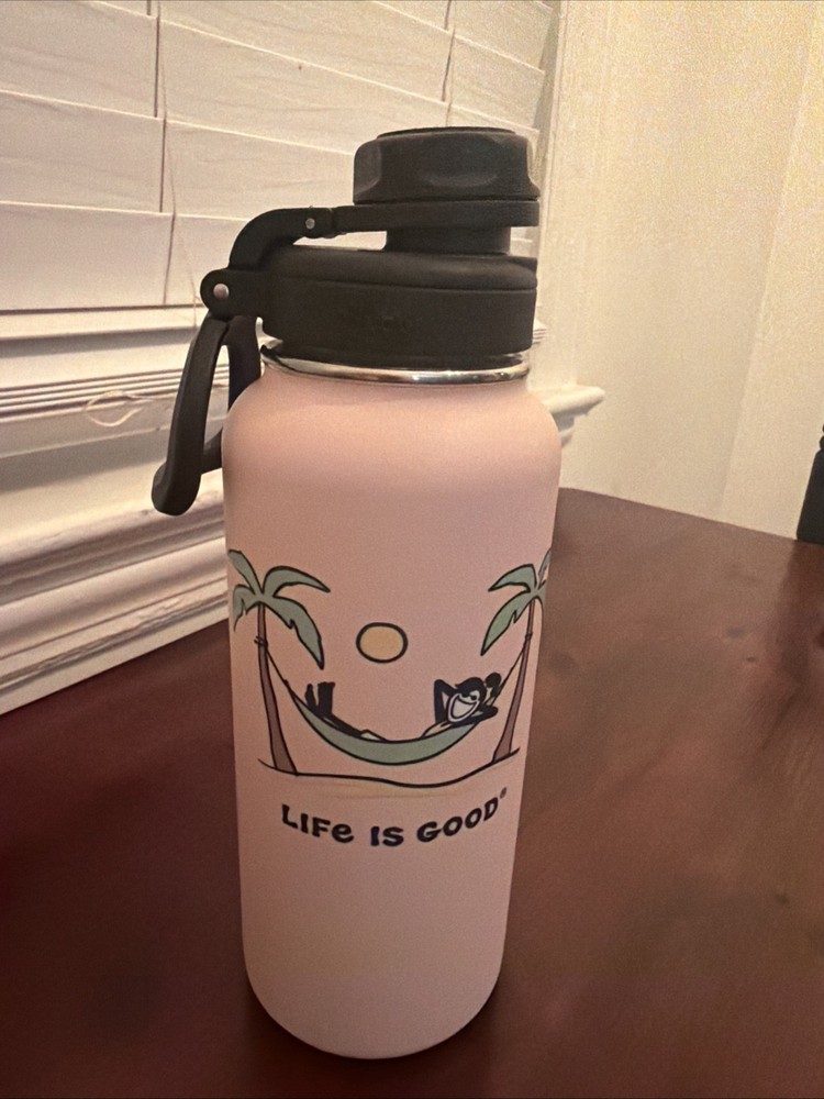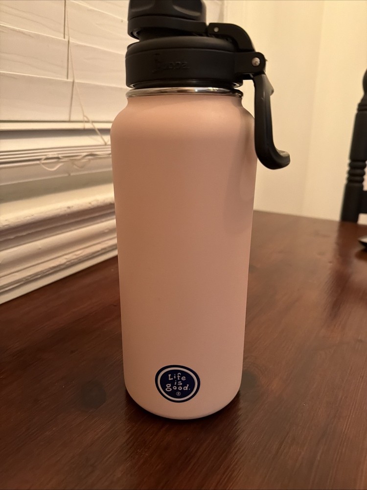The Life Is Good Stainless Steel Thermos Water Bottle is a stylish and durable water bottle perfect for outdoor activities like camping and hiking. With a volume of 32 fl oz, this pink bottle is made of stainless steel, ensuring it will keep your drinks cool for longer periods. The bottle also features a camping-themed design from the Life Is Good brand, making it a fun and practical choice for staying hydrated on the go.