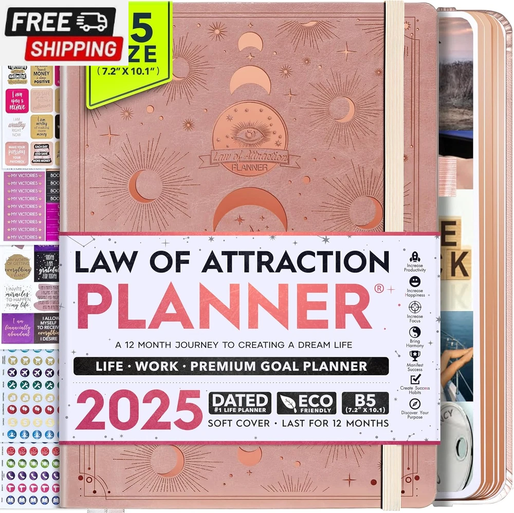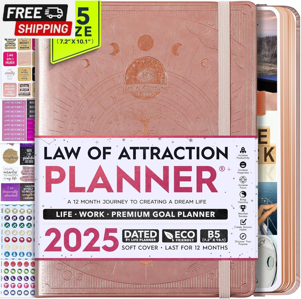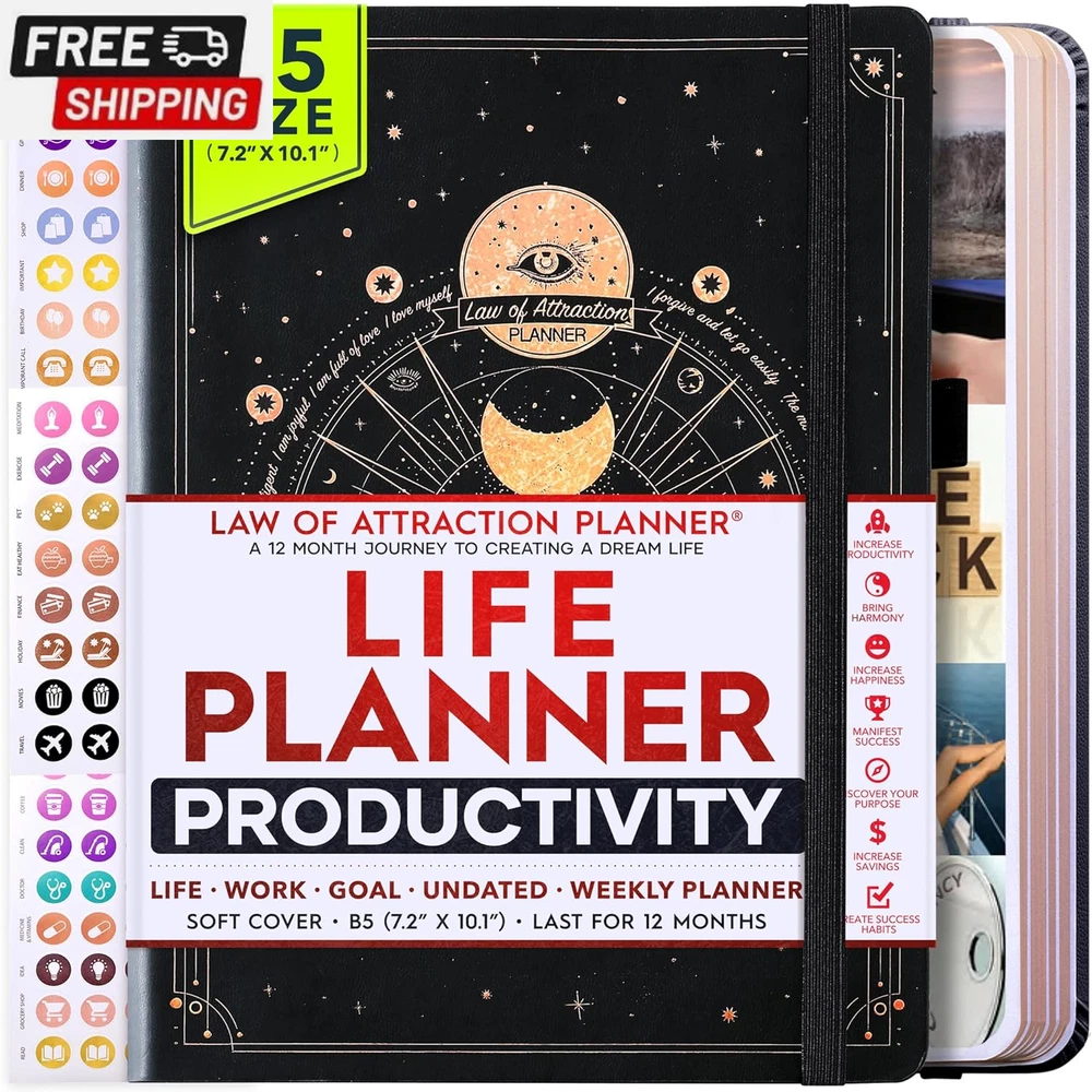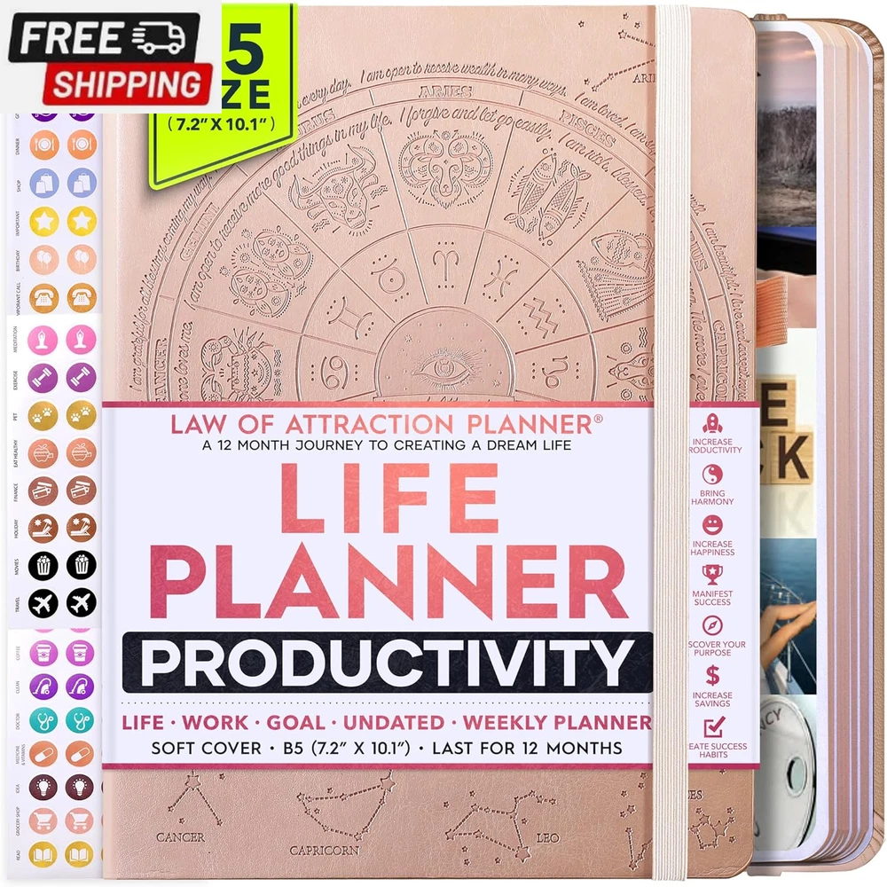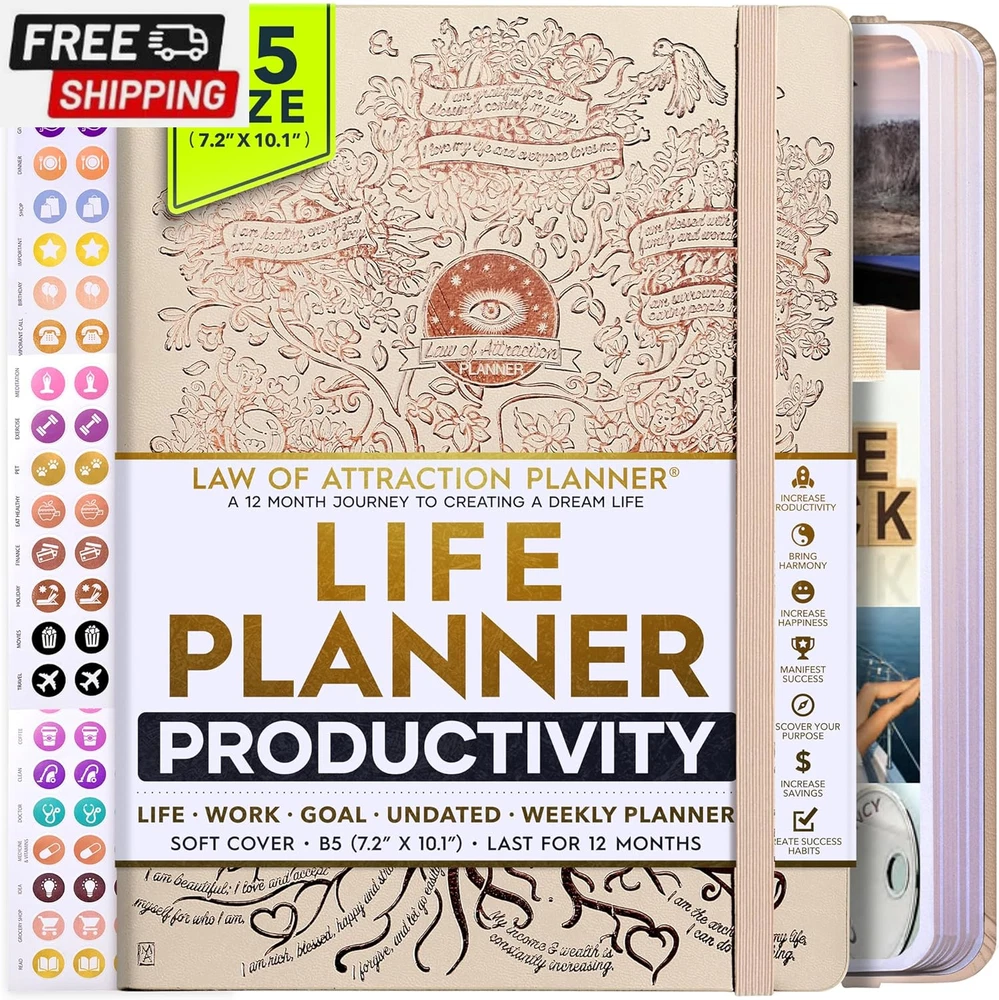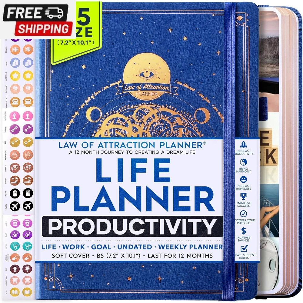 Life Planner - Undated Deluxe Weekly and Monthly Planner, a 12 Month Journey to Increase Productivity, Happiness & Enhance Organization | Life Organizer, Gratitude Journal, Agenda Planner, to Do List, Gift Box & Stickers - Start Anytime UNDATED PLANNER - All the success tools you need to create the life you always wanted. Sunday start pages, B5 Size (7.2 x 10.1 inches), thick paper 100 gsm, 248 pages of life transformation, 52 weekly, 12 monthly planning overviews & reflection, 30 dotted journal pages, up to 295 productivity stickers, habit trackers, mind maps, out foldable vision board, morning, evening routines. This life planner is UNDATED daily planner, undated weekly planner and undated monthly planner giving you the freedom to start your journey whenever suits you best. INCREASE PRODUCTIVITY AND HAPPINESS - This is a deluxe life goal planner showing you how to become the best possible version of yourself on a mental, physical & interpersonal level using the law of attraction vibration guide. This planner is a daily planner, monthly planner, weekly planner, productivity planner, goal planner, business planner, to do list planner, planner notebook & gratitude journal all-in-one. ACHIEVE YOUR GOALS USING THE LAW OF ATTRACTION - Learn how to set big goals, be happy and manage your time well, and follow the same methods millionaires around the world use to set goals and achieve them. This monthly planner undated planner, life planner, hourly planner, yearly planner, work planner, schedule planner or appointment book. It's a perfect planner for women and men. REDUCE OVERWHELM, STRESS AND FIX PROCRASTINATION - Follow a unique 8 step system that will help you bring back harmony, clarity, and peace in your life while achieving your goals. This planner is perfect for birthday gift, mother's day, anniversary gifts, and christmas gifts. LUXURIOUS & TOP QUALITY- Ideal for both women and men, perfect for entrepreneurs, professionals, college students, and everyone who has a burning desire to turn dreams into reality. No questions asked money-back guarantee. Product Description UNDATED DAILY PLANNER READY TO CREATE THE LIFE YOU ALWAYS WANTED WITH THE BEST LIFE PLANNER ON THE MARKET? The ONLY Law of Attraction Planner 2025 comes with Udated Daily Planner options that helps you find your Purpose, Eliminate Procrastination, Anxiety, Overwhelm and Stress by Guiding you Through 8 Simple Steps To Maximize your Productivity, Increase Creativity and Passion for Crushing Your Goals! The Law of Attraction Planner is a Life planner - A Manifestation Journal aids you in manifesting your desires through the practice of keeping a Manifesting Journal - a Time Management Planner - a Self Care Journal - a Vision Board Journal - a Life Coach - Work Planner, Agenda and Personalised Organiser , All in one. It combines the manifesting abilities and spiritual guidance from the law of attraction that also includes all the tools to achieve your short and long-term goals like principles of wealth building, and self-motivation all integrated into a daily schedule planner. Experience the transformative power of a 3-minute Positivity Journal and Planner, designed to create a manifesto effect from day 1! The Law of Attraction Planner contains 248 life-changing pages with 45 journal pages, habit trackers, mind maps, out foldable vision board, morning & evening routines. It also has a pen loop and 2 bookmarks. THE LAW OF ATTRACTION PLANNER WILL BE YOUR SECRET "UNFAIR ADVANTAGE" 2025 Hourly Planner , THERE’S A SMARTER WAY TO PLAN YOUR BEST YEAR! A LIFE THAT’S WORTH IT, IS WORTH PLANNING Once you start using the law of attraction's unique 8-step process you will understand how high achievers can accomplish so much more success in the same amount of time everyone else has. The 8-Step Law of Attraction Roadmap guides you to improve in all areas of your life from your career, family, health, fun activities, habits, emotional, relationships, spiritual, and life goals. As you continue using the law of attraction planner you will forget Incomplete, LOW-QUALITY Planners That ARE MISSING IMPORTANT STEPS AND Will Never Lead you To True Success! The Law of attraction Planner includes special tools to help you achieve your short and long term goals and to help you find your passion and purpose in life. This is the only Planner with the key self-development processes found inexpensive personal development books and life coaching courses that have been divided into 8 steps for radical life transformation. Let’s take a look at the 8-steps inside the Freedom Mastery’s Deluxe Law of Attraction Planner that similarly priced but lower quality planners lack. The 8-Step Law of Attraction Roadmap guides you to improve in all areas of your life from your career, family, health, fun activities, habits, emotional, relationships, spiritual and life goals. Life planner - a Manifesting Journal - a Time Management Planner - a Self Care Journal - a Vision Board Journal - a Life Coach - all in one YOUR IDEAS AND PLANS DESERVE TOP QUALITY PLANNERS THAT LAST A LIFE TIME The Law of Attraction Blueprint life planner was designed to give you a new self-awareness personal planner and self-discovery daily schedule planner of your life as it guides you to attract what you desire. The Law of Attraction Planner is the first Planner to use a Reward Structure.(Step 1&2). Science has confirmed that using a Reward on completing a goal creates positive neural pathways to better habits. The daily planner 2025 guides you to find your purpose and passion and see on an organized notebook the vision of your future life . Writing your mission statement on an appointment book helps you clearly know what is most important to you with the help of a productivity planner so you are on the right path to using the power of the law of attraction in creating a happier life. BEST Goal Planner 2025 Vision Board The Law of Attraction daily planner follows the same methods used by bi