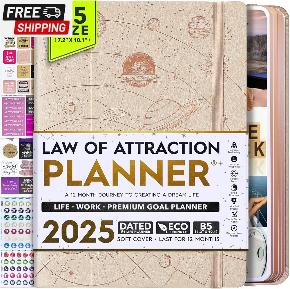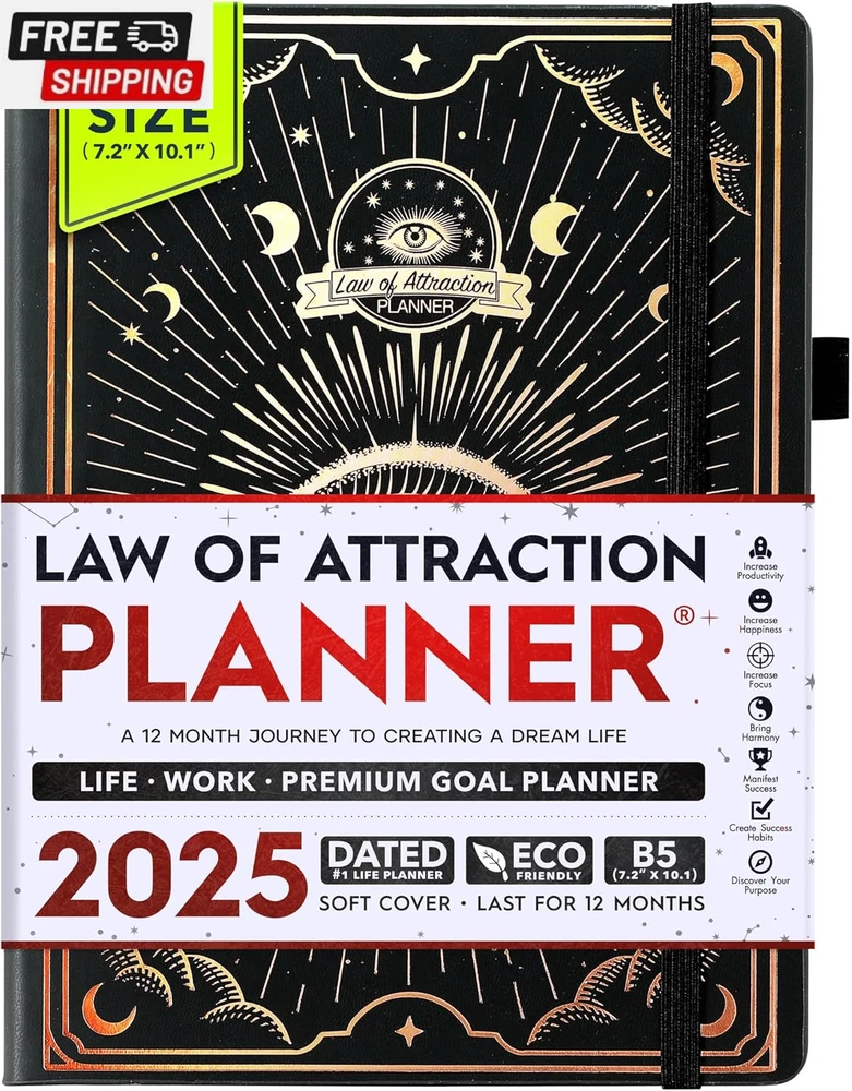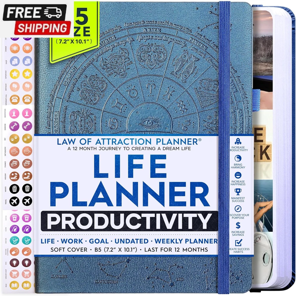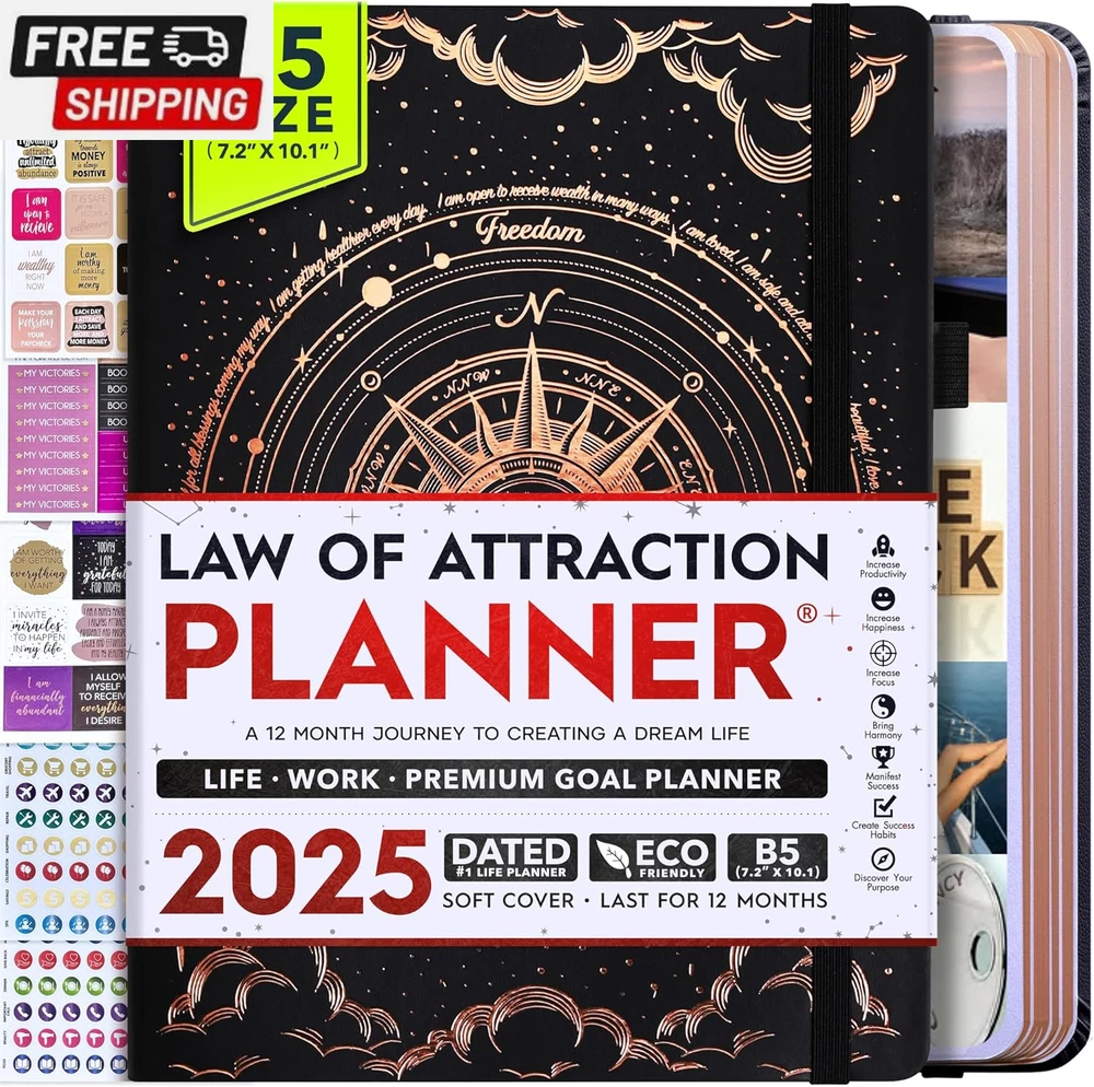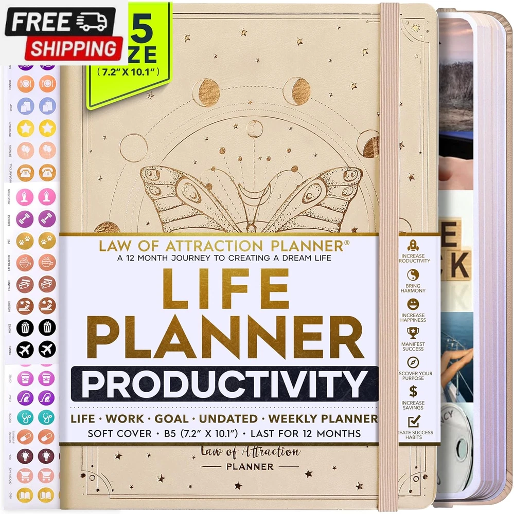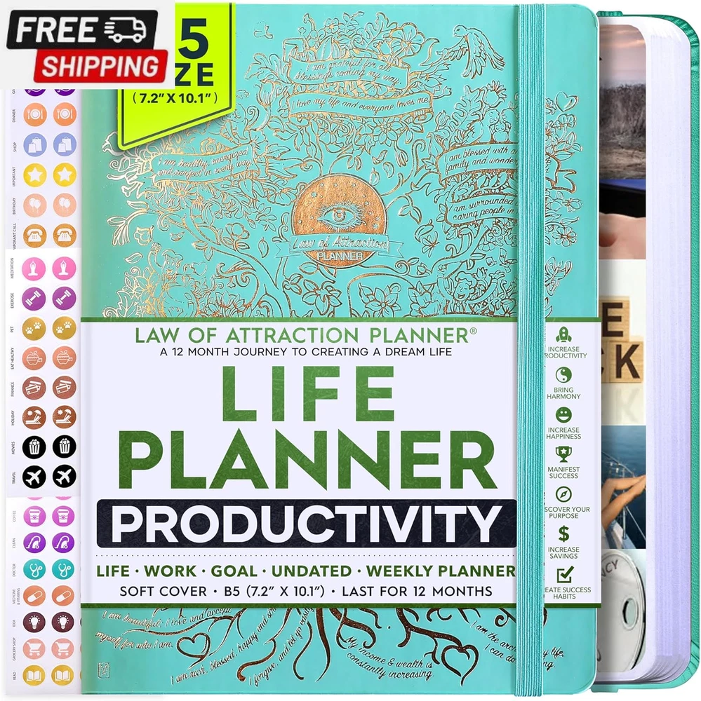 Life Planner - Undated Deluxe Weekly and Monthly Planner, a 12 Month Journey to Increase Productivity, Happiness & Enhance Organization | Life Organizer, Gratitude Journal, Agenda Planner, to Do List, Gift Box & Stickers - Start Anytime UNDATED PLANNER - All the success tools you need to create the life you always wanted. Sunday start pages, B5 Size (7.2 x 10.1 inches), thick paper 100 gsm, 248 pages of life transformation, 52 weekly, 12 monthly planning overviews & reflection, 30 dotted journal pages, up to 295 productivity stickers, habit trackers, mind maps, out foldable vision board, morning, evening routines. This life planner is UNDATED daily planner, undated weekly planner and undated monthly planner giving you the freedom to start your journey whenever suits you best. INCREASE PRODUCTIVITY AND HAPPINESS - This is a deluxe life goal planner showing you how to become the best possible version of yourself on a mental, physical & interpersonal level using the law of attraction vibration guide. This planner is a daily planner, monthly planner, weekly planner, productivity planner, goal planner, business planner, to do list planner, planner notebook & gratitude journal all-in-one. ACHIEVE YOUR GOALS USING THE LAW OF ATTRACTION - Learn how to set big goals, be happy and manage your time well, and follow the same methods millionaires around the world use to set goals and achieve them. This monthly planner undated planner, life planner, hourly planner, yearly planner, work planner, schedule planner or appointment book. It's a perfect planner for women and men. REDUCE OVERWHELM, STRESS AND FIX PROCRASTINATION - Follow a unique 8 step system that will help you bring back harmony, clarity, and peace in your life while achieving your goals. This planner is perfect for birthday gift, mother's day, anniversary gifts, and christmas gifts. LUXURIOUS & TOP QUALITY- Ideal for both women and men, perfect for entrepreneurs, professionals, college students, and everyone who has a burning desire to turn dreams into reality. No questions asked money-back guarantee. Product Description UNDATED DAILY PLANNER READY TO CREATE THE LIFE YOU ALWAYS WANTED WITH THE BEST LIFE PLANNER ON THE MARKET? The ONLY Law of Attraction Planner 2025 comes with Udated Daily Planner options that helps you find your Purpose, Eliminate Procrastination, Anxiety, Overwhelm and Stress by Guiding you Through 8 Simple Steps To Maximize your Productivity, Increase Creativity and Passion for Crushing Your Goals! The Law of Attraction Planner is a Life planner - A Manifestation Journal aids you in manifesting your desires through the practice of keeping a Manifesting Journal - a Time Management Planner - a Self Care Journal - a Vision Board Journal - a Life Coach - Work Planner, Agenda and Personalised Organiser , All in one. It combines the manifesting abilities and spiritual guidance from the law of attraction that also includes all the tools to achieve your short and long-term goals like principles of wealth building, and self-motivation all integrated into a daily schedule planner. Experience the transformative power of a 3-minute Positivity Journal and Planner, designed to create a manifesto effect from day 1! The Law of Attraction Planner contains 248 life-changing pages with 45 journal pages, habit trackers, mind maps, out foldable vision board, morning & evening routines. It also has a pen loop and 2 bookmarks. THE LAW OF ATTRACTION PLANNER WILL BE YOUR SECRET "UNFAIR ADVANTAGE" 2025 Hourly Planner , THERE’S A SMARTER WAY TO PLAN YOUR BEST YEAR! A LIFE THAT’S WORTH IT, IS WORTH PLANNING Once you start using the law of attraction's unique 8-step process you will understand how high achievers can accomplish so much more success in the same amount of time everyone else has. The 8-Step Law of Attraction Roadmap guides you to improve in all areas of your life from your career, family, health, fun activities, habits, emotional, relationships, spiritual, and life goals. As you continue using the law of attraction planner you will forget Incomplete, LOW-QUALITY Planners That ARE MISSING IMPORTANT STEPS AND Will Never Lead you To True Success! The Law of attraction Planner includes special tools to help you achieve your short and long term goals and to help you find your passion and purpose in life. This is the only Planner with the key self-development processes found inexpensive personal development books and life coaching courses that have been divided into 8 steps for radical life transformation. Let’s take a look at the 8-steps inside the Freedom Mastery’s Deluxe Law of Attraction Planner that similarly priced but lower quality planners lack. The 8-Step Law of Attraction Roadmap guides you to improve in all areas of your life from your career, family, health, fun activities, habits, emotional, relationships, spiritual and life goals. Life planner - a Manifesting Journal - a Time Management Planner - a Self Care Journal - a Vision Board Journal - a Life Coach - all in one YOUR IDEAS AND PLANS DESERVE TOP QUALITY PLANNERS THAT LAST A LIFE TIME The Law of Attraction Blueprint life planner was designed to give you a new self-awareness personal planner and self-discovery daily schedule planner of your life as it guides you to attract what you desire. The Law of Attraction Planner is the first Planner to use a Reward Structure.(Step 1&2). Science has confirmed that using a Reward on completing a goal creates positive neural pathways to better habits. The daily planner 2025 guides you to find your purpose and passion and see on an organized notebook the vision of your future life . Writing your mission statement on an appointment book helps you clearly know what is most important to you with the help of a productivity planner so you are on the right path to using the power of the law of attraction in creating a happier life. BEST Goal Planner 2025 Vision Board The Law of Attraction daily planner follows the same methods used by bi