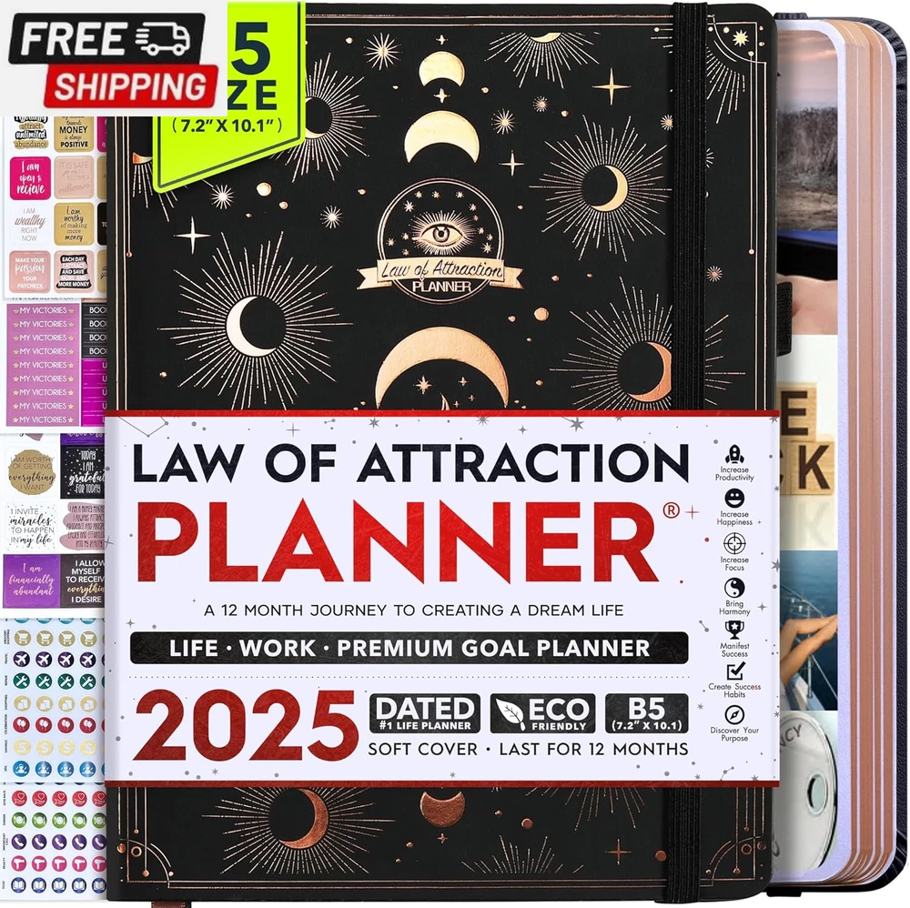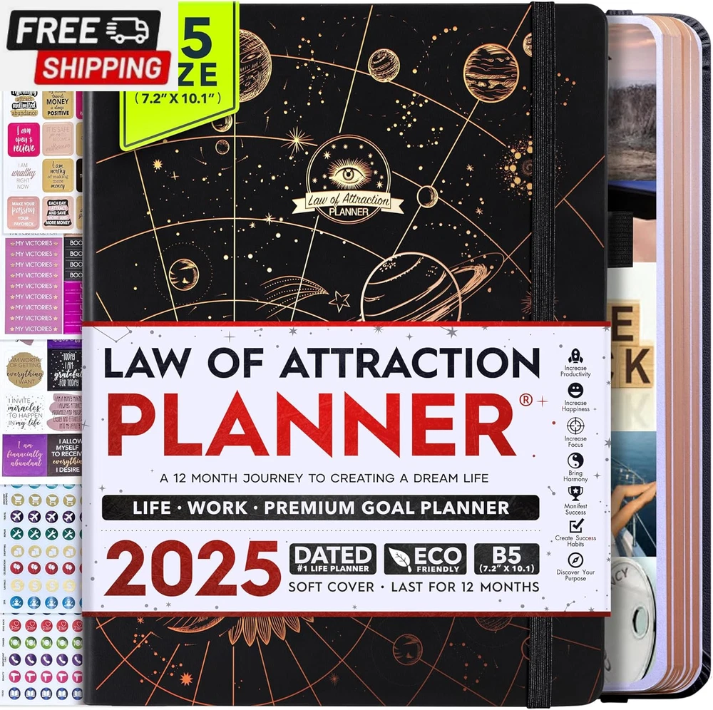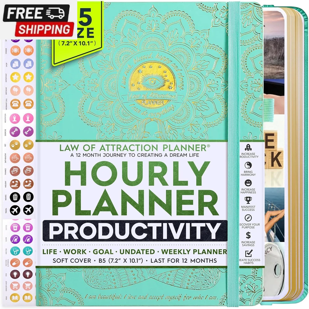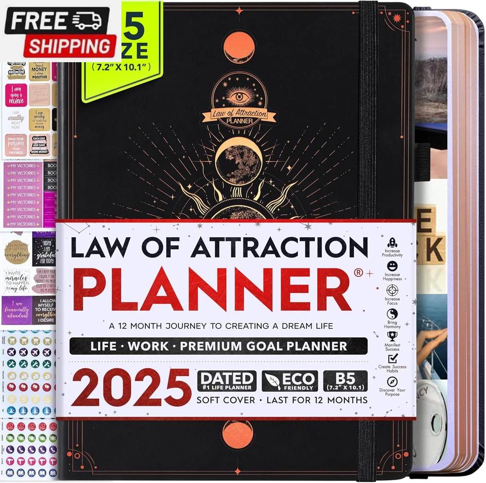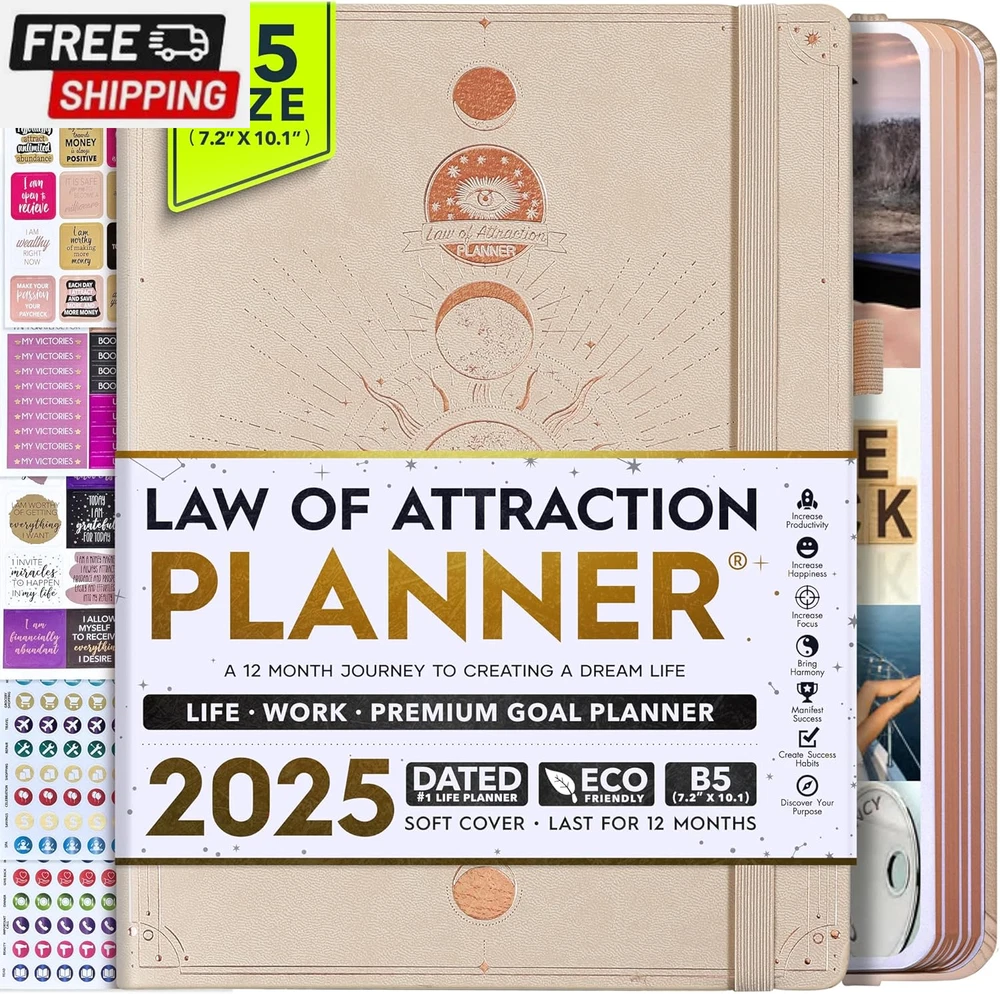Life Planner - Undated Deluxe Weekly and Monthly Planner, a 12 Month Journey to Increase Productivity, Happiness & Enhance Organization | Life Organizer, Gratitude Journal, Agenda Planner, to Do List, Gift Box & Stickers - Start Anytime UNDATED PLANNER - All the success tools you need to create the life you always wanted. Sunday start pages, B5 Size (7.2 x 10.1 inches), thick paper 100 gsm, 248 pages of life transformation, 52 weekly, 12 monthly planning overviews & reflection, 30 dotted journal pages, up to 295 productivity stickers, habit trackers, mind maps, out foldable vision board, morning, evening routines. This life planner is UNDATED daily planner, undated weekly planner and undated monthly planner giving you the freedom to start your journey whenever suits you best. INCREASE PRODUCTIVITY AND HAPPINESS - This is a deluxe life goal planner showing you how to become the best possible version of yourself on a mental, physical & interpersonal level using the law of attraction vibration guide. This planner is a daily planner, monthly planner, weekly planner, productivity planner, goal planner, business planner, to do list planner, planner notebook & gratitude journal all-in-one. ACHIEVE YOUR GOALS USING THE LAW OF ATTRACTION - Learn how to set big goals, be happy and manage your time well, and follow the same methods millionaires around the world use to set goals and achieve them. This monthly planner undated planner, life planner, hourly planner, yearly planner, work planner, schedule planner or appointment book. It's a perfect planner for women and men. REDUCE OVERWHELM, STRESS AND FIX PROCRASTINATION - Follow a unique 8 step system that will help you bring back harmony, clarity, and peace in your life while achieving your goals. This planner is perfect for birthday gift, mother's day, anniversary gifts, and christmas gifts. LUXURIOUS & TOP QUALITY- Ideal for both women and men, perfect for entrepreneurs, professionals, college students, and everyone who has a burning desire to turn dreams into reality. No questions asked money-back guarantee. Product Description UNDATED DAILY PLANNER READY TO CREATE THE LIFE YOU ALWAYS WANTED WITH THE BEST LIFE PLANNER ON THE MARKET? The ONLY Law of Attraction Planner 2025 comes with Udated Daily Planner options that helps you find your Purpose, Eliminate Procrastination, Anxiety, Overwhelm and Stress by Guiding you Through 8 Simple Steps To Maximize your Productivity, Increase Creativity and Passion for Crushing Your Goals! The Law of Attraction Planner is a Life planner - A Manifestation Journal aids you in manifesting your desires through the practice of keeping a Manifesting Journal - a Time Management Planner - a Self Care Journal - a Vision Board Journal - a Life Coach - Work Planner, Agenda and Personalised Organiser , All in one. It combines the manifesting abilities and spiritual guidance from the law of attraction that also includes all the tools to achieve your short and long-term goals like principles of wealth building, and self-motivation all integrated into a daily schedule planner. Experience the transformative power of a 3-minute Positivity Journal and Planner, designed to create a manifesto effect from day 1! The Law of Attraction Planner contains 248 life-changing pages with 45 journal pages, habit trackers, mind maps, out foldable vision board, morning & evening routines. It also has a pen loop and 2 bookmarks. THE LAW OF ATTRACTION PLANNER WILL BE YOUR SECRET "UNFAIR ADVANTAGE" 2025 Hourly Planner , THERE’S A SMARTER WAY TO PLAN YOUR BEST YEAR! A LIFE THAT’S WORTH IT, IS WORTH PLANNING Once you start using the law of attraction's unique 8-step process you will understand how high achievers can accomplish so much more success in the same amount of time everyone else has. The 8-Step Law of Attraction Roadmap guides you to improve in all areas of your life from your career, family, health, fun activities, habits, emotional, relationships, spiritual, and life goals. As you continue using the law of attraction planner you will forget Incomplete, LOW-QUALITY Planners That ARE MISSING IMPORTANT STEPS AND Will Never Lead you To True Success! The Law of attraction Planner includes special tools to help you achieve your short and long term goals and to help you find your passion and purpose in life. This is the only Planner with the key self-development processes found inexpensive personal development books and life coaching courses that have been divided into 8 steps for radical life transformation. Let’s take a look at the 8-steps inside the Freedom Mastery’s Deluxe Law of Attraction Planner that similarly priced but lower quality planners lack. The 8-Step Law of Attraction Roadmap guides you to improve in all areas of your life from your career, family, health, fun activities, habits, emotional, relationships, spiritual and life goals. Life planner - a Manifesting Journal - a Time Management Planner - a Self Care Journal - a Vision Board Journal - a Life Coach - all in one YOUR IDEAS AND PLANS DESERVE TOP QUALITY PLANNERS THAT LAST A LIFE TIME The Law of Attraction Blueprint life planner was designed to give you a new self-awareness personal planner and self-discovery daily schedule planner of your life as it guides you to attract what you desire. The Law of Attraction Planner is the first Planner to use a Reward Structure.(Step 1&2). Science has confirmed that using a Reward on completing a goal creates positive neural pathways to better habits. The daily planner 2025 guides you to find your purpose and passion and see on an organized notebook the vision of your future life . Writing your mission statement on an appointment book helps you clearly know what is most important to you with the help of a productivity planner so you are on the right path to using the power of the law of attraction in creating a happier life. BEST Goal Planner 2025 Vision Board The Law of Attraction daily planner follows the same methods used by bi
