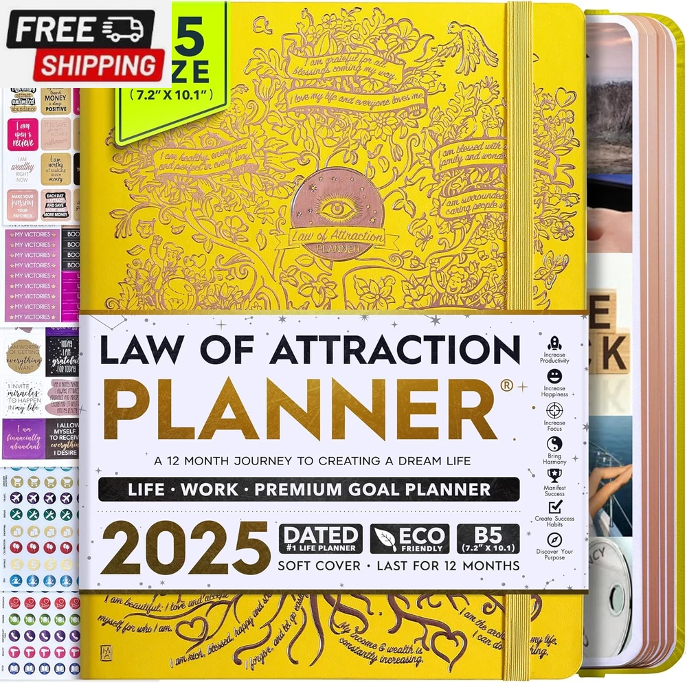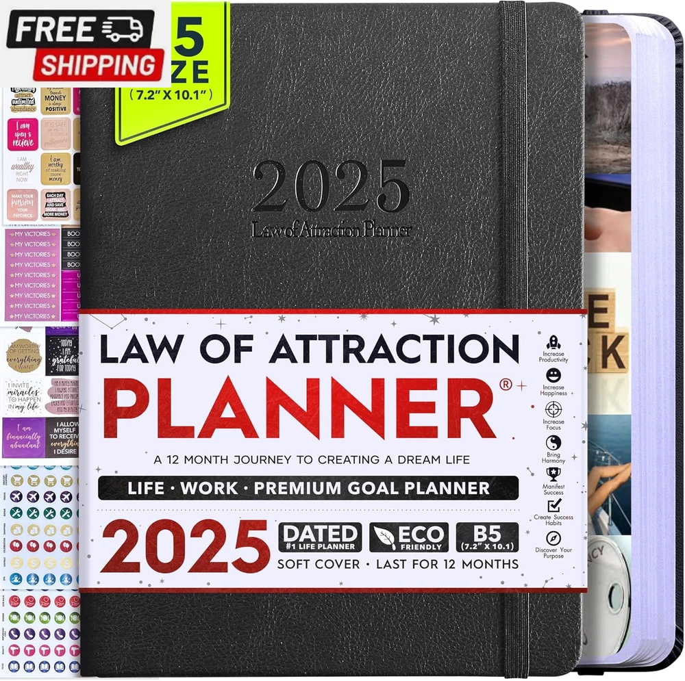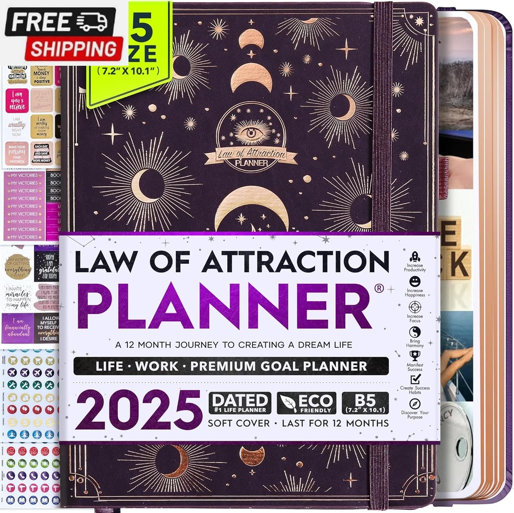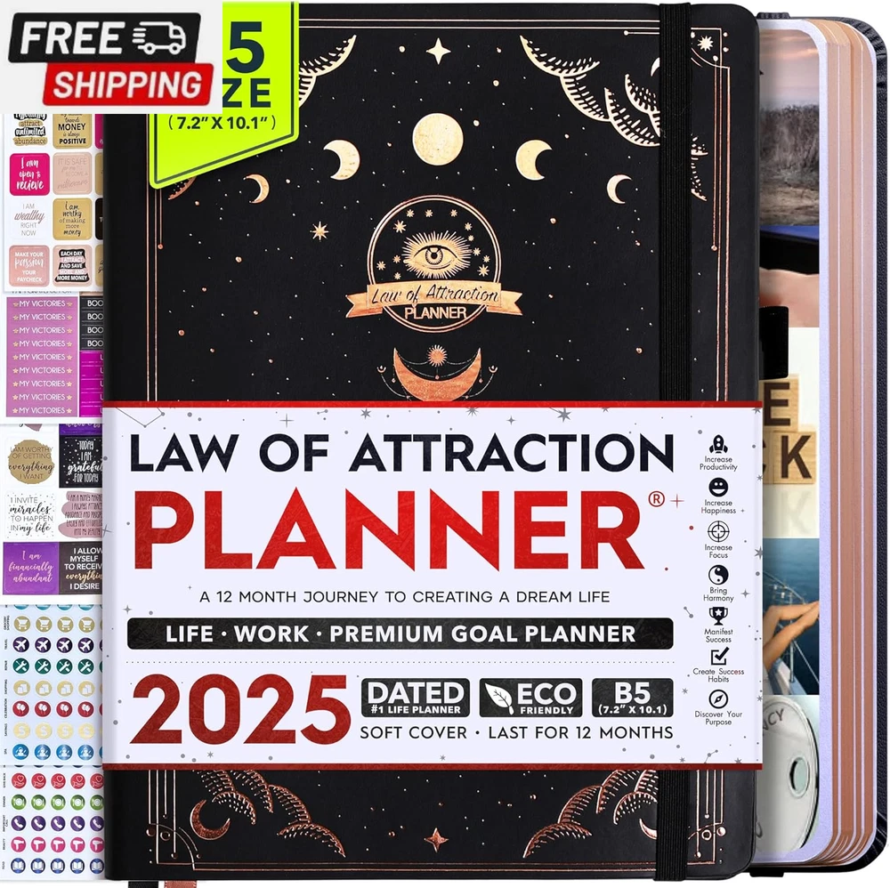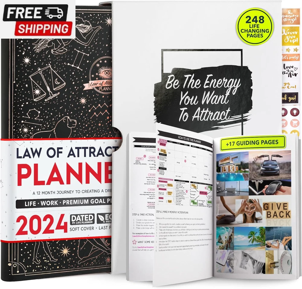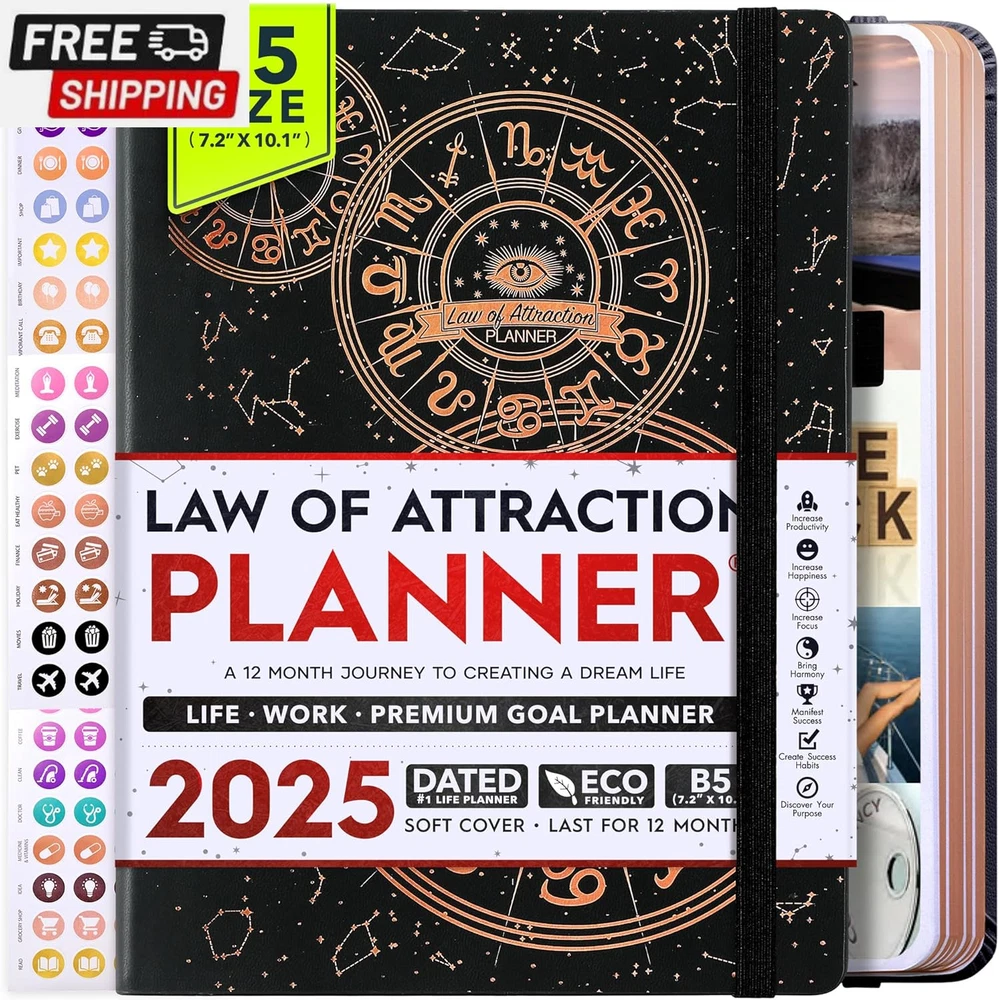 Life Planner - Undated Deluxe Weekly and Monthly Planner, a 12 Month Journey to Increase Productivity, Happiness & Enhance Organization | Life Organizer, Gratitude Journal, Agenda Planner, to Do List, Gift Box & Stickers - Start Anytime UNDATED PLANNER - All the success tools you need to create the life you always wanted. Sunday start pages, B5 Size (7.2 x 10.1 inches), thick paper 100 gsm, 248 pages of life transformation, 52 weekly, 12 monthly planning overviews & reflection, 30 dotted journal pages, up to 295 productivity stickers, habit trackers, mind maps, out foldable vision board, morning, evening routines. This life planner is UNDATED daily planner, undated weekly planner and undated monthly planner giving you the freedom to start your journey whenever suits you best. INCREASE PRODUCTIVITY AND HAPPINESS - This is a deluxe life goal planner showing you how to become the best possible version of yourself on a mental, physical & interpersonal level using the law of attraction vibration guide. This planner is a daily planner, monthly planner, weekly planner, productivity planner, goal planner, business planner, to do list planner, planner notebook & gratitude journal all-in-one. ACHIEVE YOUR GOALS USING THE LAW OF ATTRACTION - Learn how to set big goals, be happy and manage your time well, and follow the same methods millionaires around the world use to set goals and achieve them. This monthly planner undated planner, life planner, hourly planner, yearly planner, work planner, schedule planner or appointment book. It's a perfect planner for women and men. REDUCE OVERWHELM, STRESS AND FIX PROCRASTINATION - Follow a unique 8 step system that will help you bring back harmony, clarity, and peace in your life while achieving your goals. This planner is perfect for birthday gift, mother's day, anniversary gifts, and christmas gifts. LUXURIOUS & TOP QUALITY- Ideal for both women and men, perfect for entrepreneurs, professionals, college students, and everyone who has a burning desire to turn dreams into reality. No questions asked money-back guarantee. Product Description UNDATED DAILY PLANNER READY TO CREATE THE LIFE YOU ALWAYS WANTED WITH THE BEST LIFE PLANNER ON THE MARKET? The ONLY Law of Attraction Planner 2025 comes with Udated Daily Planner options that helps you find your Purpose, Eliminate Procrastination, Anxiety, Overwhelm and Stress by Guiding you Through 8 Simple Steps To Maximize your Productivity, Increase Creativity and Passion for Crushing Your Goals! The Law of Attraction Planner is a Life planner - A Manifestation Journal aids you in manifesting your desires through the practice of keeping a Manifesting Journal - a Time Management Planner - a Self Care Journal - a Vision Board Journal - a Life Coach - Work Planner, Agenda and Personalised Organiser , All in one. It combines the manifesting abilities and spiritual guidance from the law of attraction that also includes all the tools to achieve your short and long-term goals like principles of wealth building, and self-motivation all integrated into a daily schedule planner. Experience the transformative power of a 3-minute Positivity Journal and Planner, designed to create a manifesto effect from day 1! The Law of Attraction Planner contains 248 life-changing pages with 45 journal pages, habit trackers, mind maps, out foldable vision board, morning & evening routines. It also has a pen loop and 2 bookmarks. THE LAW OF ATTRACTION PLANNER WILL BE YOUR SECRET "UNFAIR ADVANTAGE" 2025 Hourly Planner , THERE’S A SMARTER WAY TO PLAN YOUR BEST YEAR! A LIFE THAT’S WORTH IT, IS WORTH PLANNING Once you start using the law of attraction's unique 8-step process you will understand how high achievers can accomplish so much more success in the same amount of time everyone else has. The 8-Step Law of Attraction Roadmap guides you to improve in all areas of your life from your career, family, health, fun activities, habits, emotional, relationships, spiritual, and life goals. As you continue using the law of attraction planner you will forget Incomplete, LOW-QUALITY Planners That ARE MISSING IMPORTANT STEPS AND Will Never Lead you To True Success! The Law of attraction Planner includes special tools to help you achieve your short and long term goals and to help you find your passion and purpose in life. This is the only Planner with the key self-development processes found inexpensive personal development books and life coaching courses that have been divided into 8 steps for radical life transformation. Let’s take a look at the 8-steps inside the Freedom Mastery’s Deluxe Law of Attraction Planner that similarly priced but lower quality planners lack. The 8-Step Law of Attraction Roadmap guides you to improve in all areas of your life from your career, family, health, fun activities, habits, emotional, relationships, spiritual and life goals. Life planner - a Manifesting Journal - a Time Management Planner - a Self Care Journal - a Vision Board Journal - a Life Coach - all in one YOUR IDEAS AND PLANS DESERVE TOP QUALITY PLANNERS THAT LAST A LIFE TIME The Law of Attraction Blueprint life planner was designed to give you a new self-awareness personal planner and self-discovery daily schedule planner of your life as it guides you to attract what you desire. The Law of Attraction Planner is the first Planner to use a Reward Structure.(Step 1&2). Science has confirmed that using a Reward on completing a goal creates positive neural pathways to better habits. The daily planner 2025 guides you to find your purpose and passion and see on an organized notebook the vision of your future life . Writing your mission statement on an appointment book helps you clearly know what is most important to you with the help of a productivity planner so you are on the right path to using the power of the law of attraction in creating a happier life. BEST Goal Planner 2025 Vision Board The Law of Attraction daily planner follows the same methods used by bi