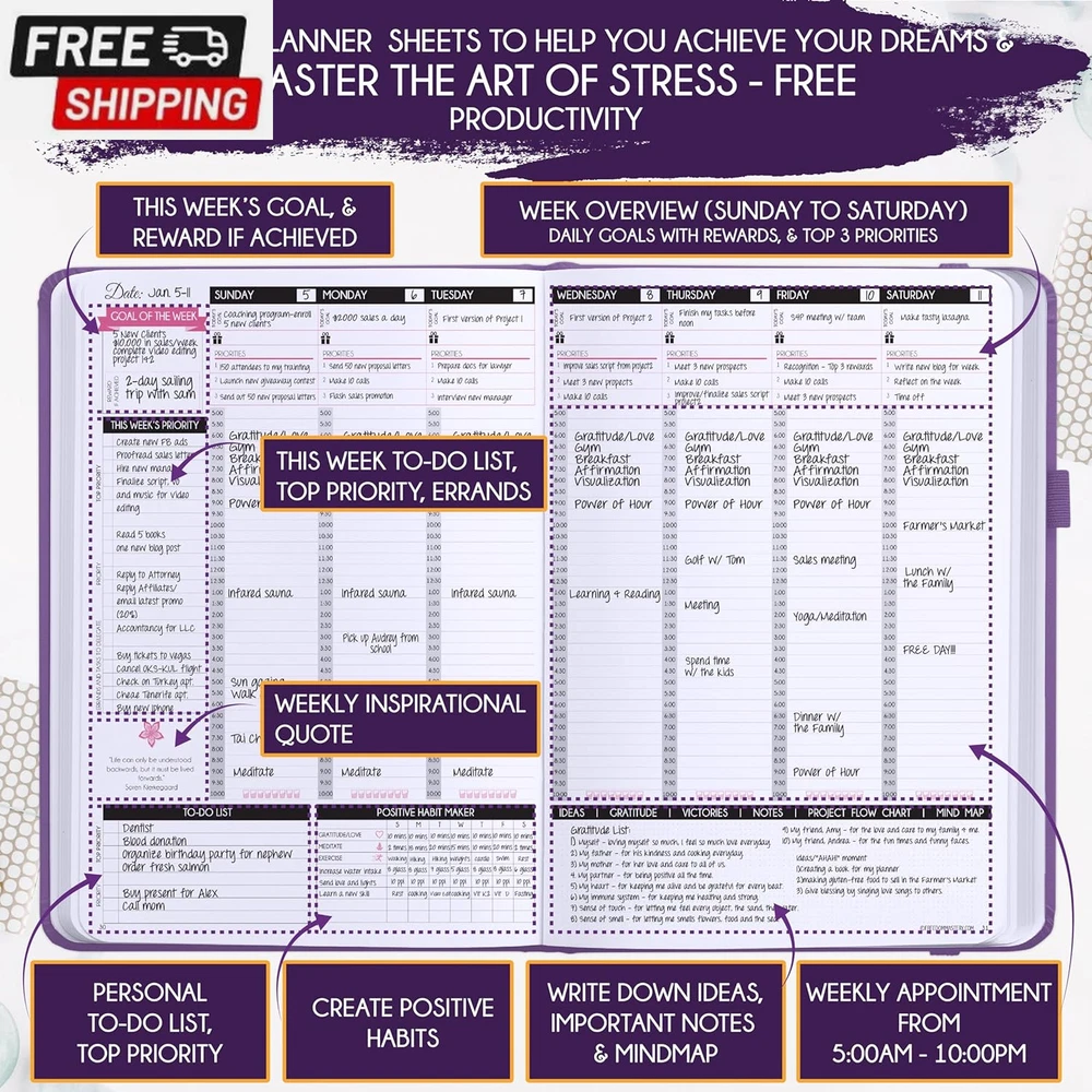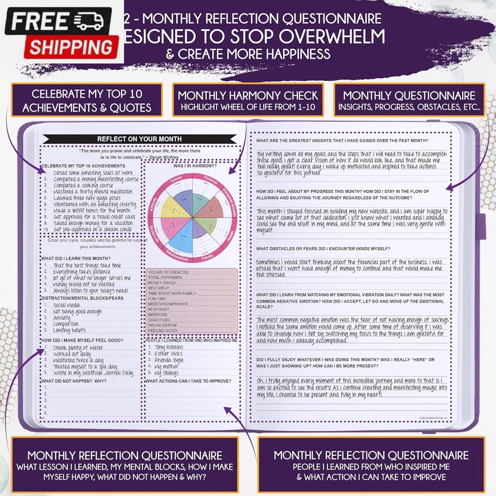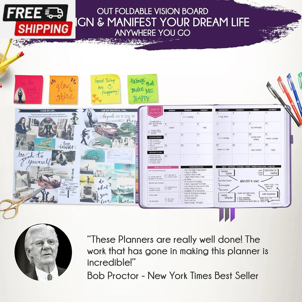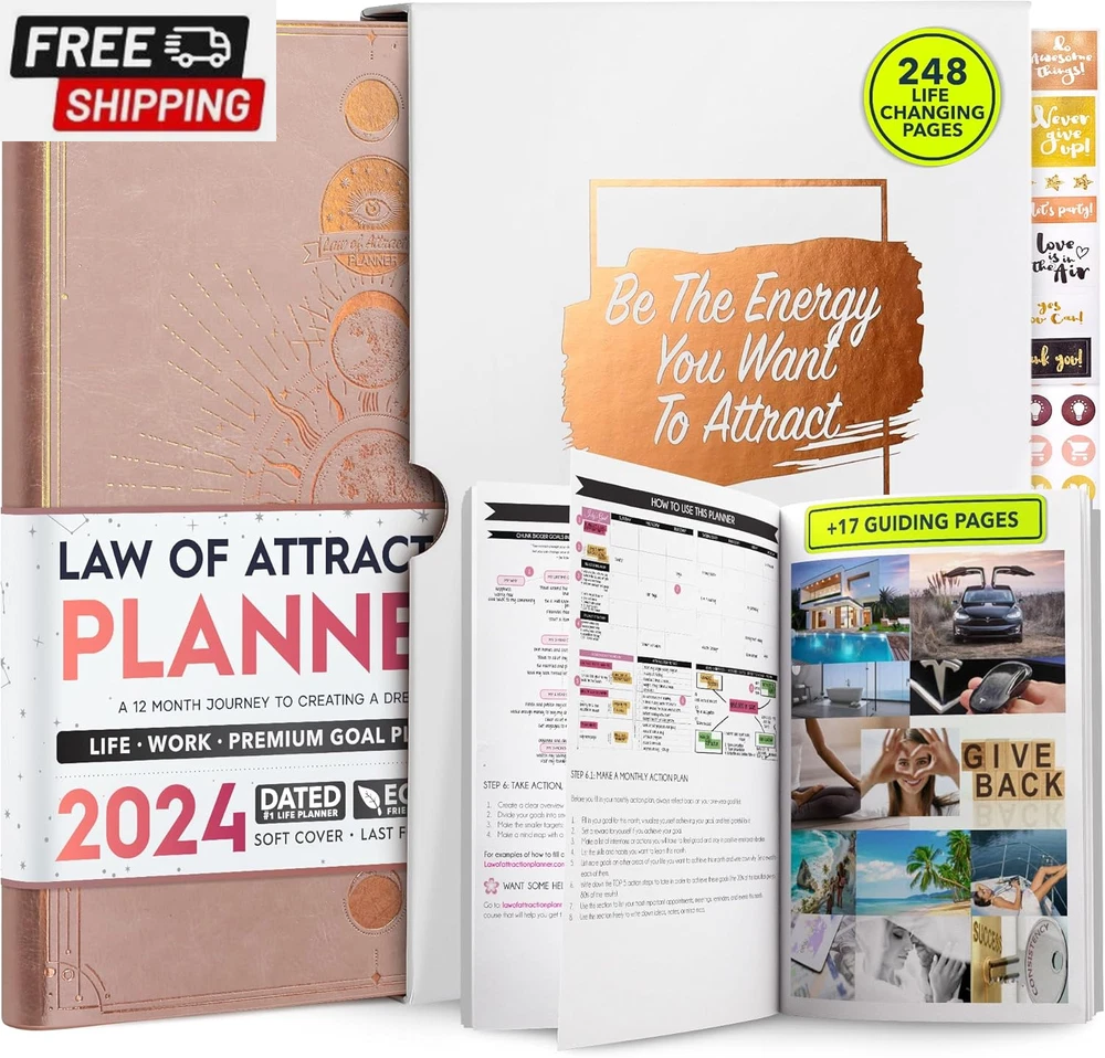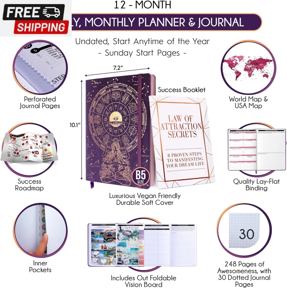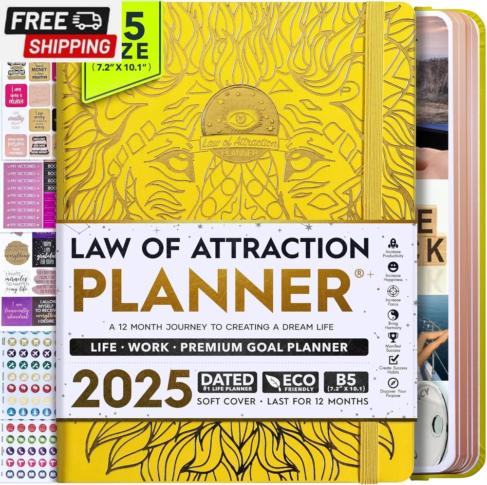 Life Planner - Undated Deluxe Weekly and Monthly Planner, a 12 Month Journey to Increase Productivity, Happiness & Enhance Organization | Life Organizer, Gratitude Journal, Agenda Planner, to Do List, Gift Box & Stickers - Start Anytime UNDATED PLANNER - All the success tools you need to create the life you always wanted. Sunday start pages, B5 Size (7.2 x 10.1 inches), thick paper 100 gsm, 248 pages of life transformation, 52 weekly, 12 monthly planning overviews & reflection, 30 dotted journal pages, up to 295 productivity stickers, habit trackers, mind maps, out foldable vision board, morning, evening routines. This life planner is UNDATED daily planner, undated weekly planner and undated monthly planner giving you the freedom to start your journey whenever suits you best. INCREASE PRODUCTIVITY AND HAPPINESS - This is a deluxe life goal planner showing you how to become the best possible version of yourself on a mental, physical & interpersonal level using the law of attraction vibration guide. This planner is a daily planner, monthly planner, weekly planner, productivity planner, goal planner, business planner, to do list planner, planner notebook & gratitude journal all-in-one. ACHIEVE YOUR GOALS USING THE LAW OF ATTRACTION - Learn how to set big goals, be happy and manage your time well, and follow the same methods millionaires around the world use to set goals and achieve them. This monthly planner undated planner, life planner, hourly planner, yearly planner, work planner, schedule planner or appointment book. It's a perfect planner for women and men. REDUCE OVERWHELM, STRESS AND FIX PROCRASTINATION - Follow a unique 8 step system that will help you bring back harmony, clarity, and peace in your life while achieving your goals. This planner is perfect for birthday gift, mother's day, anniversary gifts, and christmas gifts. LUXURIOUS & TOP QUALITY- Ideal for both women and men, perfect for entrepreneurs, professionals, college students, and everyone who has a burning desire to turn dreams into reality. No questions asked money-back guarantee. Product Description UNDATED DAILY PLANNER READY TO CREATE THE LIFE YOU ALWAYS WANTED WITH THE BEST LIFE PLANNER ON THE MARKET? The ONLY Law of Attraction Planner 2025 comes with Udated Daily Planner options that helps you find your Purpose, Eliminate Procrastination, Anxiety, Overwhelm and Stress by Guiding you Through 8 Simple Steps To Maximize your Productivity, Increase Creativity and Passion for Crushing Your Goals! The Law of Attraction Planner is a Life planner - A Manifestation Journal aids you in manifesting your desires through the practice of keeping a Manifesting Journal - a Time Management Planner - a Self Care Journal - a Vision Board Journal - a Life Coach - Work Planner, Agenda and Personalised Organiser , All in one. It combines the manifesting abilities and spiritual guidance from the law of attraction that also includes all the tools to achieve your short and long-term goals like principles of wealth building, and self-motivation all integrated into a daily schedule planner. Experience the transformative power of a 3-minute Positivity Journal and Planner, designed to create a manifesto effect from day 1! The Law of Attraction Planner contains 248 life-changing pages with 45 journal pages, habit trackers, mind maps, out foldable vision board, morning & evening routines. It also has a pen loop and 2 bookmarks. THE LAW OF ATTRACTION PLANNER WILL BE YOUR SECRET "UNFAIR ADVANTAGE" 2025 Hourly Planner , THERE’S A SMARTER WAY TO PLAN YOUR BEST YEAR! A LIFE THAT’S WORTH IT, IS WORTH PLANNING Once you start using the law of attraction's unique 8-step process you will understand how high achievers can accomplish so much more success in the same amount of time everyone else has. The 8-Step Law of Attraction Roadmap guides you to improve in all areas of your life from your career, family, health, fun activities, habits, emotional, relationships, spiritual, and life goals. As you continue using the law of attraction planner you will forget Incomplete, LOW-QUALITY Planners That ARE MISSING IMPORTANT STEPS AND Will Never Lead you To True Success! The Law of attraction Planner includes special tools to help you achieve your short and long term goals and to help you find your passion and purpose in life. This is the only Planner with the key self-development processes found inexpensive personal development books and life coaching courses that have been divided into 8 steps for radical life transformation. Let’s take a look at the 8-steps inside the Freedom Mastery’s Deluxe Law of Attraction Planner that similarly priced but lower quality planners lack. The 8-Step Law of Attraction Roadmap guides you to improve in all areas of your life from your career, family, health, fun activities, habits, emotional, relationships, spiritual and life goals. Life planner - a Manifesting Journal - a Time Management Planner - a Self Care Journal - a Vision Board Journal - a Life Coach - all in one YOUR IDEAS AND PLANS DESERVE TOP QUALITY PLANNERS THAT LAST A LIFE TIME The Law of Attraction Blueprint life planner was designed to give you a new self-awareness personal planner and self-discovery daily schedule planner of your life as it guides you to attract what you desire. The Law of Attraction Planner is the first Planner to use a Reward Structure.(Step 1&2). Science has confirmed that using a Reward on completing a goal creates positive neural pathways to better habits. The daily planner 2025 guides you to find your purpose and passion and see on an organized notebook the vision of your future life . Writing your mission statement on an appointment book helps you clearly know what is most important to you with the help of a productivity planner so you are on the right path to using the power of the law of attraction in creating a happier life. BEST Goal Planner 2025 Vision Board The Law of Attraction daily planner follows the same methods used by bi