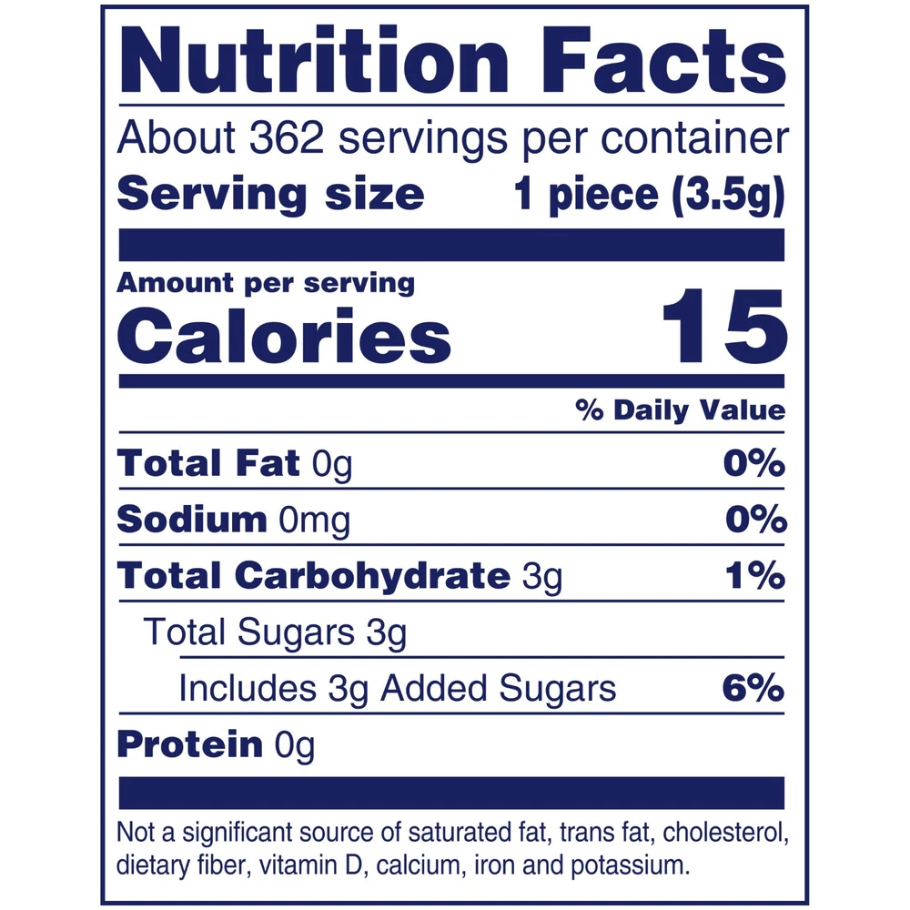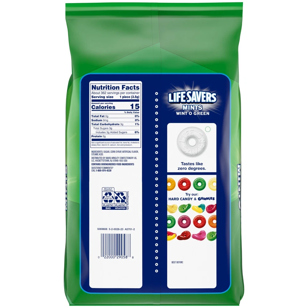 Life Savers Wint-O-Green Breath Mint Hard Candy, Party Size - 44.93 oz Product details Stock up on bulk breath mint hard candy with a bag of LIFE SAVERS Wint-O-Green Breath Mints. Grab Wintergreen LIFE SAVERS to share, pack in your purse, or keep in your pocket for fresh breath anytime. Each LIFE SAVERS hard candy comes individually wrapped, making them a great bulk candy to toss in a bag, or fill a candy bowl. There are endless ways to enjoy LIFE SAVERS Wint-O-Green Breath Mints! Contains one (1) 44.93-ounce bag of LIFE SAVERS Wint O Green Breath Mint Hard Candy Filled with icy wintergreen flavor, LIFE SAVERS Mints are a Hole lot of fun Every office needs a stash of minty goodness to combat coffee breath and boost confidence for big presentations Make date night fun and fresh! LIFE SAVERS Breath Mints keep you ready whether it’s your first date or your 50th anniversary Stock up your pantry or use LIFE SAVERS bulk mint hard candy for holidays, event party favors, office treats, study breaks, parties and more! Nutrition information Nutrition facts Refer to the product label for full dietary information, which may be available as an alternative product image. 363 Servings Per Container Serving Size 1 Amount per serving Calories 15 Amount per serving % Daily Value* Total Fat 0g Sodium 0mg Total Carbohydrate 3g Protein 0g * The % Daily Value (DV) tells you how much a nutrient in a serving of food contributes to a daily diet. Calories per gram:Fat 9 • Carbohydrate 4 • Protein 4 Specifications Features Hard-candy mints with a hole in the middle, Great to keep around the office; in the breakroom, at the reception desk, or to share with coworkers, Mint hard candies with a refreshing taste Food Allergen Statements Fat-free Brand Life Savers Assembled Product Dimensions (L x W x H) 12.60 x 7.30 x 3.40 Inches More details Warranty information Please be aware that the warranty terms on items offered for sale by third party Marketplace sellers may differ from those displayed in this section (if any). To confirm warranty terms on an item offered for sale by a third party Marketplace seller, please use the 'Contact seller' feature on the third party Marketplace seller's information page and request the item's warranty terms prior to purchase. Ingredients Sugar, Corn Syrup, Artificial Flavor, Stearic Acid.
