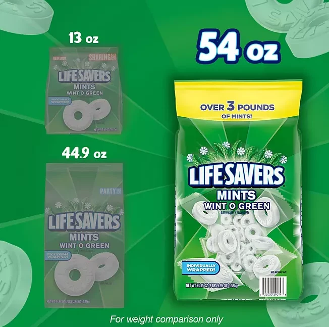 Dominate Deals Welcome to Dominant Deals! Explore amazing products at unbeatable prices. If you need any help, we're here for you. Happy shopping! HIGHLIGHTS Contains one (1) 53.95-ounce bag of LIFE SAVERS Wint-O-Green Hard Candy Filled with icy wintergreen flavor, LIFE SAVERS Mints are A Hole Lot O Fun Keep your breath fresh with the refreshing taste of LIFE SAVERS Mints Individually wrapped mints are great for the break room or the reception desk Stock up on your favorite mints with this bulk candy package PRODUCT OVERVIEW Experience the Freshness Why do we strive for fresh breath? The answer is simple - the icy, wintergreen taste of just one of these hard candy mints is all you need to freshen your breath and rejuvenate your day. Perfect for counteracting the after-effects of morning coffee or a lengthy lunch break, these mints offer a refreshing boost when you need it most. A Sweet Treat for Any Time of the Day Not only are these mints excellent for freshening your breath, they also serve as a delightful sweet treat in the afternoon. Keep a pack at your desk for those moments when you need a little pick-me-up, or surprise your coworkers by sharing these delicious LIFE SAVERS Mints. Embrace the Minty Side of Life Isn't it time you indulged in the minty side of simplicity? With these hard candy mints, you can do just that. Experience the invigorating taste and feel the freshness envelop you. Become the office champion and spread the joy of LIFE SAVERS Mints to those in need. After all, a little freshness goes a long way. SHIPPING GUIDELINES We offer FREE shipping on all orders! Items are usually dispatched within 3-4 business days of payment, with delivery typically taking 3-5 business days after shipment. If your item is lost or there's an unexpected shipping delay, please reach out to us and we?ll assist you with a refund. RETURN GUIDELINES Customers can return the product within 30 days of purchase if they?re not fully satisfied. The item must be returned in its original packaging, and the customer is responsible for return shipping costs. THANK YOU H