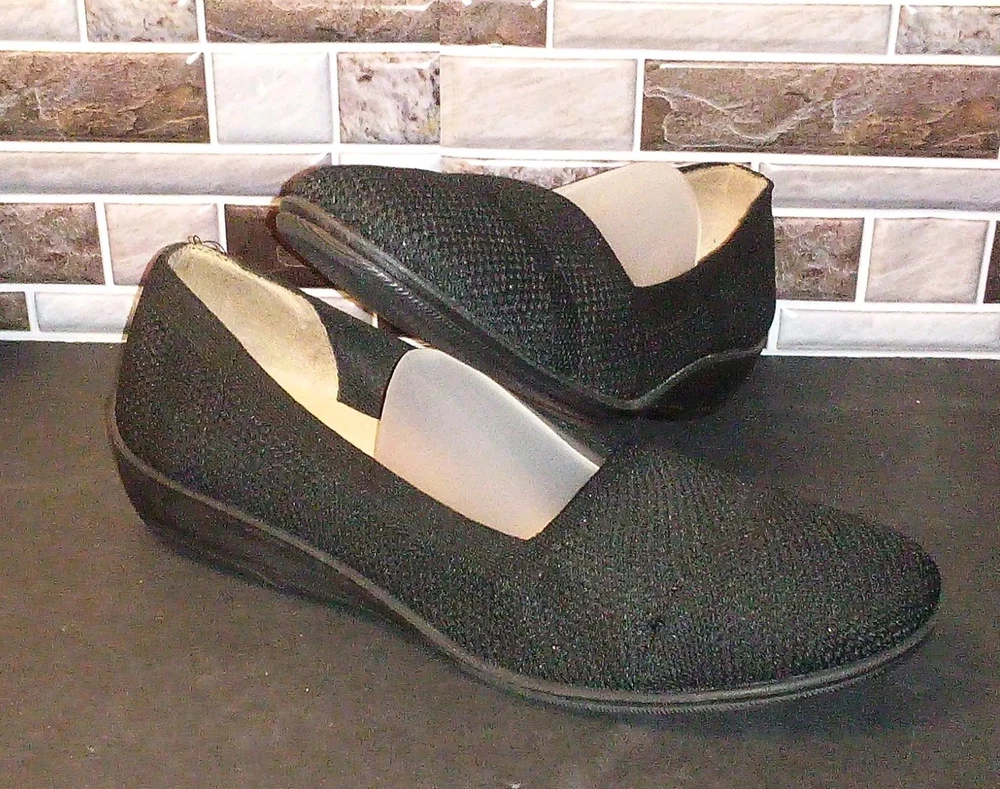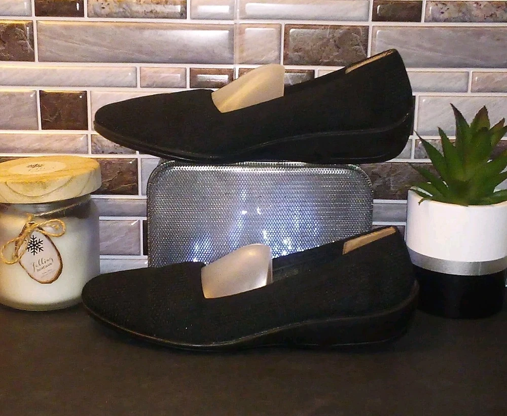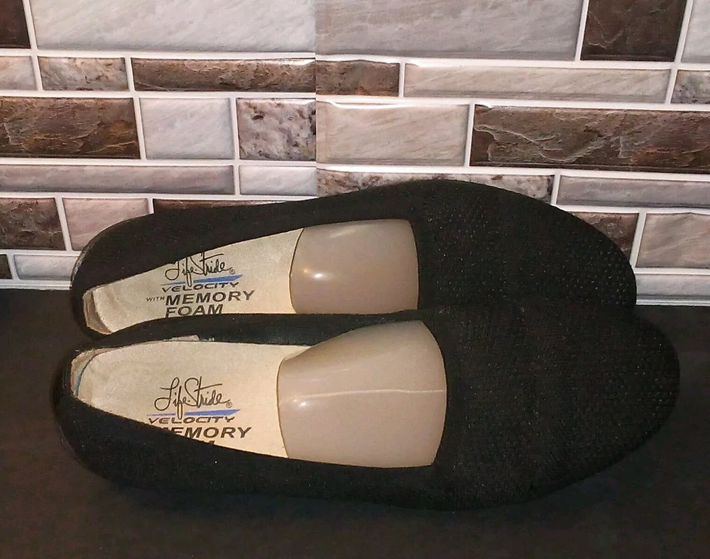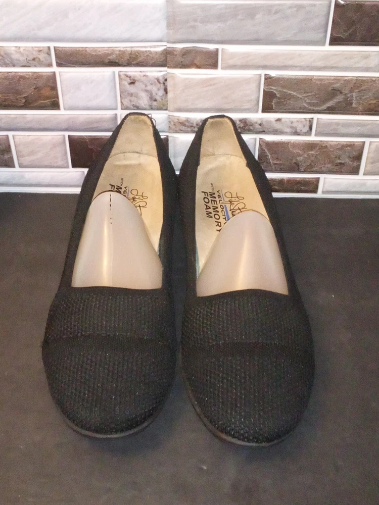 The Life Stride Velocity Women's Black Ballet Flats in size 9.5 feature a low wedge design with memory foam for added comfort. These slip-on flats are suitable for various occasions such as travel, activewear, parties, and workwear. The round toe shape and breathable fabric lining make them both stylish and practical, while the rubber outsole provides traction. Perfect for all seasons, these flats are a versatile addition to any wardrobe.