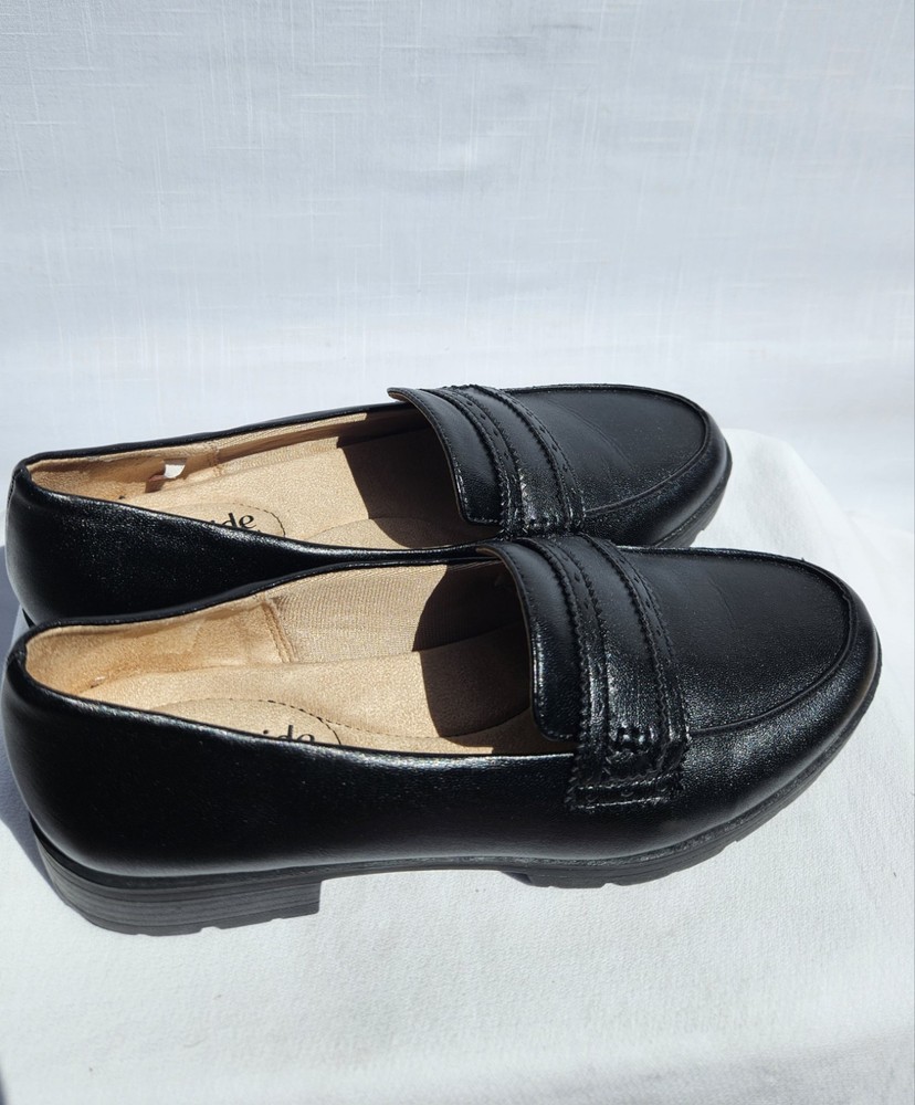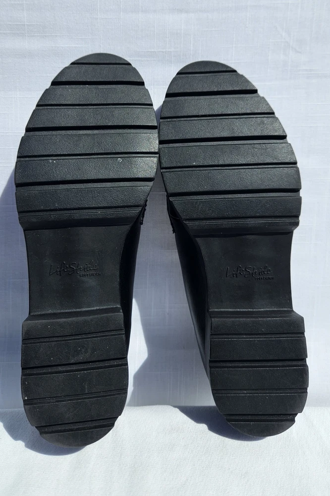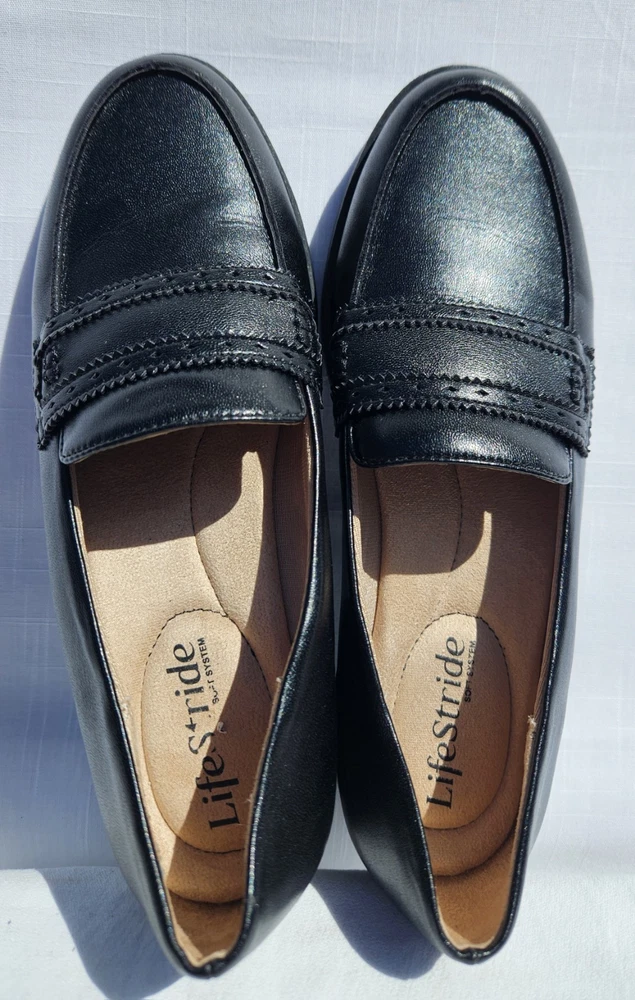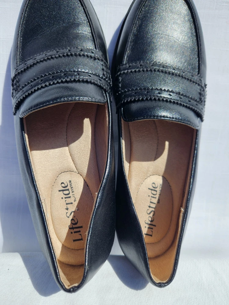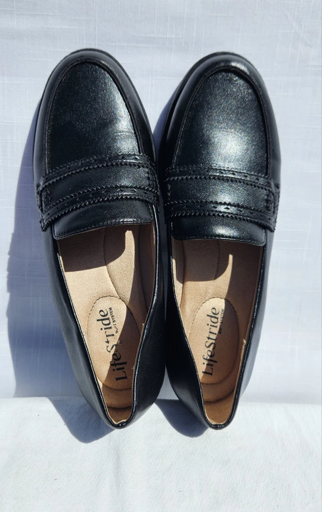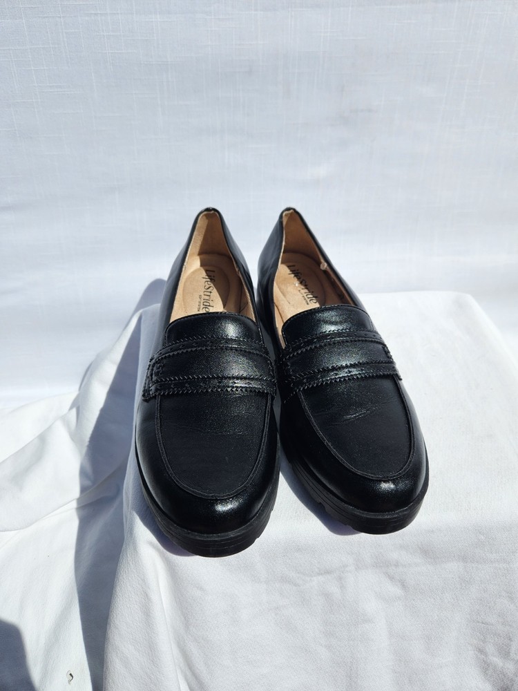 Step out in comfort and style with these LifeStride loafers, a chic addition to any wardrobe. Crafted with a sleek black leather upper and a synthetic insole, these flats offer both durability and a touch of elegance. The versatile design makes them ideal for various occasions, from a day at the office to an evening out. The loafers feature a classic slip-on style with a modern twist, embodying themes such as city life, celebrity culture, festivals, and shiny sophistication. Perfect for those who value both comfort and fashion, these shoes are a staple for any stylish ensemble. Size 7M ensures a snug fit for a variety of foot shapes, while the flat type offers a stable and comfortable stride.