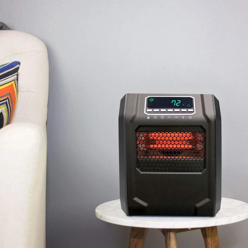 Beat the cold with the Lifesmart 4 Element Infrared heater offering you safe and healthy heat for a medium room. Lifesmart offers ultra-efficient and safe heat at less cost than other heating systems by using zone heating that maintains the heat only in the room that you are in. This heater delivers 1,500 watts of power through 4 quartz heating elements and features a 12-hour programmable timer and 3 heat settings. There is also a lifetime washable air filter to help clean the air as it heats the room. There are 3 energy settings including an Eco setting that will heat smaller areas to 68 degrees, using only the most efficient power consumption. The heater is surrounded by a stylish 2 tone black fireproof plastic cabinet that is cool to the touch. There are several other safety features including a child lock-out feature and tip-over shutoff. This amazing heater also includes a new larger remote control to operate the digital thermostat and dual timer settings that can be used to turn the unit on up to 12 hours ahead so your room is warm when you come home or turn off in up to 12 hours. Easy-read angled control panel is user-friendly and can be operated by a button or remote control (batteries not included). The lightweight, stylish cabinet features a contemporary design with built-in carry handles for easy room-to-room portability. Enjoy warm, healthy infrared heat today with the Lifesmart 4 Infrared Heater. Experience efficient and safe heat with the LifeSmart electric heaters for indoor use at less cost by using zone heating that maintains the heat only in the room that you are in Features a 1500 Watt Infrared 4 quartz heating element that does not dry out the air and equipped with a programmable timer and 3 heat settings including an Eco mode for smaller rooms Comes with a remote control to operate the digital thermostat and dual timer settings that can be used to turn the unit on in up to 12 hours ahead to ensure that your room is heated beforehand Portable heaters for indoor use includes a lifetime washable filter to help clean the air as it heats the room and safety features including a child lock out feature and tip over shutoff Electric space heater by LifeSmart does not require assembly and has built-in carry handles; Dimensions: 11.57” L x 9.72” W x 12.1” H; Weight 10.87 pounds