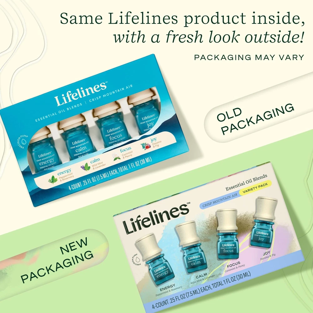 Lifelines Essential Oil Blend Set in Crisp Mountain Air: All the blends in this collection evoke fresh rain showers, dewy hillsides, and morning fog. 4-pack. Not compatible with our ClickWick Plant, Candle, or Shower diffusers. Invigorating Aroma: Joy features Davana and Fig. Energy features Peppermint and Rosemary. Focus features Cornmint and Peony. Calm features Wild Mint and Lavender. Mess-Free Precision Pump: Dispense the perfect amount every time with no guesswork and no mess. NOT compatible with our ClickWick Candle, Plant, or Shower diffusers, which require ClickWick Essential Oil Blends. One-of-a-Kind Gift: The perfect gift for the person who has everything. Great for anyone looking to unwind and relax with delightful scents. Only the Good Stuff: Essential Oil Blends were created for an aroma experience using pure essential oils and botanicals sourced from around the globe. Free from parabens, phthalates, and dyes. Sensory Immersion: The practice of activating your senses. Seeing, smelling, and touching delightful things brings you back to the here and now. Let your senses work their magic. About Lifelines: Lifelines was created to help people enhance their well-being in fast, effortless, and fun ways. Meet the tools designed to help you relax and unwind anytime, anywhere.