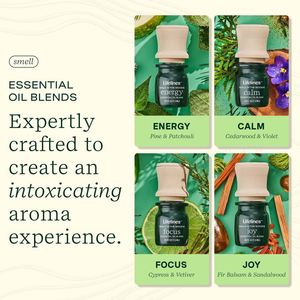 Lifelines Essential Oil Blend Set in Walk in the Woods: All the blends in this collection evoke rich, verdant forests and velvety moss underfoot. 4-pack. Not compatible with our ClickWick Plant, Candle, or Shower diffusers. Invigorating Aroma: Joy features Fir Balsam and Sandalwood. Energy features Pine and Patchouli. Focus features Cypress and Vetiver. Calm features Cedarwood and Violet. Mess-Free Precision Pump: Dispense the perfect amount every time with no guesswork and no mess. NOT compatible with our ClickWick Candle, Plant, or Shower diffusers, which require ClickWick Essential Oil Blends. One-of-a-Kind Gift: The perfect gift for the person who has everything. Great for anyone looking to unwind and relax with delightful scents. Only the Good Stuff: Essential Oil Blends were created for an aroma experience using pure essential oils and botanicals sourced from around the globe. Free from parabens, phthalates, and dyes. Sensory Immersion: The practice of activating your senses. Seeing, smelling, and touching delightful things brings you back to the here and now. Let your senses work their magic. About Lifelines: Lifelines was created to help people enhance their well-being in fast, effortless, and fun ways. Meet the tools designed to help you relax and unwind anytime, anywhere.