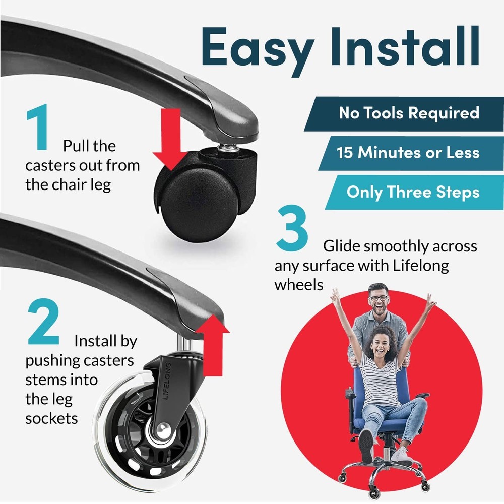 Lifelong Original Office Chair Wheels (As Seen On CNN) Replacement Rubber Chair Casters for Hardwood Floors and Carpet, Set of 5, Heavy Duty Casters for Chairs to Replace Office Chair Mats - Fits 98% Product Details Color: Clear Size: 3 Inch Brand: Lifelong MPN: BL-2374 UPC: 739027542810 EAN: 0739027542810 Color: Clear Brand: Lifelong Material: steel, precision ball bearings, polyurethane Unit Count: 5 Count Item Weight: 2.76 Pounds Mounting Type: Stem Mount Load Capacity: 650 Pounds Caster Type: Swivel Surface Recommendation: Multi-Surface Wheel Width: 1 Inches UPC: 739027542810 Item dimensions L x W x H: 6 x 3 x 4.5 inches Manufacturer: Lifelong Product Dimensions: 6 x 3 x 4.5 inches Item Weight: 2.76 pounds Item model number: BL-2374 Date First Available: May 25, 2016 THE LAST OFFICE CHAIR WHEELS YOU'LL NEED Not all chair casters are created equal. Our heavy-duty chair wheels are made of industrial-grade steel, precision ball bearings, and durable polyurethane chair casters. They are extremely resistant to compression and wear. They can withstand long-term daily use without being damaged or deformed, providing long-term stable support for your rolling chair. DESK CHAIR MAT WILL NOT BE NEEDED ANYMORE Our desk chair wheels replacement will NEVER scratch, smudge or damage your floors. Enjoy a carefree, safe glide across wood, laminate, vinyl, tile, mat, carpet and hardwood floors all day long. P.S. Regarding the smooth rolling on carpet it depends on the pile carpet that you have, some roll better and some arent as smooth. High pile carpet usually rolls less smooth than low pile. REPLACEMENT FOR MOST OFFICE CHAIRS Rest assured that our office chair wheels are compatible with almost any rolling chair (please check the size of your wheel stubs before ordering). IMPORTANT: NOT compatible with IKEA chairs and not either with some off brand chairs. (our stem size is 7/16" x 7/8") SMOOTH GLIDING IS AS QUIET AS A MOUSE A squeaky, rickety office chair wheel is a telltale sign that theyre cheap and poorly made. Youll slide and glide around in total silence with our roller casters. RELIABLE HEAVY-DUTY CASTERS This uniquely designed office chair wheels are carefully crafted from strong materials and has extremely powerful load-bearing performance, which can bear up to 650 pounds. These rubber chair wheels can easily cope with various usage conditions, providing sturdy and reliable load-bearing protection for your office activities and daily life.