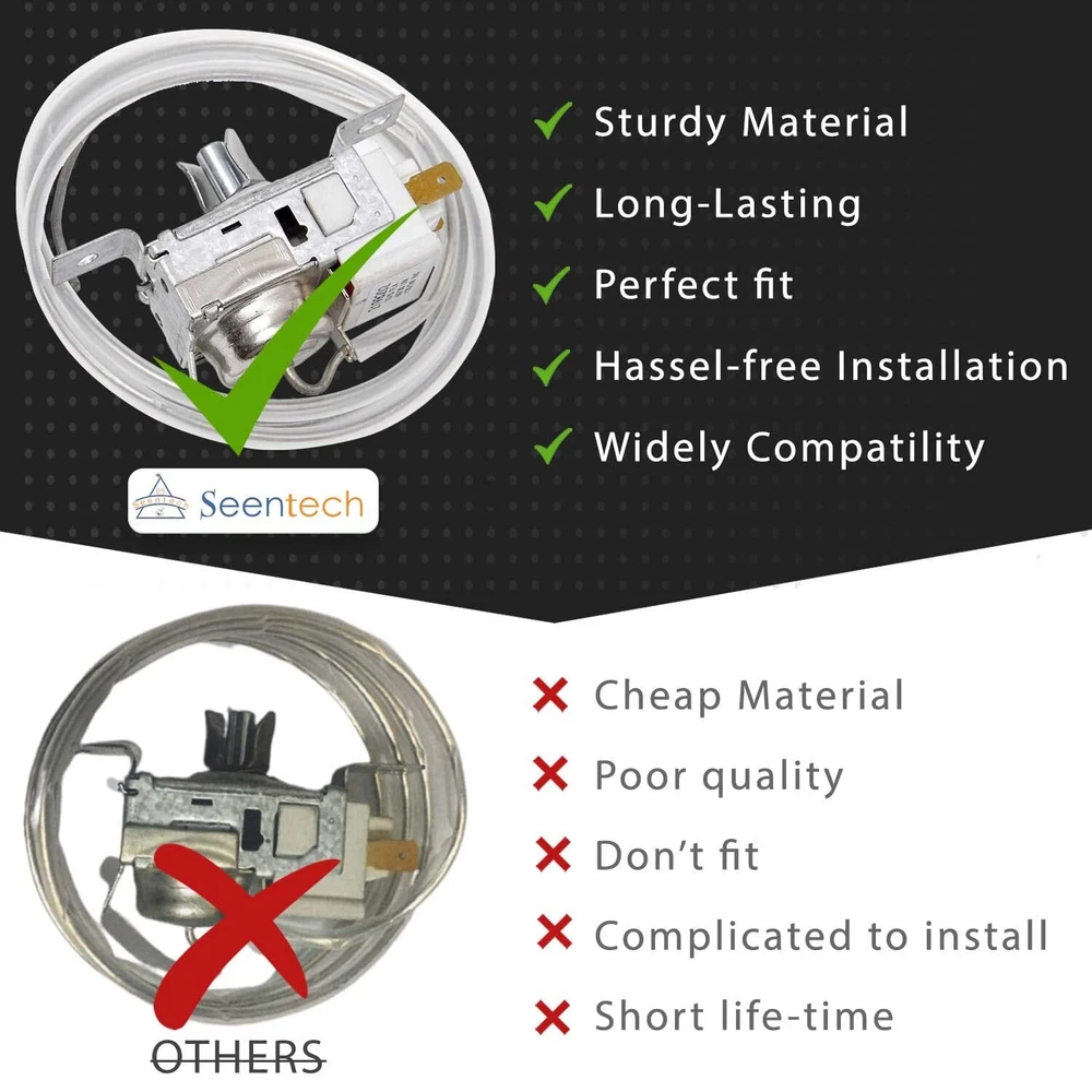 The 2198202 Refrigerator Cold Control is used in refrigerator units and freezers as a sensor. The thermostat senses the temperature increase in the evaporator during the cycle of defrosting and turns off when ice is melted. The tools needed for this repair project is a putty knife, Phillips and flat blade screw driver, 1/4 inch nut driver, and needle nose pliers. Remember to unplug refrigerator from power source as a safety precaution. Replaces part numbers: PS11739232, WP2198202VP, WP2198202, AP6006166, 1110552, 1115242, 1115243, 1115244, 1115245, 1129437, 2161283, 2161284, 2169112, 2169113, 2198201, 99989726, PS329884, AP3037004, etc. Works with most top name brands: Whirlpool, Kenmore, Sears, Roper, Estate, Crosley, Inglis, KitchenAid, Maytag, Amana. Works with the following models: 2VED27TKN00, 3ED22DQXAN00, 3ED22DQXBW03, 3ED22DQXDN03, 3ED22RQXXW00, 3ED25DQXDN00, 3ED27DQXBW00, 3KART700GW01, 3VED23DQEW0... 106.52574200, 106.55122700, 106.58289990, 106.5858782, 106.59512290, 106.5951799, 106.59782290, 106.85500510, 106.8590293, 106.859472, 106.94000080β¦ Fixes the following symptoms: Will Not Start. Fridge too warm Freezer section too warm Fridge too cold Please reach out to us if you have a question about compatibility. Comment below in the customer questions and answer section or send us a message on the Seentech storefront. Weβre happy to help ensure you select the right part number for your Refrigerator MODEL NUMBER: 2198202 Refrigerator Cold Control Thermostat EASY TO INSTALL: Brand new refrigerator temperature control replaces Whirlpool, Kenmore, Roper, Estate, Crosley, Amana, Inglis REPLACES PART NUMBER: 1110552, 1115242, 1115243, 1115244, 1115245, 1129437, 2161283, 2161284, 2169112, 2169113, 2198201, 99989726, WP2198202, WP2198202VP, PS11739232, AP6006166.. Works with the following models: Whirlpool - 2VED27TKN00, 3ED22DQXAN00, 3ED22DQXBW03, 3ED22DQXDN03...Kenmore0,0,0,,0... EASY TO INSTALL: Forget the repairman. Remove and replace the cold control thermostat in under an hour. You just need a Philips screwdriver, quarter-inch nut driver, and a small flathead screwdriver. ππ’π‘πππππ‘π§ π£π¨π₯ππππ¦ππ¦: Enjoy a 30-day return window on your purchase. Your satisfaction is our priority. If you have any questions, please don't hesitate to contact our customer service team.
