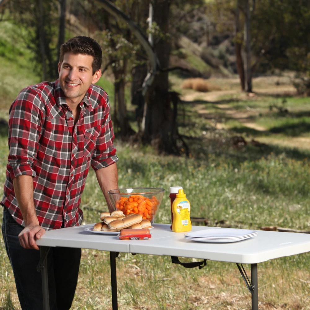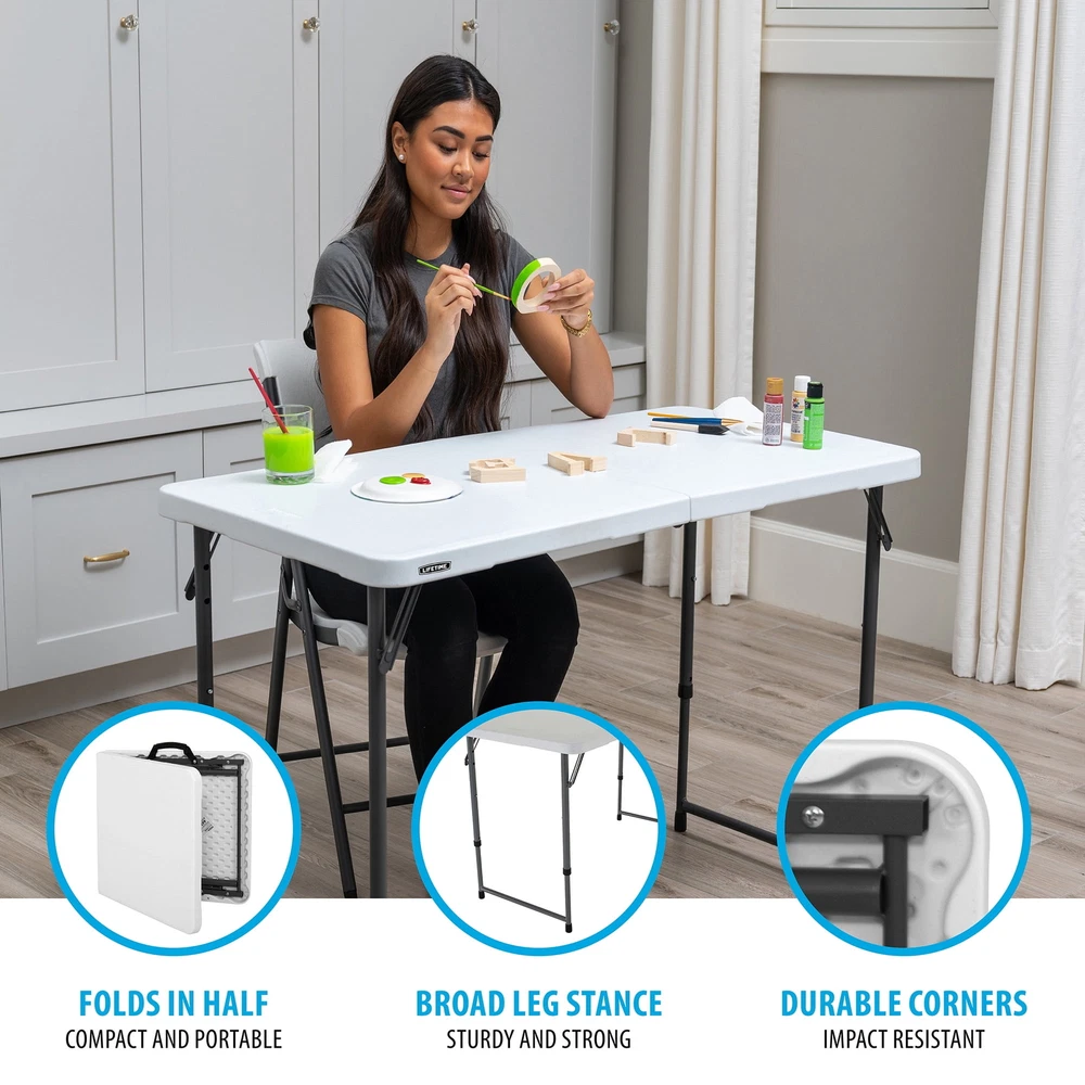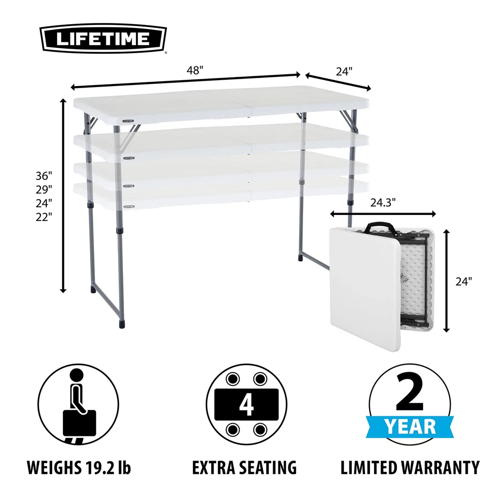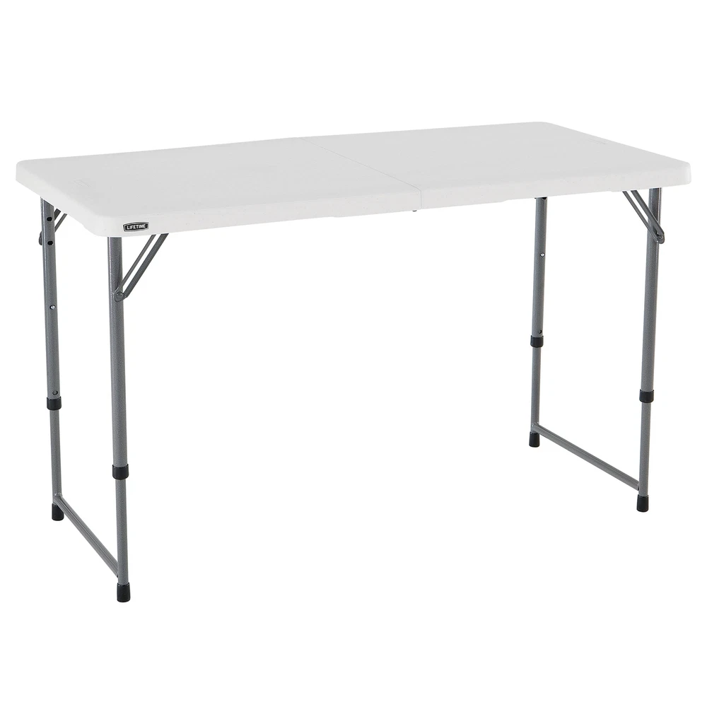 Lifetime 4-Foot Light Commercial Adjustable Fold-In-Half Tables are constructed of high-density polyethylene and have four adjustable height settings. They will not crack, chip or peel, and are built for indoor and outdoor use. The patented steel frame design provides a sturdy foundation and is protected with a powder-coated, weather-resistant finish. Lifetime's Fold-In-Half Tables are perfect for your home, office, outdoor activities and more! On Nov 5, 2024 at 20:06:07 PST, seller added the following information: