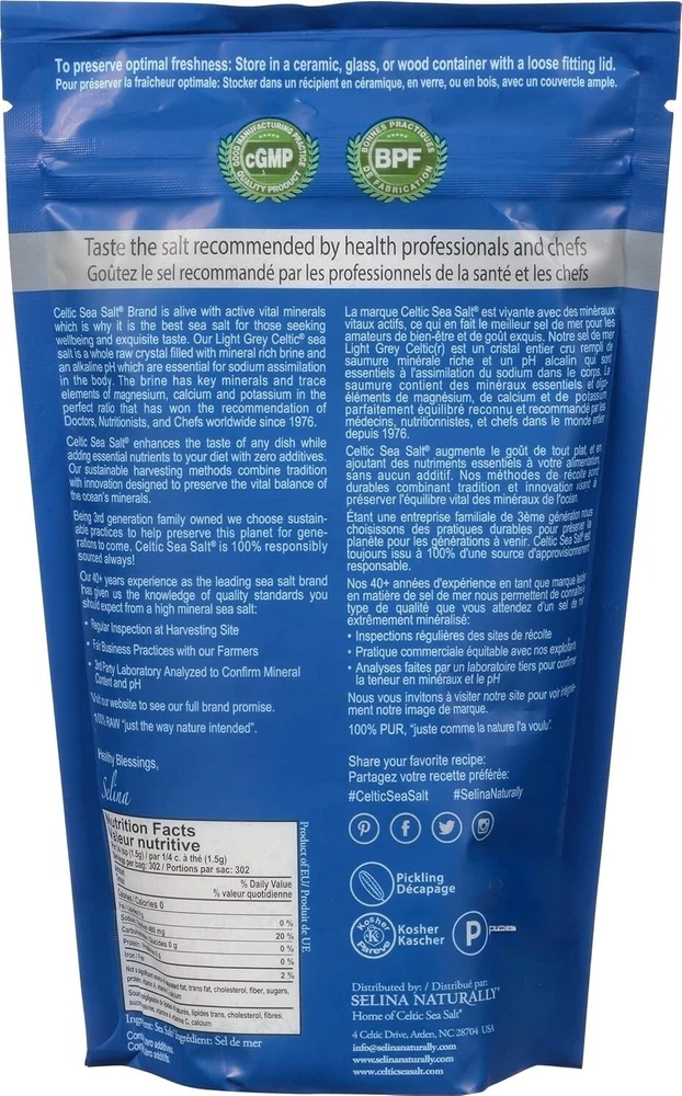 Light Grey Celtic Sea Salt 1 Pound Resealable Bag Gluten-Free, Non-GMO Verified Flavor Kosher Brand Celtic Sea Salt Item Weight 1 Pounds Specialty Additive-free,Gluten-free,Kosher,Natural,No Additives,Specialty,Vegetarian Unit Count 8 ounces Perfect for cooking, baking and more, our Light Grey Celtic Sea Salt one-pound resealable bag is a must for every kitchen. It’s the perfect choice to use to fill a ceramic grinder or keep in your pantry for all your cooking and baking needs. Celtic Sea Salt is authentic, unprocessed whole salt from pristine coastal regions. It’s all natural, with no additives or processing. Additionally, it’s a nutritious choice you can feel great about. Our classic salt is more nutritious than table salt, because it retains the natural balance and spectrum of essential minerals, supplying the body with over 74 vital trace minerals & elements. A sprinkle of this sea salt is a healthy addition to any recipe! Light Grey Celtic salt is a mineral-rich, whole crystal (coarse), moist salt that is completely unrefined and hand harvested. Dried by the sun and the wind, it retains the ocean’s moisture and locks in a vast array of vital trace elements. Light Grey Celtic gets its light grey hue from the pure clay lining of the salt beds where it is harvested. This salt is also non-GMO Verified, certified Kosher, lower in sodium and paleo-friendly. Celtic Sea Salt is the original and most trust brand of sea salt, and is referenced in more culinary and nutritional books and journals than any other salt in the world. Since 1976, we’ve grown into a national and worldwide brand that has been recommended by doctors and nutritionists for its unique health benefits and by chefs for its unique taste. Free Shipping We offer FREE shipping on all orders! We ship within Three business days of payment, usually sooner. Local pickups and combined shipping options are not provided at this time. Free Return You can return a product for up to 28 days from the date you purchased it. Any product you return must be in the same condition you received it and in the original packaging. Please keep the receipt. Feedback Customer satisfaction is very important to us. If you have any problem with your order, please contact us and we will do our best to make you satisfied. Contact Us If you have any queries, please contact us via ebay. We usually respond within 24 hours on weekdays. Please visit our eBay store to check out other items for sale! Happy Shopping!