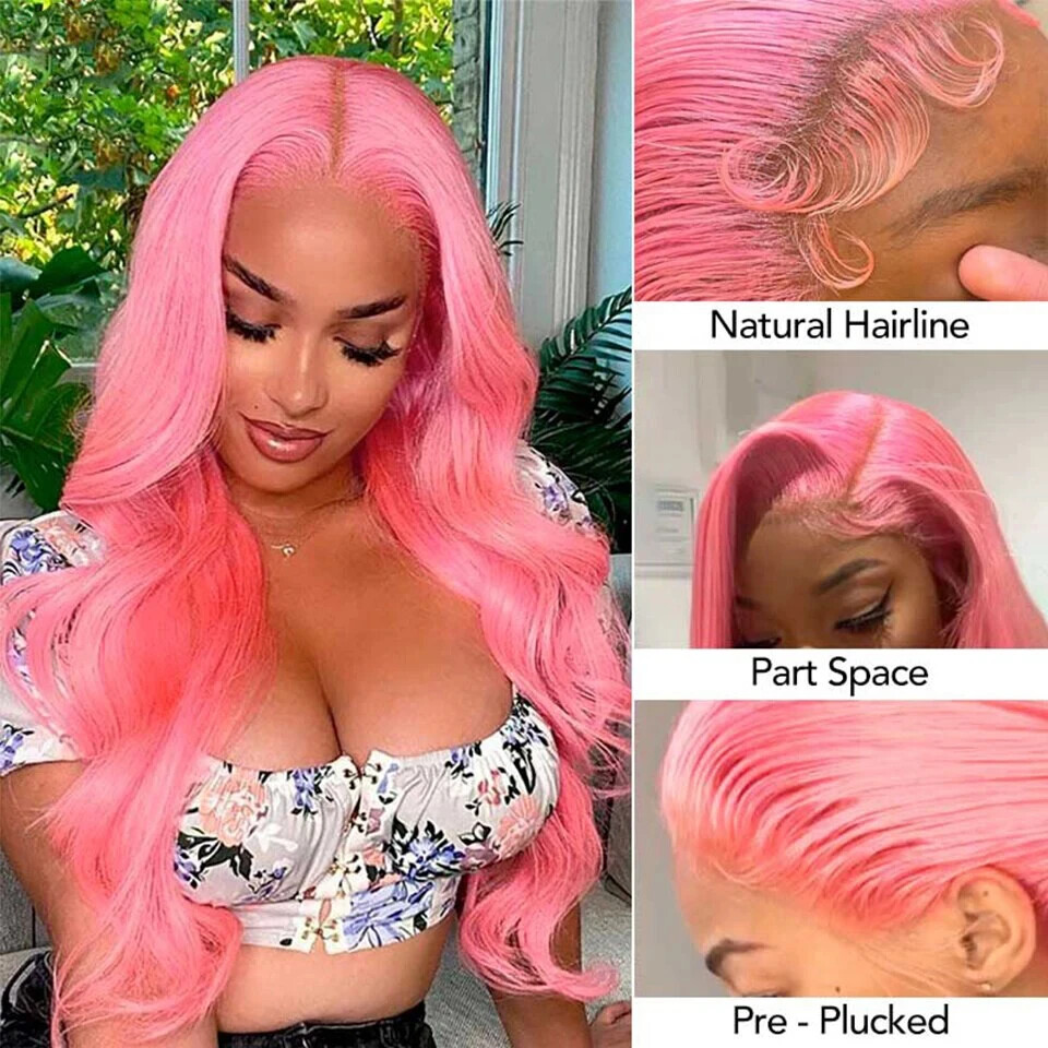 Product Information: Name: Pink Lace Frontal Body Wave Wig Lace Size: 13X4 13x6 Lace front wig Density: 180% 200% Wig Parting: Free Parting Cap Size: Medium Size Hairline: Pre Plucked Lace Color: Medium Brown Shipping Time: 3-5 Days worldwide Free Shipping