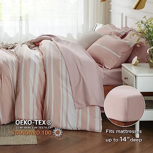 Return Policy Fast Delivery Trusted seller Light Pink Comforter Set Queen 7 Pieces, Light Pink White Striped Bedding Sets All Season Bed in a Bag, 2 Pillow Shams, Flat Sheet, Fitted Sheet and 2 Pillowcases Product Description OEKO-TEX Certified: This queen size bedding set is Standard 100 by OEKO-TEX certified for meeting high safety standards and is free from harmful materials, providing sleepers with assured quality. Easy Care: The double stripe queen comforter set is easy to clean. Simply machine wash cold without chlorine based bleach and tumble dry low to make it fresh and new again. High-Quality Fill: Our all-season bedding set is filled with a fluffy 240 GSM fiber fill that is extra airy and fluffy, providing a cloud-like sleeping experience to cozy sleepers. Elegant Design: The stripe pattern on this bed-in-a-bag set conveys a modern minimalist appeal that coordinates with various home decor styles, adding more aesthetic and coziness to your bedroom. What You Get: The Bed in a bag queen size complete set includes 1 Comforter (90" x 90"), 2 Pillowcases (20" x 30"), 2 Pillow Shams (20" x 26"+2"), 1 Fitted Sheet (60" x 80" + 14"), 1 Flat Sheet (90" x 102") Shipping Returns Payment Shipping Shipping is FREE to all addresses other than APO/PO boxes in the lower 48 states. All our stock ships from US-based warehouses. Shipped via USPS or UPS (depending on location and package weight) Unless stated otherwise, all orders will ship within 24-72 hours of your payment being processed. Check our feedback to see the great reviews of FAST shipping we offer. Returns Seller does not accept returns Payment We currently accept payment via eBay managed payments only. Once payment is cleared, we will dispatch your shipment within 1-3 business days. Please refer to the "Shipping" tab for more information regarding shipping speed to your destination.