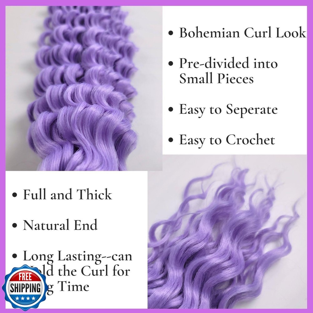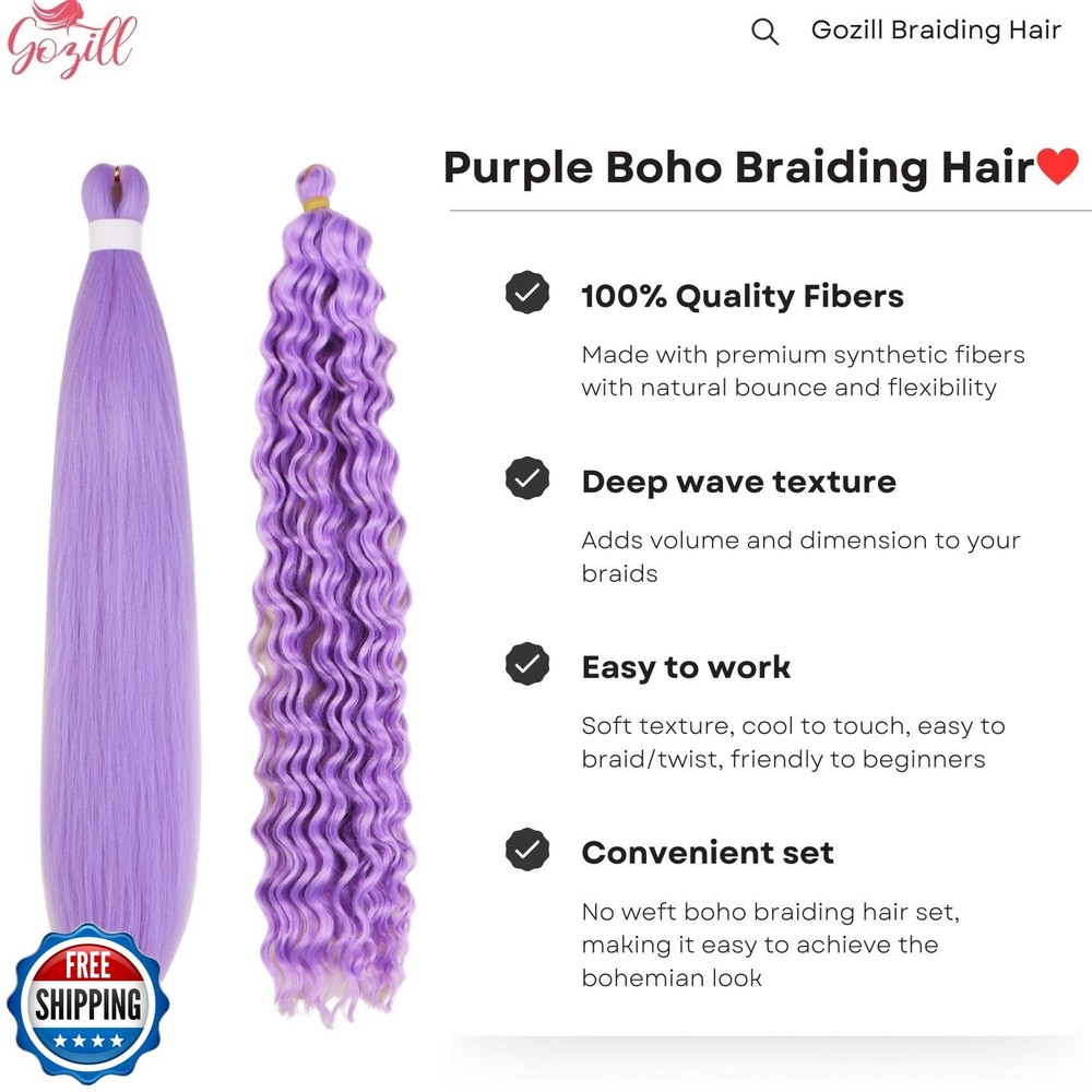 Light Purple Boho Braiding Hair Pre Stretched Knotless Boho Braids Hair Synthetic Deep Wave Crochet Hair for Women(6 Packs) Features Light Purple Boho Braiding Hair, There are 5 Packs Pre Stretched Braiding Hair and 1 Pack Deep Wave Boho Braiding Hair , Total 6 Packs Hair in One Package. The Synthetic Boho Hair Is Made With Quality Low Temperature Fibers, No Weft, Soft to Braid The Boho Braiding Hair Is Soft and Natural, Light Weight to Wear, the Colour Is Fade-resistant and Long-Lasting, Help You Get Charming Boho Braids Look Easily. Easy to Manage, Easy to Braid, Perfect for DIY Boho Braids, Goddess Braids,Knotless Box Braids, Ghana Braids or Creating Intricate or Elaborate Braided Styles. You Will Feel Amazing with the Gozill Synthetic Boho Braiding Hair Set, Try It Now Shipping Free & Fast Shipping: We offer free shipping to most of the USA with a normal delivery time of 3-7 days. However, due to the current situation, additional delivery time (up to 3 weeks) may be required for some items. Alternative Carriers: We may use alternative carriers (e.g., USPS, FedEx, UPS) to ensure your package arrives safely and on time. Due to the use of multiple carriers, we are unable to provide a tracking number automatically. Handling Time: Orders are processed and shipped within 1-2 business days of receiving cleared payment. Shipping Restrictions: Shipping to Alaska, Hawaii, Puerto Rico, Guam, and other US territories may incur shipping charges or delivery restrictions. Please contact us before ordering, or your order can be refunded/cancelled. State Restrictions: Certain items may not be shipped to California due to state regulations. Contact for Tracking Updates: If you require tracking updates or have any concerns about the delivery of your order, please feel free to contact us, and we will be happy to assist you. Return Policy 30-Day Hassle-Free Returns: If you are not completely satisfied with your purchase, you can return the item for free within 30 days of receiving it for a full refund or exchange. Easy Return Process: Contact us, and we will provide you with a prepaid return shipping label and detailed instructions. No Restocking Fee: There are no restocking fees for returns. However, the buyer is responsible for return shipping costs if the return is not due to a seller"s error. Refund Processing: Refunds will be processed within 1 business day of receiving the returned item in its original condition. Feedback Your feedback is extremely important to us. We strive to provide the best products and customer service possible. If you are satisfied with your purchase, please take a moment to leave us a positive review. If you have any concerns or issues with your order, please contact us before leaving negative feedback. We are committed to resolving any problems and ensuring your satisfaction. Contact Us If you have any questions or concerns, please feel free to reach out to our customer support team. You can contact us through the eBay messaging system. We are available Monday to Friday, 9:00 am to 5:00 pm EST, and we will do our best to respond to your inquiry within 24 hours. Thank you for supporting our small family business!