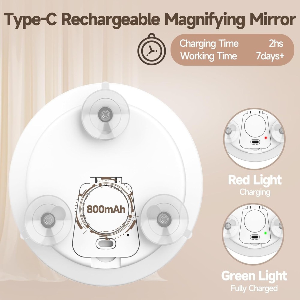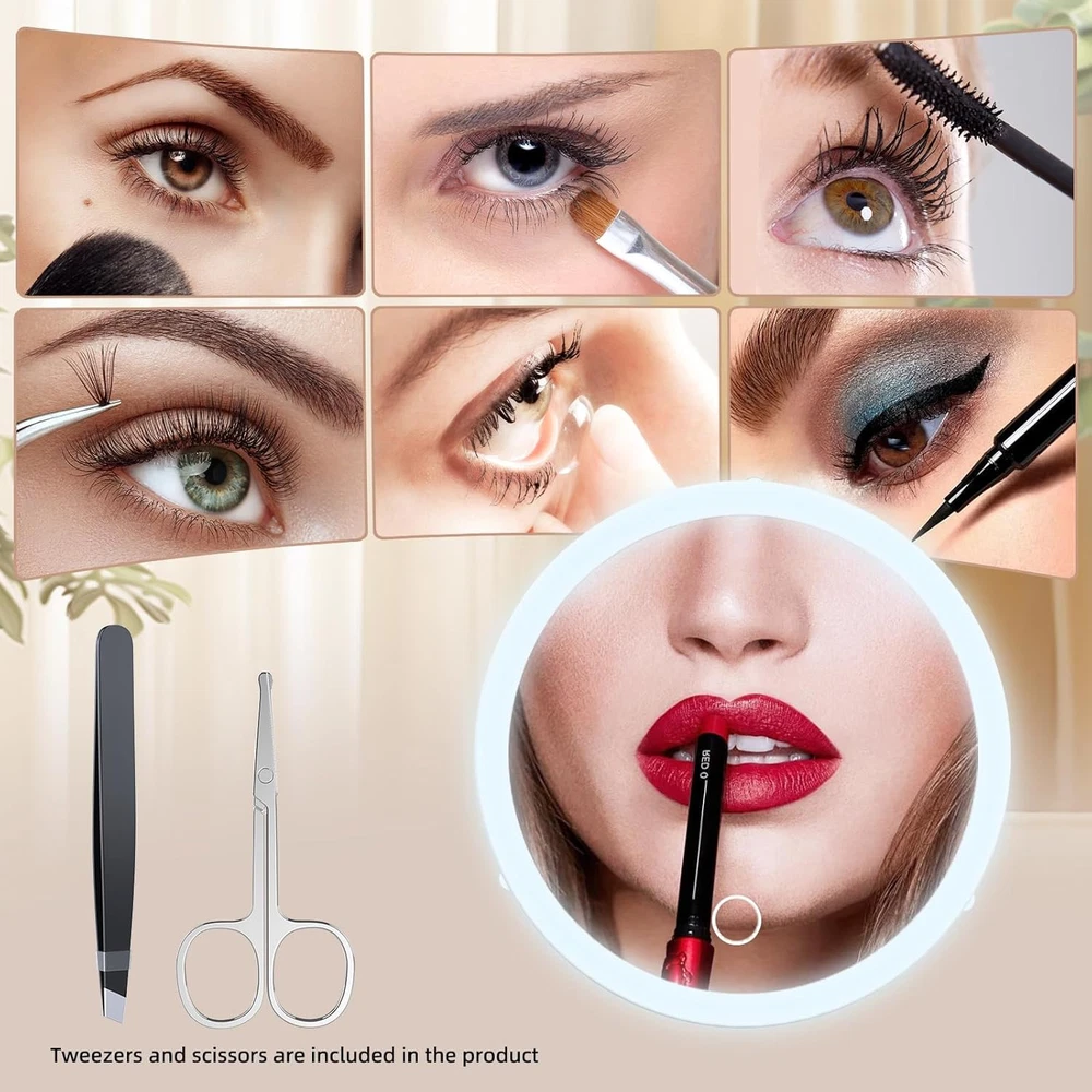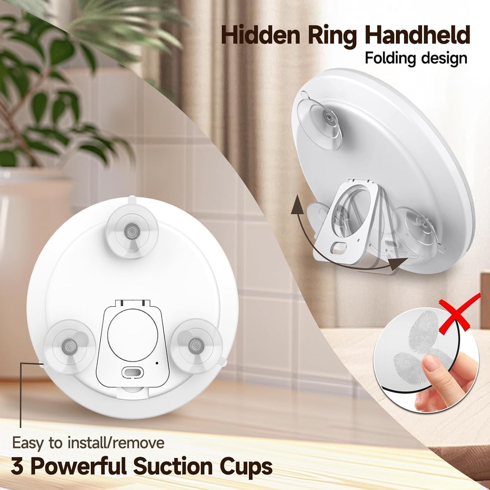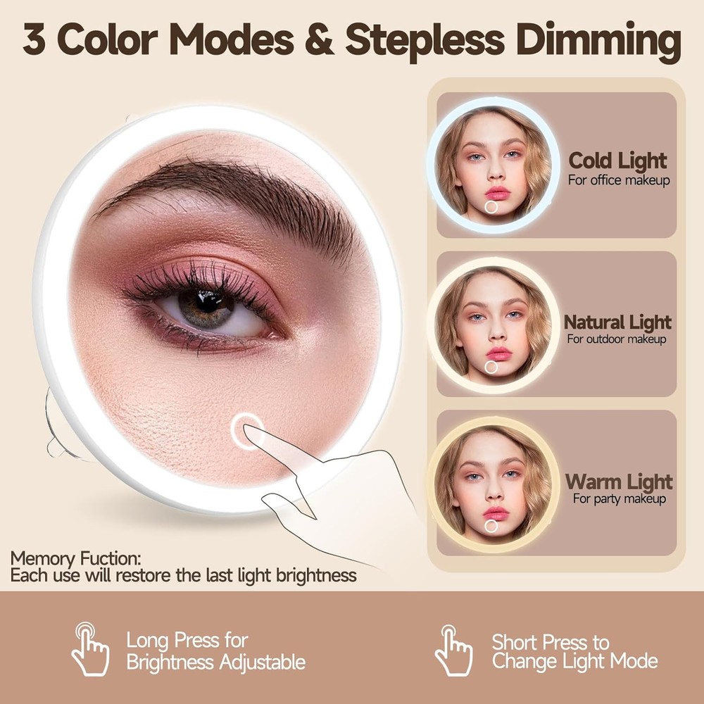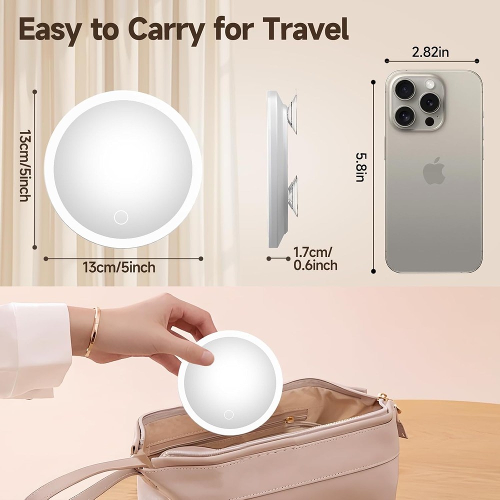 Lighted 30X Magnifying Mirror, Makeup 5"L x 5"W, White-set-30x Product Details Brand: JJhxr Room Type: Bathroom, Bedroom, Home Office, Hotel Shape: Round Product Dimensions: 5"L x 5"W Frame Material: Acrylonitrile Butadiene Styrene (ABS) Style: Magnifying Mirror with Light Mounting Type: Wall Mount,Handheld Finish Type: Polished Surface Recommendation: Glass Special Feature: 30X Magnifying Mirror, Large Size of 5.2inch, 3 Color Dimmable Lighting, Rechargeable ion-battery, 3 Poweful Suction Cups Color: White-set-30x Specific Uses For Product: Shaving, Makeup Number of Pieces: 1 Number of Items: 1 Material: Glass, Acrylonitrile Butadiene Styrene Frame Type: Framed Assembly Required: No Frame Color: White Magnification Maximum: 30 x Manufacturer: huizhoushihuangdoukejiyouxiangongsi Size: 5"L x 5"W Item Weight: 7.4 ounces Country of Origin: China Item model number: 623-L-White-30X-Set Batteries: 1 Lithium Ion batteries required. (included) 【30X Magnifying Mirror with Lights】30x magnifying mirror designed with 3 suction cups and hidden ring handheld bracket. 5-inch compact size perfect for hand-held makeup without worrying about your fingers getting the mirror surface dirty. 3 powerful suction cups also can be firmly onto any smooth, clean, flat surface(glass mirror, metal, and most tiles). 【3 Light Modes & Stepless Dimming】The light up magnifying mirror features 3 color lights: Warm, Natural and Cool settings, you can adjust the lighting and brightness to match any environment. Intelligent memory function can retains the brightness of each color light for easy use next time, saves the trouble of frequent adjustments. 【Makeup 30X Magnifying Mirror】Use this 30x magnified mirror can see more facial details, like applying mascara, lipstick, removing blackheads/blemishes, shaving. And perfect for cataract patients and people over 50s to see face clearly. NOTICE: Please hold the 30x LED magnifying mirror 2-3 inches or closer to your face to avoid dizziness. 【Lightweight & Portable Magnification Mirror】This travel magnifying mirror with light 30x weighs only 128g, 5" diameter, 0.6" thick, is foldable that makes it easy to carry in handbags, makeup bags, backpacks and luggage. Whether you are traveling, camping, attending a party or on a business trip, this portable magnified mirror is a good choice. 【Only Charged Once A Week】Built-in 800mAh rechargeable lithium battery, wireless use, the included USB-C charging cable allows you to conveniently charge this lighted magnifying mirror from any power source, rather than using AAA or something, which makes it an eco-friendly product. (Charging adapter not included) 【Multi-purpose Tweezers&Scissors】This lighted makeup magnification mirror comes with slanted tweezers and grooming scissors, you can trim your eyebrows to make them more neat and beautiful. It is made of durable stainless steel, not easy to rust, feels smooth and comfortable, and can help you complete some details during makeup.