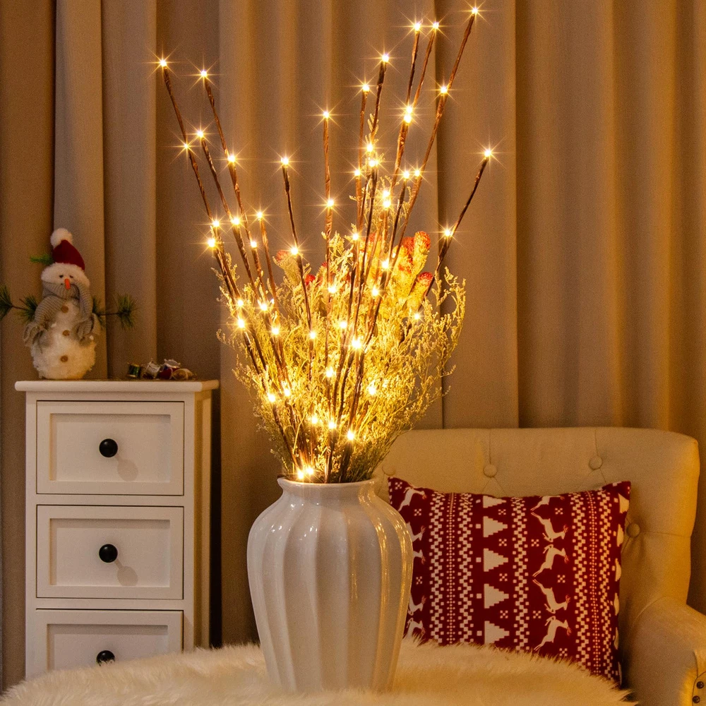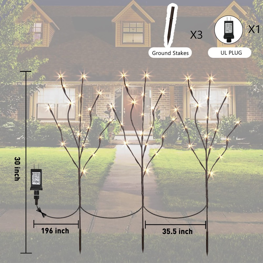 TWIG LIGHTS: Including 3PK branches, 3 ground stakes, and 1 UL plug, 60LT warm white light illuminates together, making people feel warm WILLOW BRANCH: Well-designed and made as an artwork, brown bark texture covered,which is more vivid and natural, Christmas decorations DIY GIFT: You can bend it a bit with little effort to create your own natural look UL CERTIFICATION: This Branch Lights has (12V 3.6W)UL approved plug in transformer and it is very safe during use HOME DECOR: Suitable for home indoor and outdoor decoration, equipped with 3 ground stakes that can be installed on courtyard paths to illuminate your way home; It can also be placed in a vase as a decorative light for Mother's Day, Father's Day, Birthday, Christmas, exhibition halls, galleries, and any room at home, creating a festive and eye-catching atmosphere