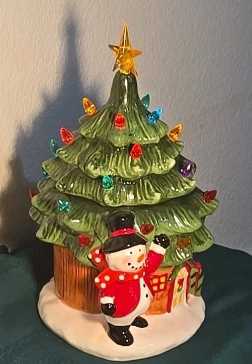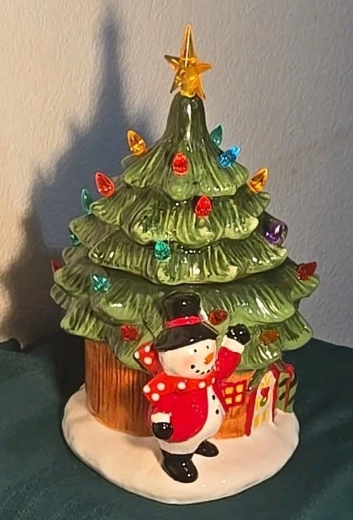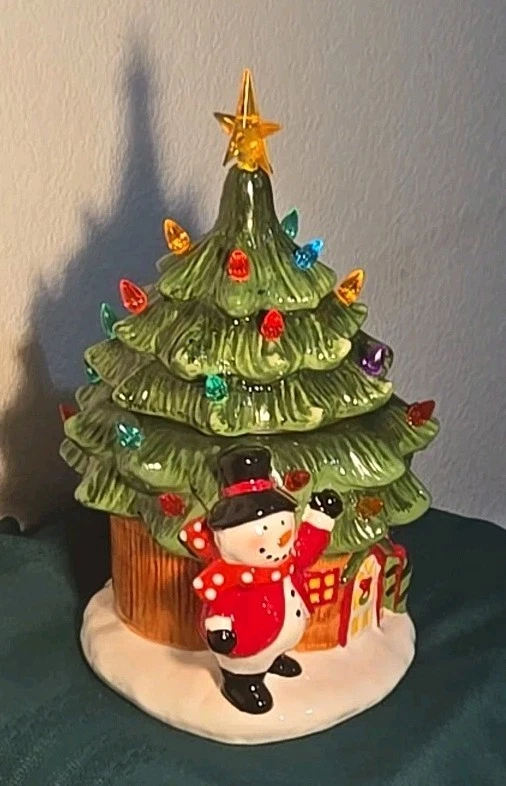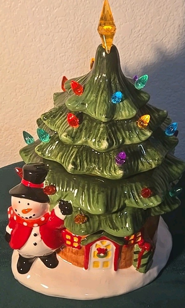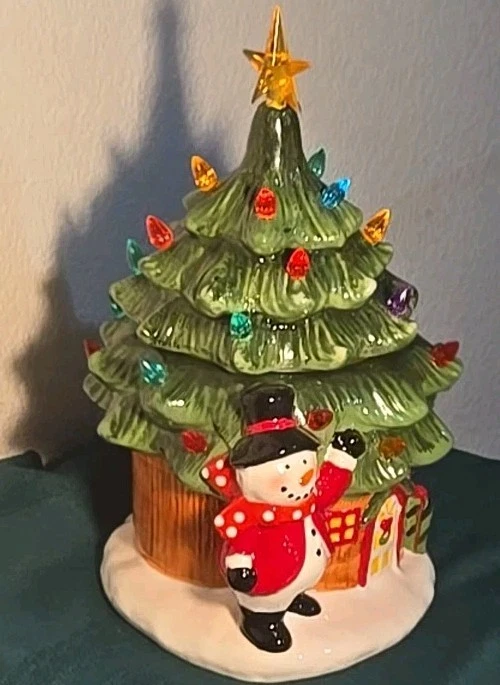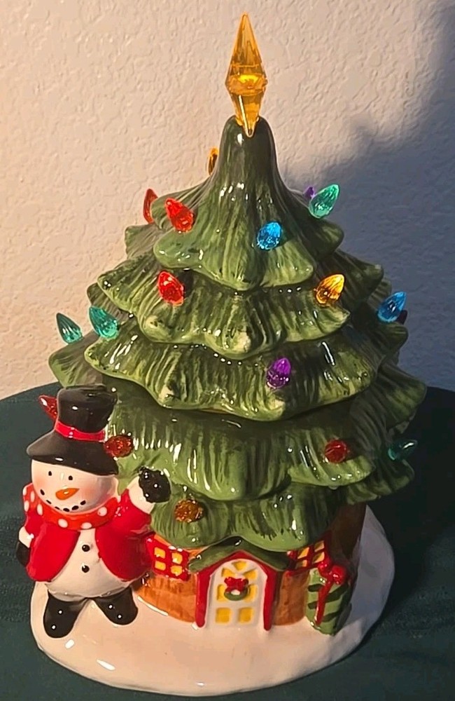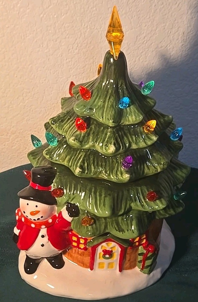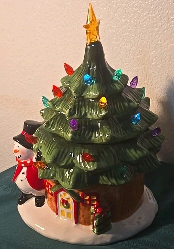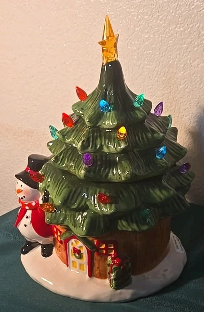 The Lighted Christmas Tree House Cookie Jar is a festive and unique collectible item perfect for the holiday season. Made of ceramic, this jar features a whimsical design of a Christmas tree house, complete with a lighted bulbs for added charm. Ideal for storing cookies or other treats during the holiday season, this decorative piece adds a touch of magic to any home's kitchen or dining room.