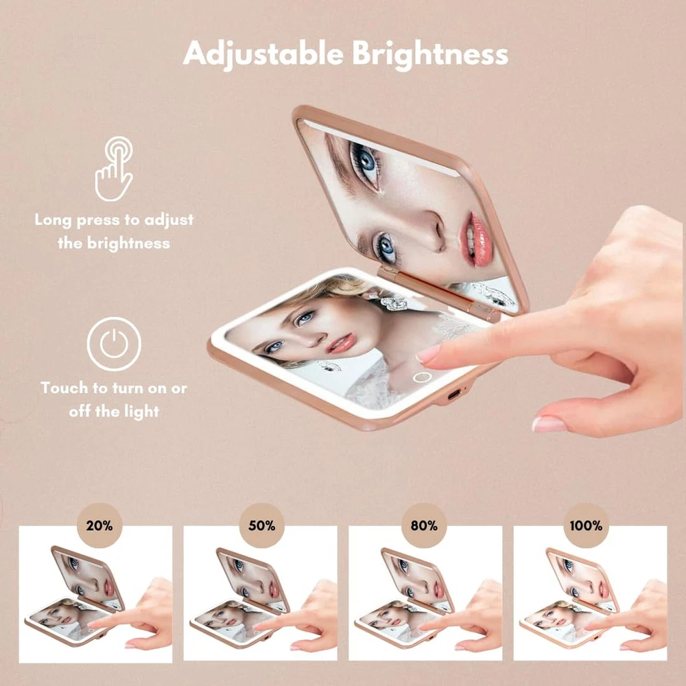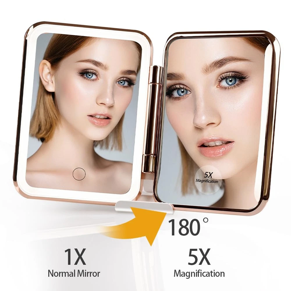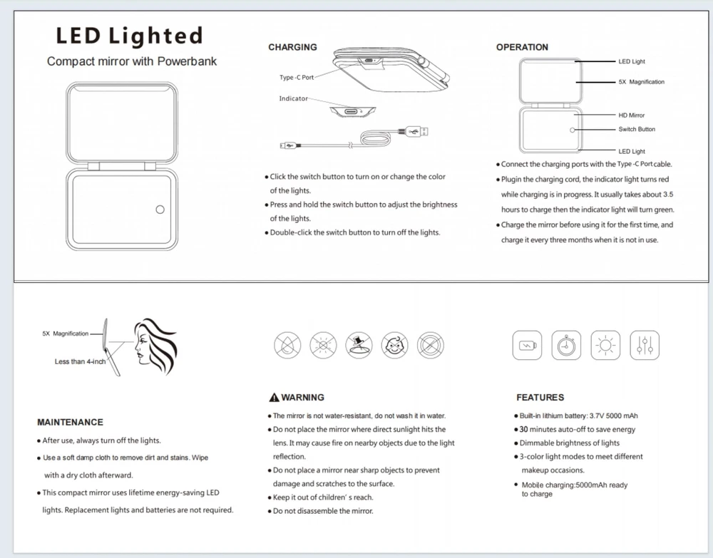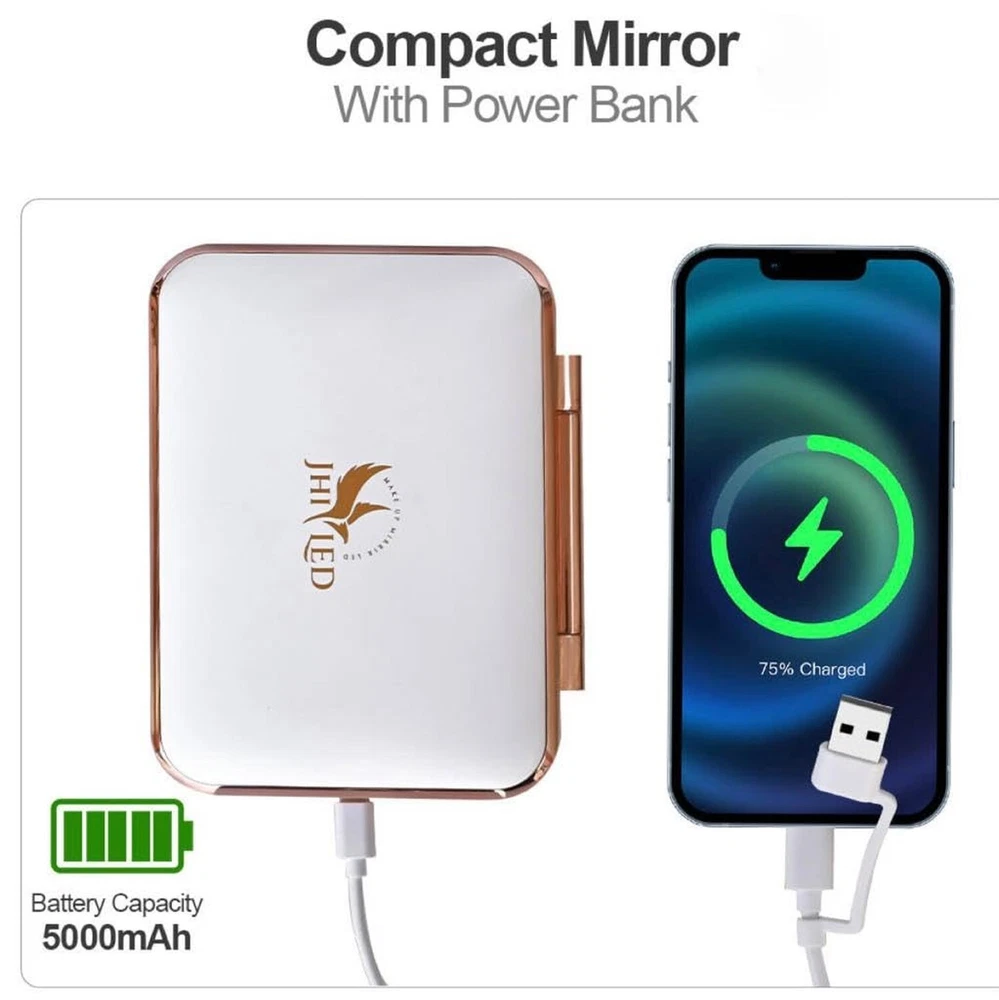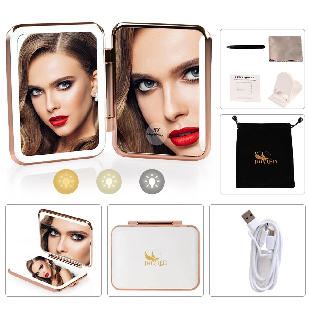 Lighted Magnifying Mirror &Power Bank Charger-Travel Magnifying Mirror with Light Travel Mirror -2 in 1 Portable Charger & Compact Mirror with LED Light- Travel Makeup Mirror +Charger+ Tweezer Product Details Brand: JHI LED Room Type: Portable Shape: Rectangular Product Dimensions: 3.86"L x 5.43"W Frame Material: Mirror Brand: JHI LED Room Type: Portable Shape: Rectangular Product Dimensions: 3.86"L x 5.43"W Frame Material: Mirror Style: Modern Mounting Type: Easy Finish Type: Excellent smooth finish in white with beautiful gold details Surface Recommendation: Indoor / Outdoor Special Feature: Multifunctional LED Mirror with Built-in Power Bank Color: White Theme: Luxe, Beautiful, Easy to use, Modern Specific Uses For Product: For makeup and face care Number of Pieces: 5 Number of Items: 1 Material: Mirror Frame Type: Framed Assembly Required: No Frame Color: White with gold details Magnification Maximum: 5 x Manufacturer: JHI LED UPC: 197644187225 Item Weight: 1.57 pounds Country of Origin: China Item model number: 2057A Date First Available: November 25, 2023 STUNNING DESIGN: Immerse yourself in the elegance of the Luminous Reflection Mirror. Its compact design is not just an accessory but a statement piece that complements your style. CRYSTAL-CLEAR VISION: Enjoy the clarity of your reflection with the exceptional mirror quality. Whether checking your makeup or observing details, our mirror ensures accuracy and sharpness. VERSATILE LED ILLUMINATION: Choose your light, set the mood! With warm white, neutral, and cool white tones, the built-in LED lights provide optimal illumination for any environment, ensuring you shine wherever you are. BEAUTY ON THE GO: Your beauty routine doesn't wait, and neither should you. The Luminous Reflection Mirror comes with a stand for hands-free use, making it easy to maintain your radiance even in the midst of a bustling day. MULTIFUNCTIONAL MARVEL: Unleash the POWER BANK of 5000mAh! Charge your devices effortlessly with the built-in Power Bank feature. Accompanied by USB cables, a tweezer for precision, and a sumptuous velvet pouch, it's a complete beauty toolkit ready to accompany you on your adventures.