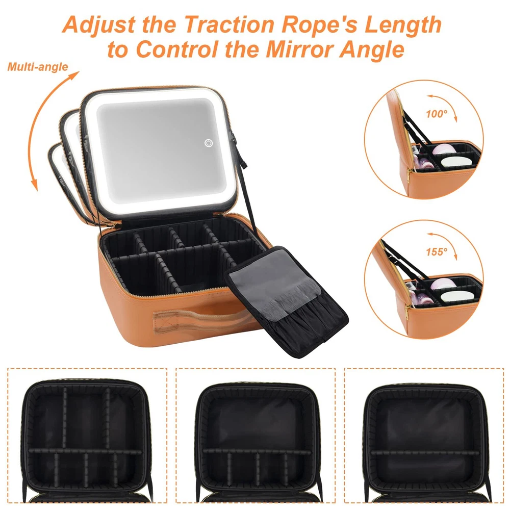 Jadazror Makeup Case, Lighted Mirror, Travel, Waterproof, Brown 【Revolutionary Travel Companion】Large capacity cosmetic storage compartment, large makeup brush storage board, no dazzling high-definition makeup mirror, with 3 color adjustable lighting modes, giving you the freedom to make up comfortably whenever wherever. Jadazror makeup bag with mirror and lights is the perfect for travel. 【Makeup Mirror with Fill Light】Travel makeup bag includes a 9.06*7.88 inch full-screen light mirror. Long press the switch to adjust light brightness from 0% to 100%, and gently touch the switch to easily adjust color temperature between cold light, natural light and warm light. Built-in 2000mAh rechargeable lithium battery, according to the daily makeup time of 30 minutes, a single charge will last about a week. 【Partitionable Portable Dresser】Lighted makeup case upgraded storage space(10.63*9.45*4.33 inch), hard partitions and lined surface can well fixed and protect the cosmetics inside. 6 adjustable EVA dividers, 10 makeup brushes slots, enough to DIY layout as needed to fit lipstick,eye shadow,brush and other cosmetics. And the adjustable strap can control multiple angle mirror for easy makeup. 【10X Magnifying Mirror As a Gift】The detachable 3.5 inch 10X magnifying mirror comes with our makeup organizer bag which works excellent for applying eyeliner or mascara, lining and defining the eyebrows, putting on contact lenses, and other beauty and skincare needs. You can see the face for every detail so that you can enjoy meticulous makeup. A must have for travel or business trips. 【Durable Leather Material】Makeup case with mirror is made of premium synthetic PU leather fabric, waterproof, shockproof, dustproof and easy to wipe clean. Double zippers are controlled by high standards from chain cloth selection, sprocket arrangement, polishing, electroplating, and subsequent oil sealing and waxing processes to ensure smoother pulling. This cosmetic case is also the perfect choice as gifts. SHIPPING Domestic Buyers - We have confidence in our products, but if you are not fully satisfied please contact us within 30 days of purchase and you will get full refund. - We ship within 3 business days of payment, usually sooner - We offer FREE shipping on all orders! - We only ship to the lower 48 states, no APO/FPO addresses or PO Boxes allowed International buyers – please note: Import duties, taxes, and charges aren't included in the item price or postage cost. These charges are the buyer's responsibility. - Please check with your country's customs office to determine what these additional costs will be prior to bidding or buying. * Order Cancellation Policy ** You can return a product for up to 30 days from the date you purchased it. 1. The seller reserves the right to cancel the special case only due to eBay cancellation fee. 2. The decision of seller is the final. 3. The seller will respond to the cancellation request within 2 business days. Please wait for the result of cancellation. 4. In case the cancellation is not completed by some reasons, the buyer can follow the options below to get the refund. 4.1 The buyer can reject the item when it arrives. 4.2 The buyer can send the item back to the seller within 30 days If the buyer receives item (USA Shipment ONLY). The seller will provide the FREE return label to the buyer when the buyer opens " Return Item" case on eBay by using the reason as "Change my mind" ONLY. 5. When buyer has placed the order. The order will be processed and completed by automatic warehouse system within 5 minutes. In case that buyer sends the cancellation request after 5 minutes of placing the order, the request will be rejected. **Sending direct message to cancel the order is not allowed for every case.* Return Policy For the return case - If buyer would like to return the items for refund or replacement, please CONTACT SELLER to receive the free return label from seller. The refund or replacement will be processed with the tracking number of return label which is provided by seller only. The other ways of return which are not approved by seller will not be processed for the refund or replacement.