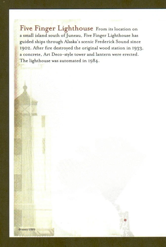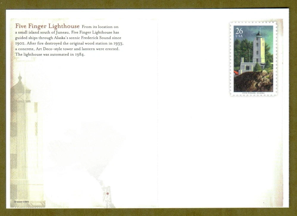 Unposted Lighthouse Five Finger, Alaska Postcard UA, UP Pre-stamped First lit 1902 Stands 68 feet tall Picture postcard from USPS Pacific Coast Lighthouse series of stamps issued 2007 Unposted, Unaddressed Postcard can still be used with additional postage added for current postcard rate Scotts 4147 26 cent stamp Great for scrapbooking Has information regarding the lighthouse on the back of the card Extremely fine condition I am the original owner Smoke free home No rips, tears, smudges, or markings Contact me if you have any questions Please look over the pictures - these scans are exactly the item you will receive From its location on a small island south of Juneau, Five Finger Lighthouse has guided ships through Alaska's scenic Frederick Sound since 1902. After fire destroyed the original wood station in 1933, a concrete, Art Deco - style tower and lantern were erected.
