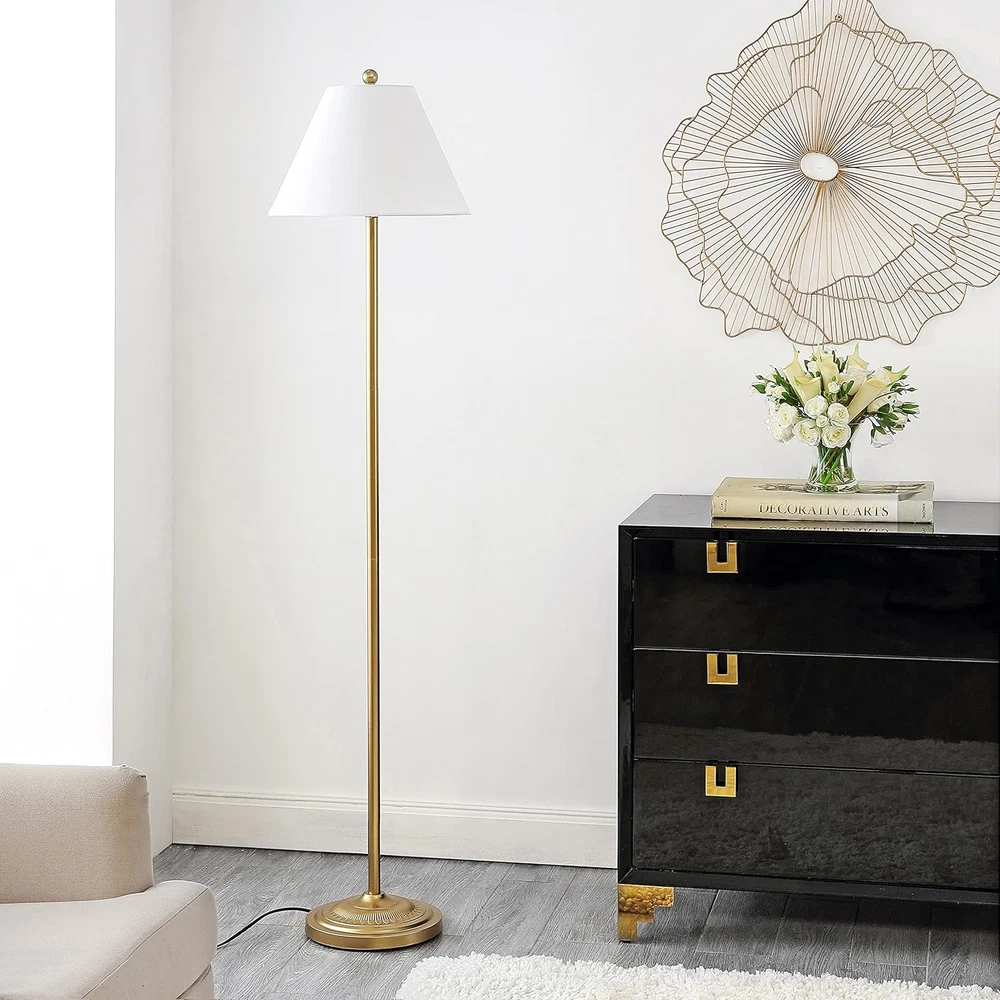 Item Weight: 9 Pounds Lamp Type: Table Lamp Style: Modern Included Components: Floor Lamp Room Type: Living Room, Bedroom gtin13: 711181334050 Mounting Type: Floor Mount Item Package Quantity: 1 Age Range (Description): Adult Number of Items: 1 Installation Type: Freestanding,Tabletop Special Feature: Energy Efficient Material: Metal Item model number: FLL4124B Global Trade Identification Number: 00195058395007 Country of Origin: China Light Source Type: LED Wattage: 9 watts Shade Material: Iron Pattern: Solid Batteries Required?: No Switch Type: Rotary Part Number: FLL4124B Type: Does not apply Base Material: Metal Water Resistance Level: Not Water Resistant Product Dimensions: 16"D x 16"W x 68"H Bulb Base: E26 Warranty Description: N/a. Color: Gold Connectivity Technology: Normal bulb UPC: 711181334050 Brand: Does not apply Size: 16" X 16" X 68" Number of Pieces: 1 Indoor/Outdoor Usage: Indoor Power Source: Corded Electric Is Waterproof: False Shade Color: White Special Features: Energy Efficient Lighting Method: Uplight