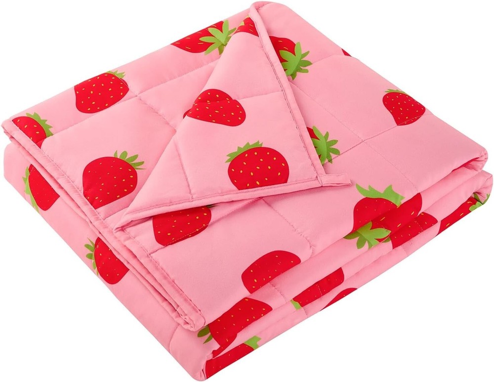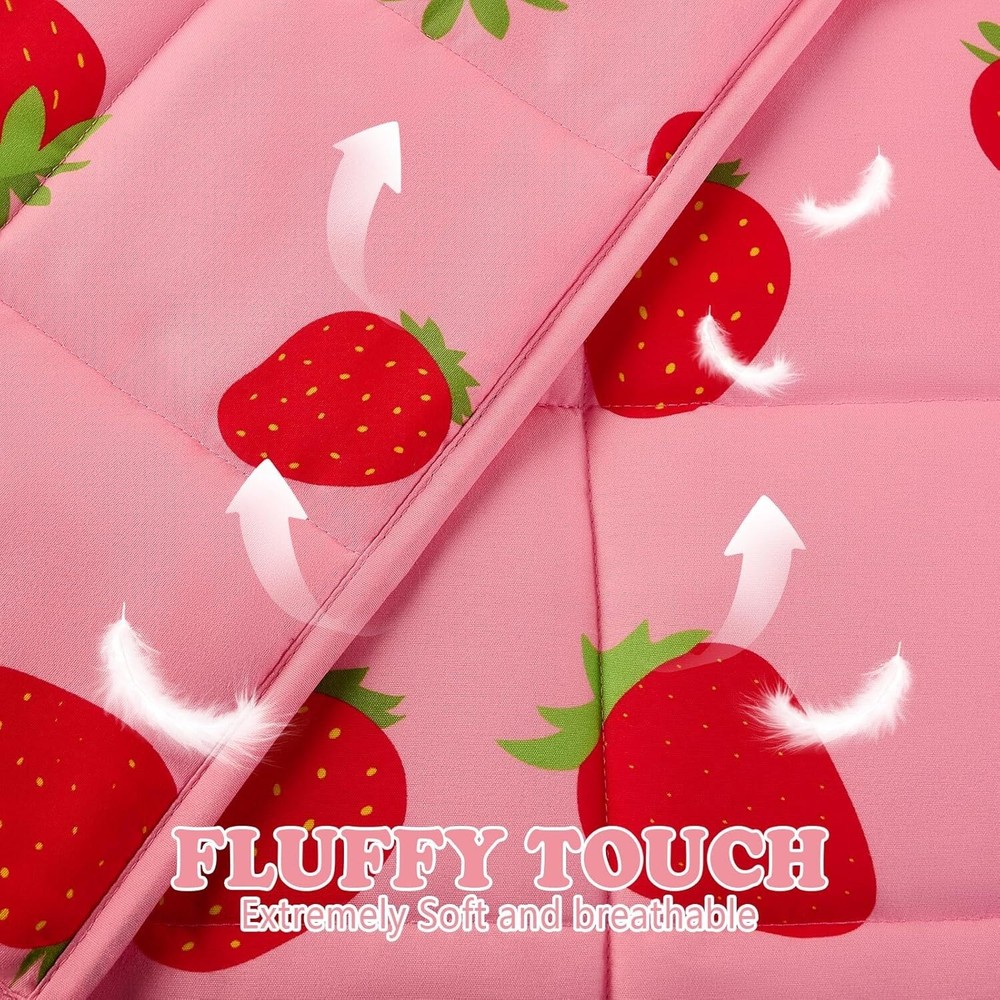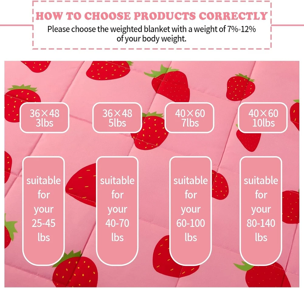 This weighted blanket is a dream! The 10 lbs weight is perfect for relaxation, and the ultra-soft polyester feels cozy without overheating. The adorable strawberry design adds a fun touch, while the sturdy stitching keeps the beads evenly distributed. Love the corner loops for easy attachment—great quality and super cute!