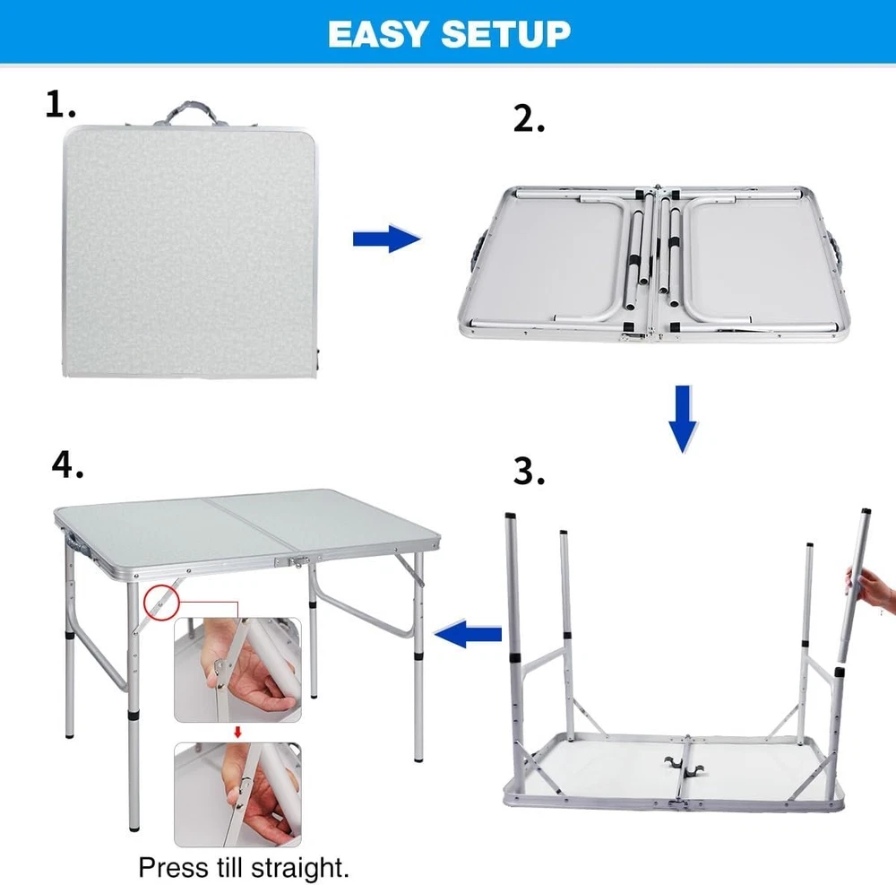 Folding Camping Table Aluminum 3ft Adjustable Height Lightweight Outdoor Picnic ‹ › ‹ › ‹ › ‹ › ‹ › ‹ › ‹ › ‹ › ‹ › Folding Camping Table - Aluminum Adjustable Height Experience the ultimate convenience with our 3ft Folding Camping Table, specially designed for outdoor enthusiasts and home use alike. Key Features: Adjustable Heights: Open size: 36"L x 24"W, adjustable from 15" to 28" to perfectly suit your needs. Convenience: Set up in under 1 minute and easily transport with a convenient carry handle. Lightweight Design: Weighs only 9lbs yet holds up to a remarkable 70lbs, making it ideal for both kitchen and outdoor environments. Multi-Functionality: Versatile use as a picnic table, RV serving table, BBQ station, or small patio table for gatherings. Warm Tips: Keep away from fire, ensure the table is laid on flat ground, and adjust the height by twisting the black feet at the end of the legs. Benefits: Effortlessly adjust the table height to meet your specific requirements. Experience quick setup and takedown for spontaneous gatherings or travelers. Enjoy a stable, lightweight design that can support all your picnic essentials. Perfect for various outdoor activities including camping, fishing, and outdoor concerts. Why choose our Folding Camping Table? Designed for both functionality and elegance, our Folding Camping Table offers adjustable heights to cater to your needs, whether for a relaxed picnic or an outdoor feast. Its lightweight yet sturdy composition makes it easy to transport, while the multi-functionality positions it as an essential companion for every adventure you embark on. Don't compromise on quality or adaptability - make this Folding Camping Table a part of your outdoor gear collection today! Shipping Free & Fast Shipping - We offer free shipping to most of the USA with a normal delivery time of 3-7 days. However, due to the current situation, additional delivery time (up to 3 weeks) may be required for some items. Alternative Carriers - We may use alternative carriers (e.g. USPS, FedEx, UPS, etc.) to ensure your package arrives safely and on time. Due to the use of multiple carriers, we are unable to provide a tracking number automatically. Handling Time - Orders are processed and shipped within 1-2 business days of receiving cleared payment. Shipping Restrictions - Shipping to Alaska, Hawaii, Puerto Rico, Guam, and other US territories may incur shipping charges or delivery restrictions. Please contact us before ordering, or your order can be refunded/cancelled. State Restrictions - There may be restrictions based on your state of purchase. For example, certain items may not be shipped to California due to state regulations. Contact for Tracking Updates - If you require tracking updates or have any concerns about the delivery of your order, please feel free to contact us, and we will be happy to assist you. Return 30-Day Hassle-Free Returns - We want you to be completely satisfied with your purchase. If you are not, you can return the item within 30 days of receiving it for a full refund or exchange. Easy Return Process - To start a return, simply contact us and we will provide you with a prepaid return shipping label and detailed instructions. Restocking Fee - There are no restocking fees for returns. However, the buyer is responsible for return shipping costs if the return is not due to a seller's error. Refund Processing Time - Refunds will be processed within 5 business days of receiving the returned item in its condition. Payment We accept all major credit cards, PayPal, and Apple Pay for your convenience. Your payment information is secure and encrypted to ensure a safe and seamless transaction. Please complete your payment within 3 days of purchase to avoid any delays in shipping. Feedback Your feedback is extremely important to us. We strive to provide the best products and customer service possible. If you are satisfied with your purchase, please take a moment to leave us a positive review. If you have any concerns or issues with your order, please contact us before leaving negative feedback. We are committed to resolving any problems and ensuring your satisfaction. Contact Us If you have any questions or concerns, please feel free to out to our customer support team. You can contact us through the eBay messaging system. We are available Monday to Friday, 9:00 am to 5:00 pm EST, and we will do our best to respond to your inquiry within 24 hours. Buy it now and enjoy a pleasant shopping experience! Folded Dimensions: 24x18x3 Item Height: 28 Inches Item Width: 36 Inches Item Weight: 9 lbs Unit Quantity: 70 Frame Material: Aluminum Tabletop Material: Aluminum Seat Material: Aluminum Set Includes: Table Suitable For: Camping,Picnic,Outdoor,BBQ,Travel Features: Foldable,Lightweight,Adjustable Height Type: Camping Table Color: White Weight Capacity: 70 lb Unit Type: lb