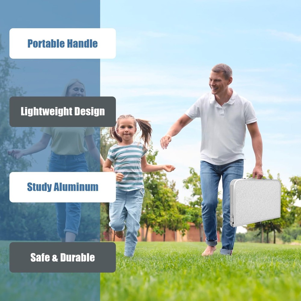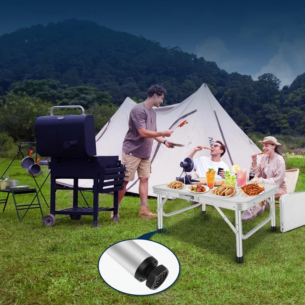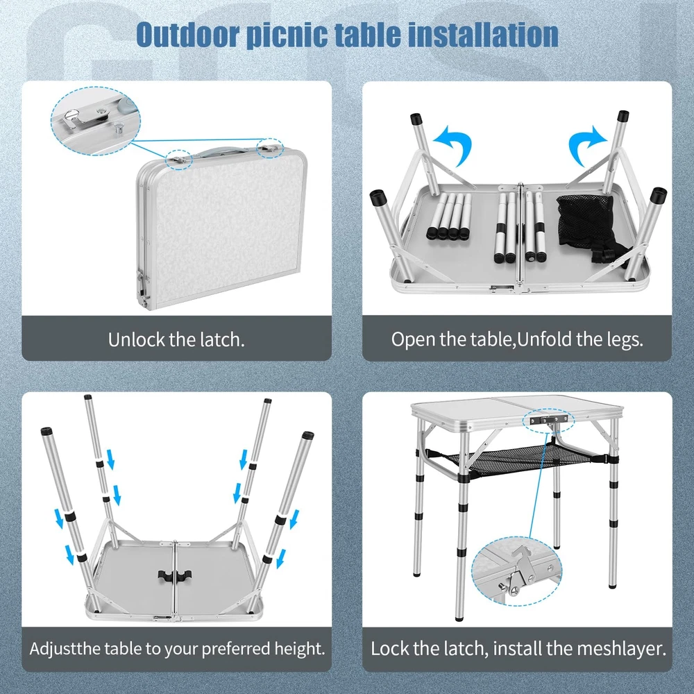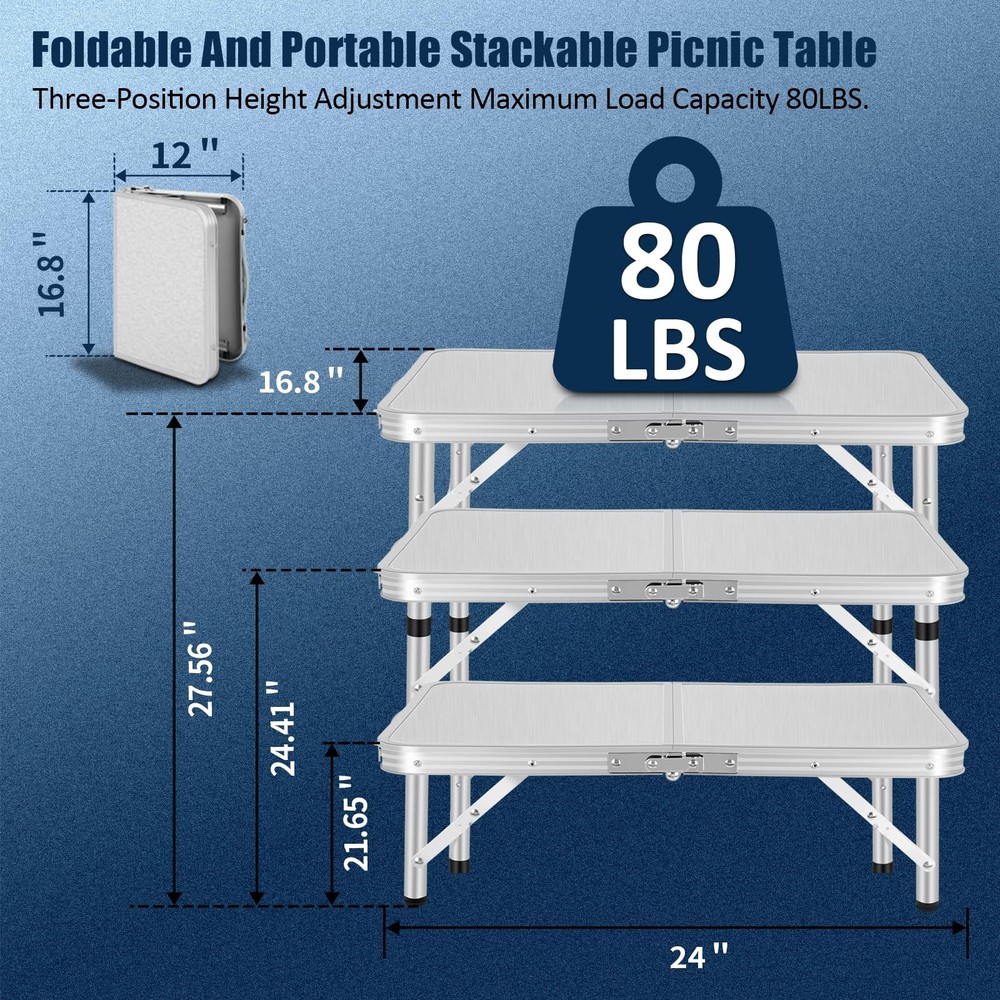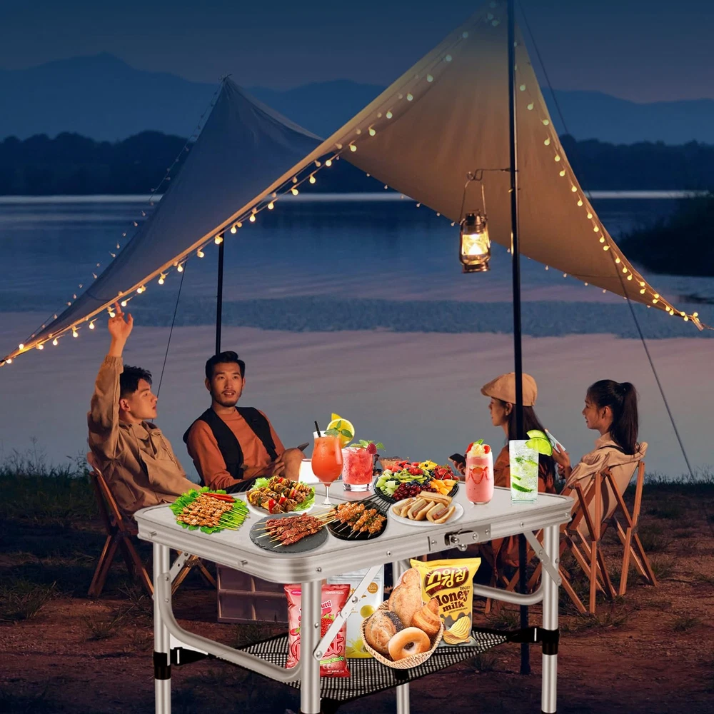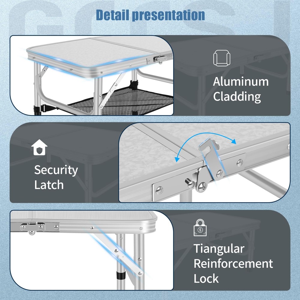 【Folding & Portable】:The Aluminum folding table can be set up and fold quickly without any tools. Quick to fold and take with the convenient carry handle,You can put it in the back of your car. Perfect for both outdoor and indoor occasions. 【Extra Storage Space】: An unique storage mesh that can be assembled underneath the aluminum folding table to Provide more space and hold more stuff for you. It's a great place to put books, phones, snacks. 【Adjustable Heights】:Our Folding Camping Table legs have 3 fixed length for the legs of the table with a height of 10, 19 and 24 inches,can be suitable for various need, provides more convenience for your life. 【Versatility】: Function as a picnic table, camping table, card table, end table and side table 【Good load-bearing】:Adjustment Maximum Load Capacity 80LBS.