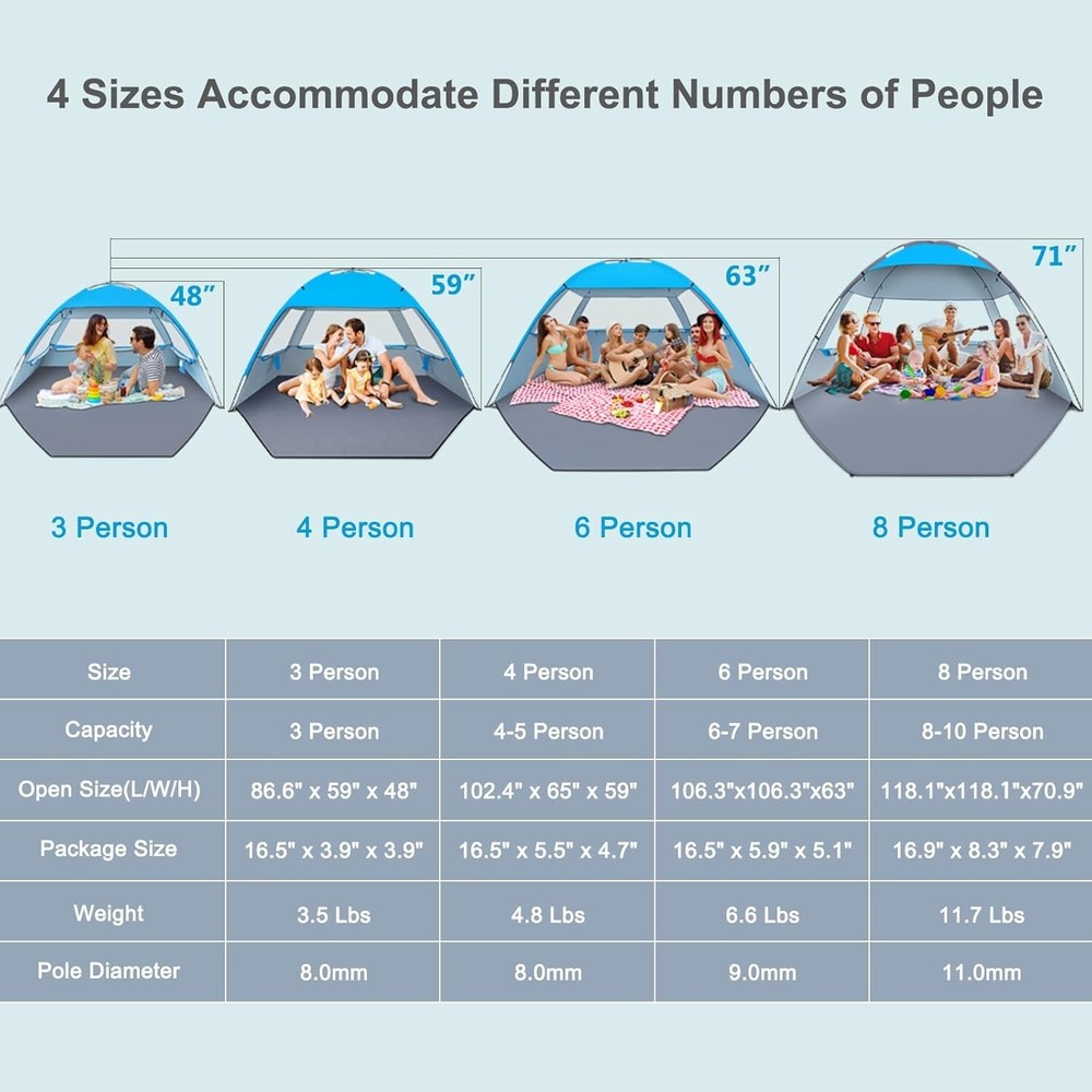 Lightweight Easy Setup Beach Canopy Tent for 3 with UV Protection - Blue < class="slides"> ‹ › ‹ › ‹ › ‹ › ‹ › ‹ › ‹ › ‹ › ‹ › Lightweight Easy Setup Beach Canopy Tent Color: Blue Super Large Space: <> Dimensions: 86.6"L x 59"W x 48"H 30% larger than competitors at a similar price Comfortably accommodates up to 3 people for a perfect beach outing Easy Set Up & Carry: <> Set up in minutes with intuitive design Folds down to travel size: 16.5"H x 3.9"L x 3.9"W Lightweight at just 3.5 lbs with a compact carrying bag, ensuring minimal bulk on your backpack Upgraded & Durable Design: <> Made with high-quality SILVER COATED Fabric for superior UV protection 8.0mm IMPORTED fiberglass frame for enhanced stability and durability, rust-free Maintains shape and support, ensuring long-lasting use Water Repellent & UPF 50+: <> 4-sided ventilation with 3 large mesh windows for optimal airflow Extended floor of 40 inches offers extra activity space Includes 3 curtains for added privacy Water-repellent fabric provides a temporary shelter against light rain Widely Use: <> Ideal for beach, park, lake outings, camping, hiking, and fishing Great for sporting events, music festivals, or relaxing at home Why choose our Lightweight Beach Canopy Tent? If you cherish outdoor moments with family and friends, our Lightweight Beach Canopy Tent is the perfect addition to your collection. Enjoy the extensive space and sun protection while reveling in the comfort of a well-ventilated environment. Our easy setup design allows for spontaneous adventures without the hassle! Step into the shade and elevate your outdoor experiences today - order your Lightweight Easy Setup Beach Canopy Tent! Shipping <> <> Free & Fast Shipping - We offer free shipping to most of the USA with a normal delivery time of 3-7 days. However, due to the current situation, additional delivery time (up to 3 weeks) may be required for some items. Alternative Carriers - We may use alternative carriers (e.g. USPS, FedEx, UPS, etc.) to ensure your package arrives safely and on time. Due to the use of multiple carriers, we are unable to provide a tracking number automatically. Handling Time - Orders are processed and shipped within 1-2 business days of receiving cleared payment. Shipping Restrictions - Shipping to Alaska, Hawaii, Puerto Rico, Guam, and other US territories may incur shipping charges or delivery restrictions. Please contact us before ordering, or your order can be refunded/cancelled. State Restrictions - There may be restrictions based on your state of purchase. For example, certain items may not be shipped to California due to state regulations. Contact for Tracking Updates - If you require tracking updates or have any concerns about the delivery of your order, please feel free to contact us, and we will be happy to assist you. Return <> <> 30-Day Hassle-Free Returns - We want you to be completely satisfied with your purchase. If you are not, you can return the item within 30 days of receiving it for a full refund or exchange. Easy Return Process - To start a return, simply contact us and we will provide you with a prepaid return shipping label and detailed instructions. Restocking Fee - There are no restocking fees for returns. However, the buyer is responsible for return shipping costs if the return is not due to a seller's error. Refund Processing Time - Refunds will be processed within 5 business days of receiving the returned item in its condition. Payment We accept all major credit cards, PayPal, and Apple Pay for your convenience. Your payment information is secure and encrypted to ensure a safe and seamless transaction. Please complete your payment within 3 days of purchase to avoid any delays in shipping. Feedback Your feedback is extremely important to us. We strive to provide the best products and customer service possible. If you are satisfied with your purchase, please take a moment to leave us a positive review. If you have any concerns or issues with your order, please contact us before leaving negative feedback. We are committed to resolving any problems and ensuring your satisfaction. Contact Us If you have any questions or concerns, please feel free to out to our customer support team. You can contact us through the eBay messaging system. We are available Monday to Friday, 9:00 am to 5:00 pm EST, and we will do our best to respond to your inquiry within 24 hours. Buy it now and enjoy a pleasant shopping experience! Features: Lightweight Type: Beach Tent Color: Blue Size: 3 Person