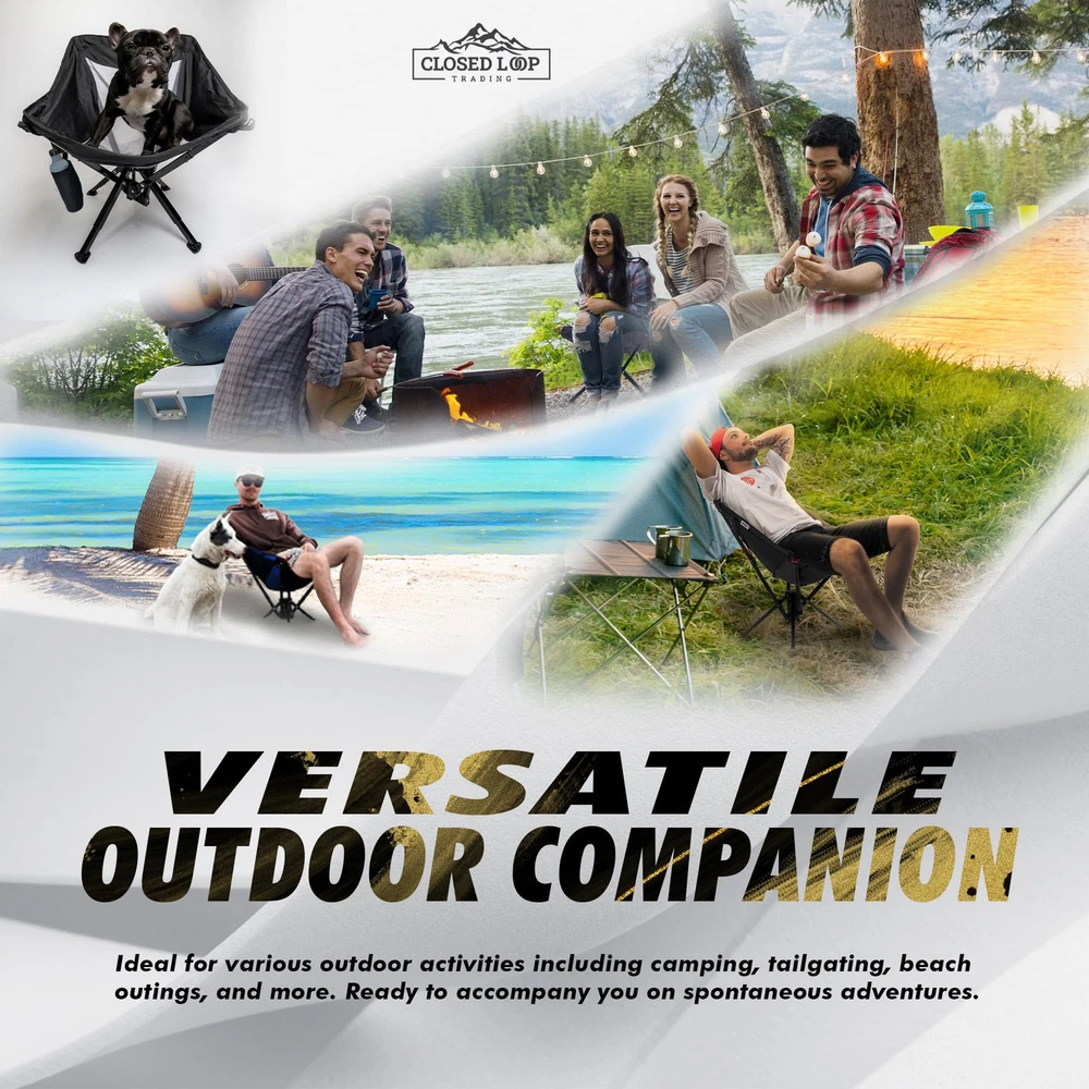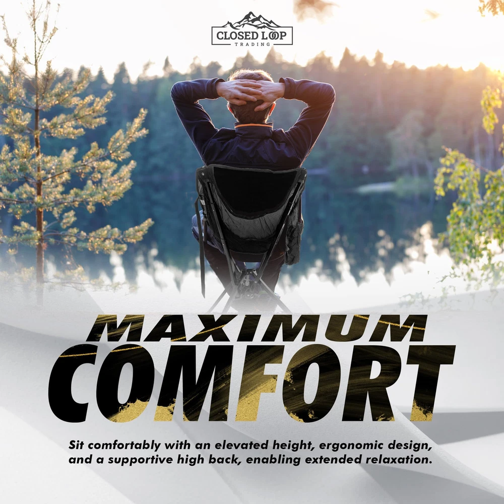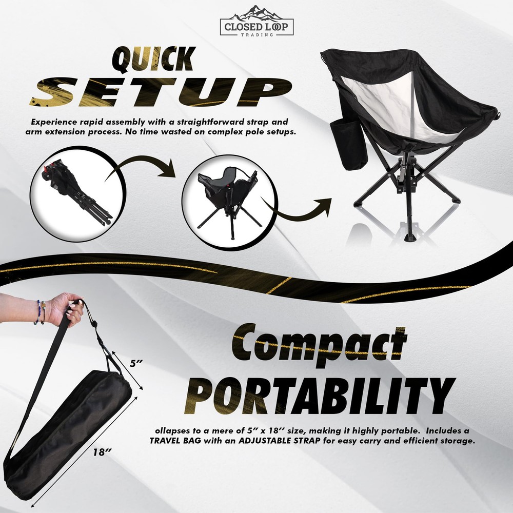 PORTABLE & COMPACT - Quickly collapses to compact size of 5” x 18’’. Our lightweight folding chair comes with a packable storage carry bag, and adjustable strap for easy travel. Keep in your car trunk ready for any and all adventures! QUICK & EASY SETUP - No assembly required! Effortlessly set up your outdoor folding chair to FULL SIZE in just seconds! Just undo the strap and extend the arms – no poles, no hassle. EXTREMELY COMFORTABLE: Get comfy anywhere with our folding chair! Provides a full 17” off the ground, offering optimal leg comfort and a high back. Get in and out with ease. VERSATILE OUTDOOR ESSENTIAL: Your ultimate go anywhere chair! Whether relaxing outside on your lawn or cheering at field sporting events, our portable folding chair excels! Quick setup, compact design - perfect for camping, fishing, tailgating, beach days, and open air festivals. ROBUST STABILITY: Designed for heavy duty use outdoors - our folding chair is a sturdy and stable choice! Solid base construction ensures no tipping, perfect for both adults and kids alike, supporting up to 265 lbs. Ideal for heavy duty situations, yet easily portable.