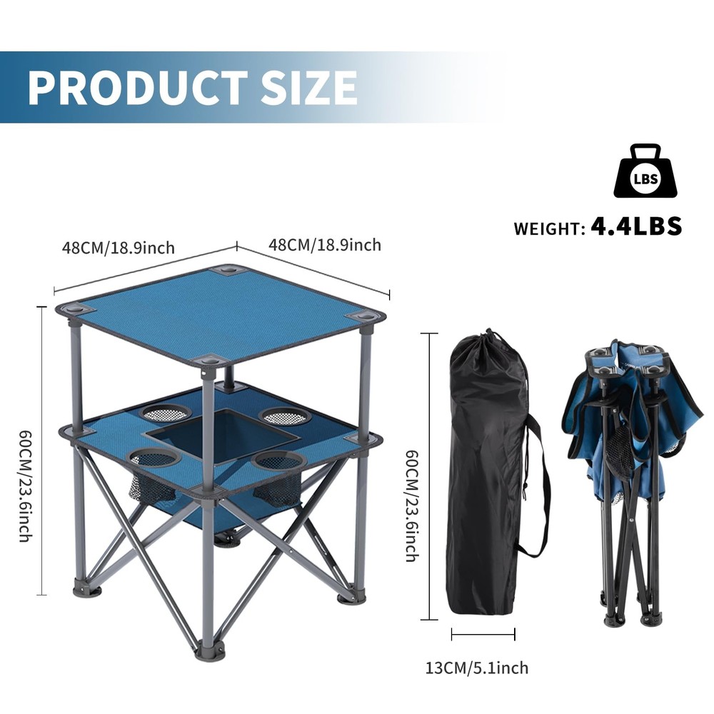 Folding Camping Table Portable Outdoor Camp Side Table Lightweight Square Picnic Table with Built-in 4 Cup Holders and Food Basket and Travel Bag for Barbeque Picnic Camping and Tailgate 【Indispensable Equipment】Camping table provides a place to drop your stuff when you tired——After a long hard day trekking you need a table that can take what you throw at it or enjoy a meal. 【Great Quality】Made with heavy-duty washable 600 denier canvas with sturdy metal frame. A unique safety buckle design ensures that the table top is tight and flat when unfolded, which can hold up to 35 pounds and will withstand anything you throw at it. Resists the elements with rust-proof legs and non-slip rubber leg caps so it stays stable in any terrain. 【Convenient Capacity】The second floor of this table has 4 cup holders at each corner, which securely hold your drinks and prevent spills. A large snack holder in the middle for a bowl of popcorn, chips, dip or other snacks, keys, etc, which makes snacking during outdoor activities easier and cleaner. At the top level of the table, there is another tier for extra space to hold food and games. Offers enough seating room for 4-6 people. 【Table in Bag】Unfolding size: 19''(L)*19''(W)*24''(H), but the package size is only 5.5''(L)*5.5''(W)*23''(H) and only weight 4.4lb. This patio table is portable and lightweight, comes with a compact carrying bag, and can easily to carried as a shoulder bag, which allows you to head outdoors and go further for longer ! 【Multi-Functional】 Foldable square canvas table is can not only be used indoors but also be used for camping, fishing, hiking, beach, picnic, BBQ, cooking and dining. In addition, you can also use this multifunctional folding table to put your laptop, play board games, or even serve as a bedside table. If you are not satisfied with the folding table for any reason, please feel free to contact us. 【Indispensable Equipment】Camping table provides a place to drop your stuff when you are tired——After a long hard day trekking you need a table that can take what you throw at it or enjoy a meal. In comes the folding table that combines unsurpassed beauty, mobility, and practicality without compromising its integrity! 【Great Quality】Our camp table is made with heavy-duty washable 600 denier canvas with a sturdy metal frame. The tabletop is tight and flat when unfolded, which can hold up to 35 pounds, and will withstand anything you throw at it. Resists the elements with rust-proof legs and non-slip rubber leg caps so it stays stable in any terrain. 【Convenient Capacity】The second floor of this table has 4 cup holders at each corner, which securely hold your drinks and prevent spills. A large snack holder in the middle for a bowl of popcorn, chips, dip or other snacks, keys, etc, which makes snacking during outdoor activities easier and cleaner. At the top level of the table, there is another tier for extra space to hold food and games. Offers enough seating room for 4-6 people. 【No Need to Install】Unfolding size: 19''(L)*19''(W)*24''(H), but the package size is only 5.5''(L)*5.5''(W)*23''(H) and only weight 4.4lb. This patio table is portable and lightweight, comes with a compact carrying bag and you can easily carry it as a shoulder bag, which allows you to head outdoors and go further for longer! 【Multi-Functional】 Foldable square canvas table can not only be used indoors but also for camping, fishing, hiking, beach, picnic, BBQ, cooking, and dining. In addition, you can also use this multifunctional folding table to put your laptop, play board games, or even serve as a bedside table. A switch lock makes the small table only take 1 second to fold up and no need to install, providing great convenience for your life.
