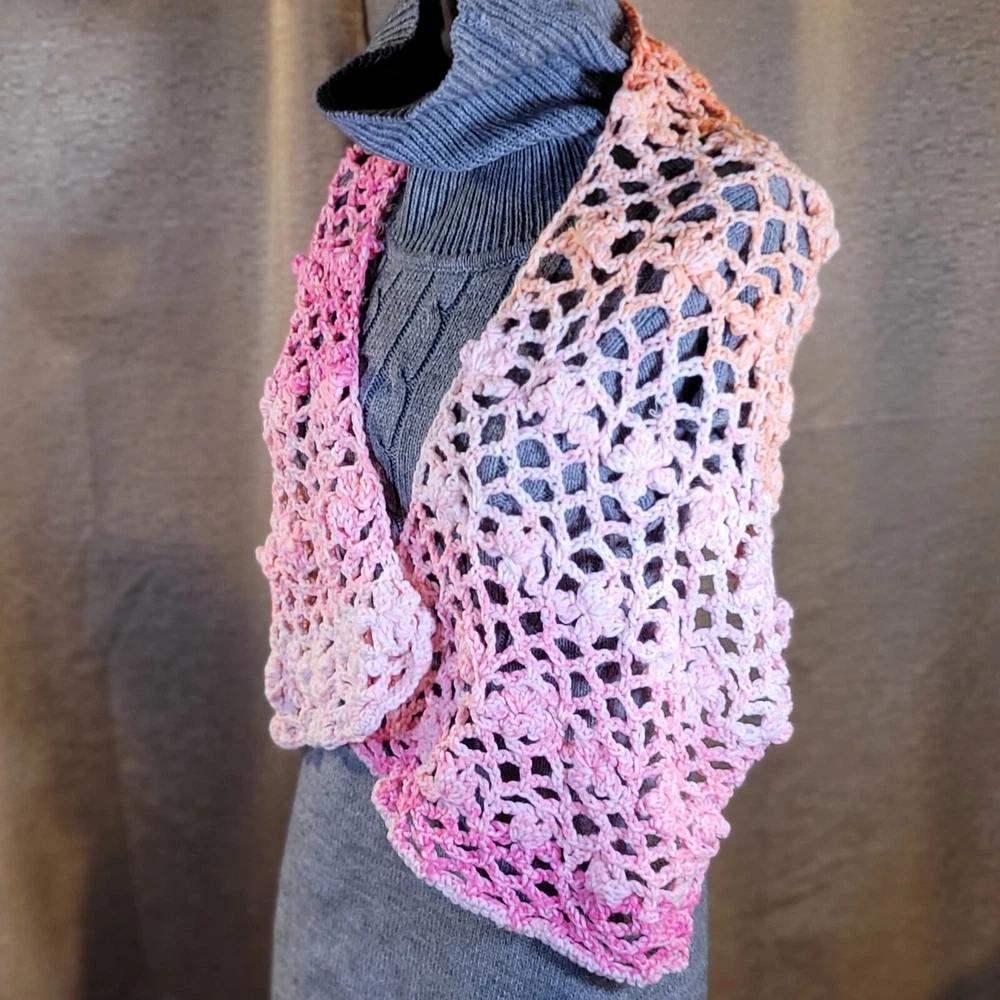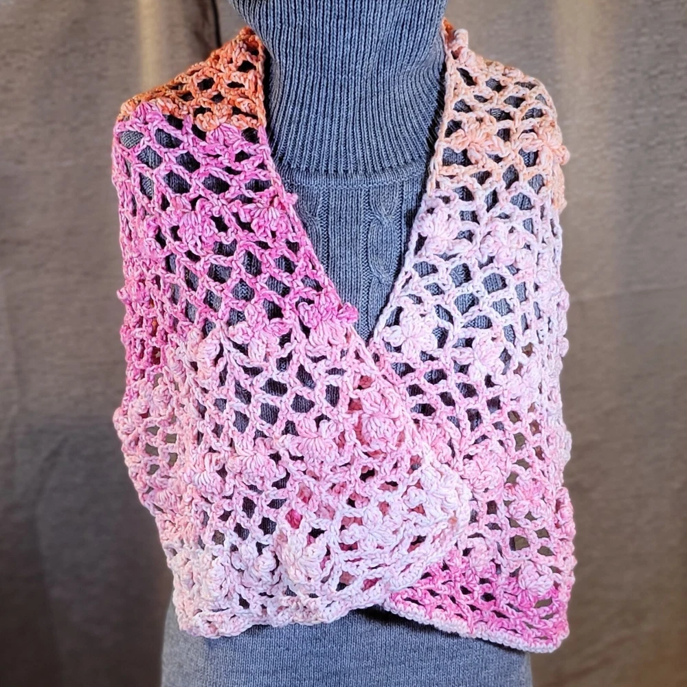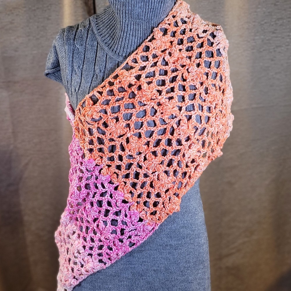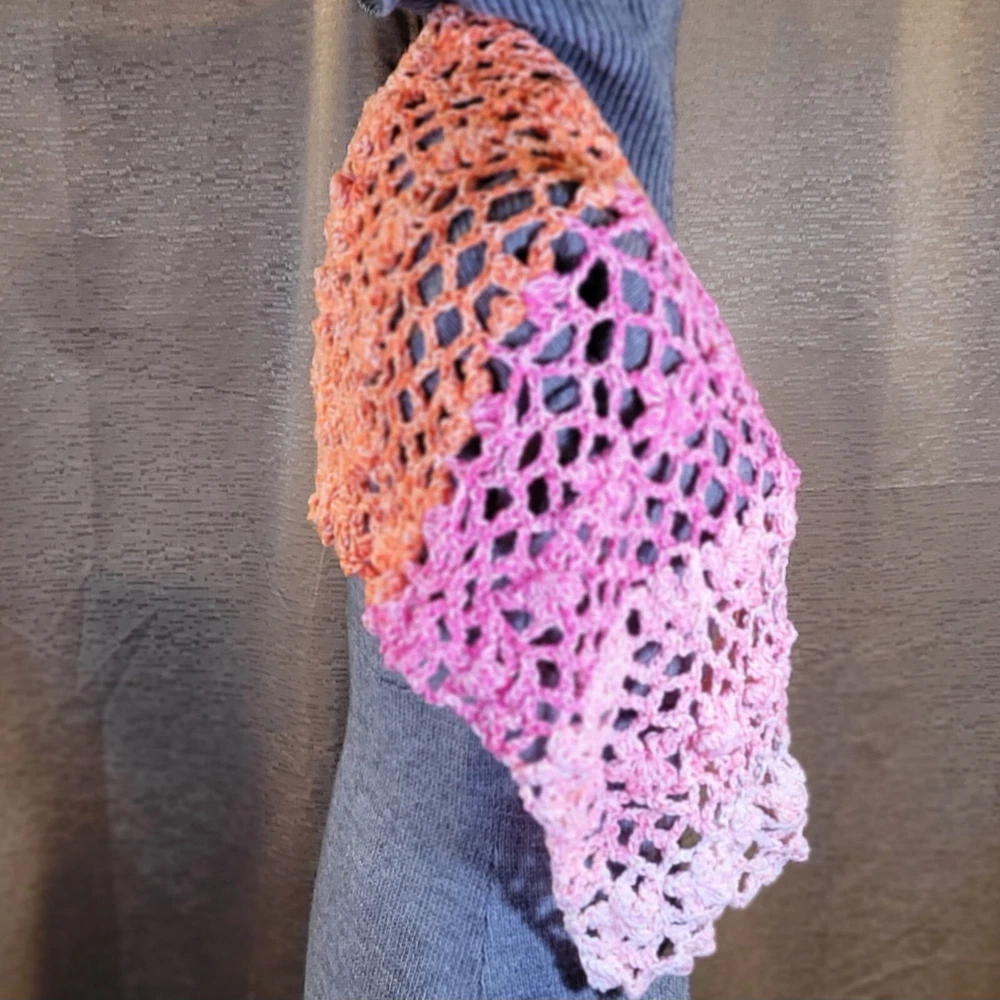 This airy scarf is also the perfect wrap or pool side sarong! Handmade crochet in a large-scale flower and mesh lace pattern, this piece is crafted from variegated pink-orange-white acrylic blend yarn. This Scarf measures about 17 inches wide by about 53 inches long (over 1 foot by over 4 feet). Lightweight for year-round use- winter scarf, summer wrap, anytime wardrobe accessory! Ready-to-Ship, Free USPS Ground Advantage. International & Expedited shipping are available; please contact me to arrange (buyer pays in full). Due to the handcrafted, 1-of-a-kind, “imperfectly unique” nature of this item, all sales are final & returns are not accepted. Confirm sizes & color prior to placing order; feel free to contact me if you have questions! 15% of purchases of $15 or more - just add to your cart! Thank you for looking!