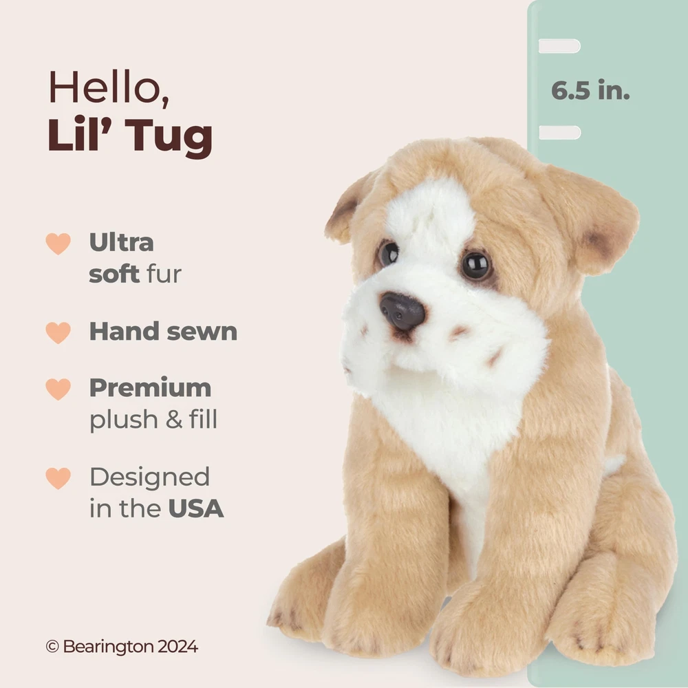 You will love the fine detail award winning uses to bring Lil' Tug, the Bulldog, to life. Hand crafted using the most luxurious, soft plush and with hand airbrushed detail, this Bulldog is perfect for everyone from the collector to a special child in your life. Soft and huggable, Lil' Tug will make the perfect companion. Founded in 1997, Bearington is the proud recipient of more distinguished design awards than any other teddy bear company. Over the years, Bearington has received more than 100 industry design awards and nominations which include: 1 Canadian Collectible of the Year Award, 2 NALED Plush of the Year Nominations, 2 CIB Collector’s Choice Awards, and several TOBY Industry Choice Awards, TOBY Public Choice Awards, and Golden Teddy Awards and Nominations. MEET LIL' TUG THE BULLDOG: This 6.5-inch Bulldog plush is a cuddly stuffed dog your child will adore. Its fluffy and cute design makes it the perfect playmate for babies and kids. This adorable dog plush is every little one's dream companion. CUDDLY: Experience our Bulldog stuffed animal, a premium plush puppy packed with sheer craftsmanship. Its soft fur radiates a familiar warmth, inviting hugs and cuddles. Excellently crafted and ever so endearing, our bulldog plush embodies an adorable playmate, enticing both tenderness and joy. SPECIAL GIFT: Our American bulldog stuffed animal is a delightful childhood companion. Meticulously crafted, the stuffed Bulldog captures lifelike details, making it an enduring object of affection. An ideal gift to be cherished for years, the English Bulldog plush epitomizes love and companionship. BEARINGTON QUALITY: Bearington is synonymous with global excellence in plush toys. Our renowned brand is celebrated for opulent fabrics, unparalleled craftsmanship, and uniquely designed stuffed puppy and dog plushies. Elevate festivities with Bearington's holiday stuffed animals, embodying custom luxury and utmost quality. AWARD-WINNING TOYS: Bearington's legacy spans 25 years of crafting award-winning stuffed toys. Our collection ranges from timeless teddy bears to lifelike dog plushies, feline companions, and holiday stuffed animals. For every age, our creations bring joy and comfort.
