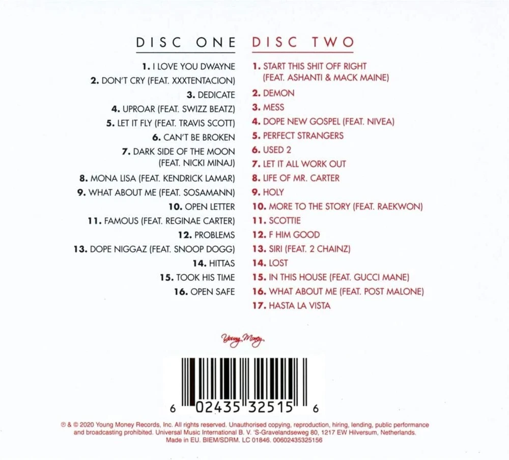 Record Label: Universal Format: CD Title: Tha Carter V -Deluxe- UPC: 0602435325156 gtin13: 0602435325156 Release Title: Tha Carter V -Deluxe- Type: CDs & Vinyl No Of Discs: 2 EAN: 0602435325156 Artist: Lil Wayne
